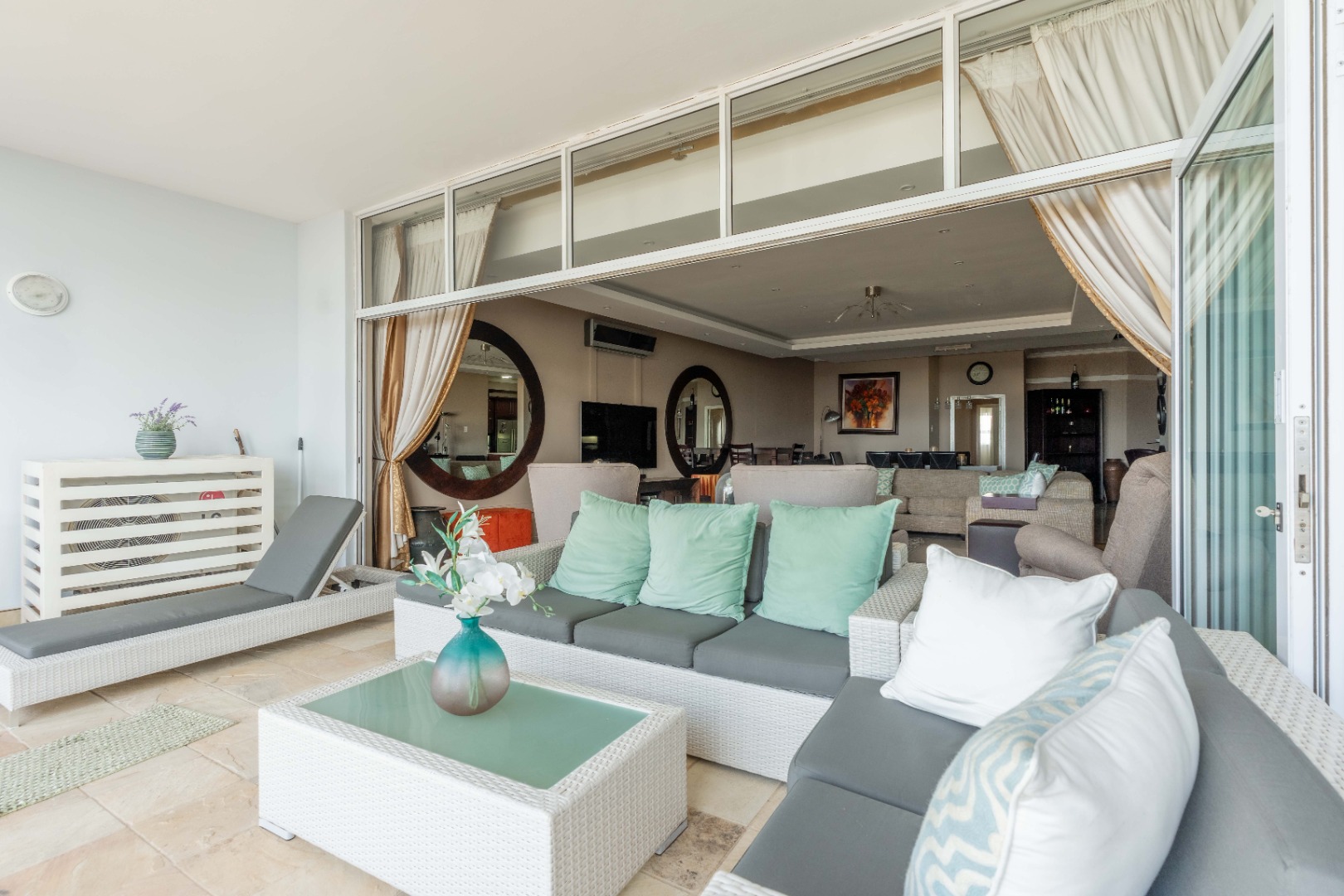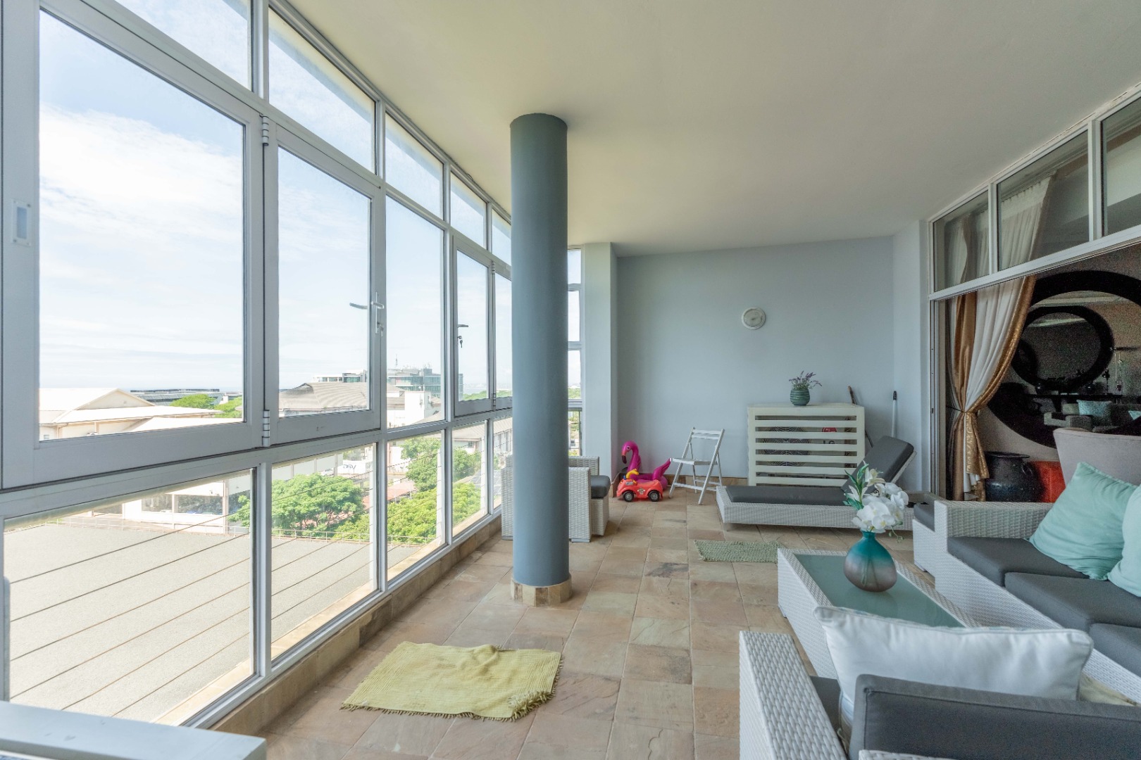 - Expansive glass-enclosed balcony offering breathtaking sea glimpses, creating an idyllic space for morning coffee or evening relaxation.