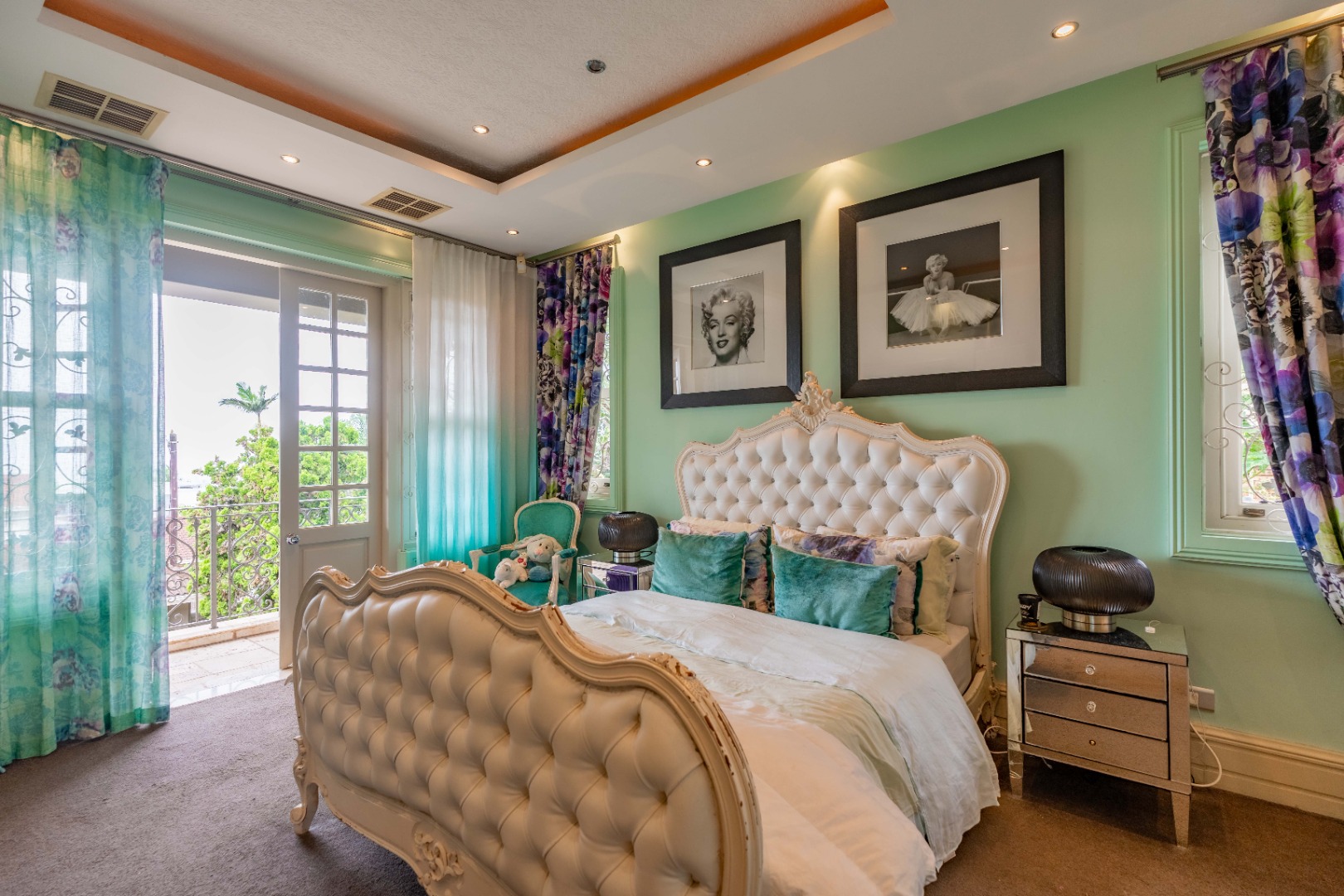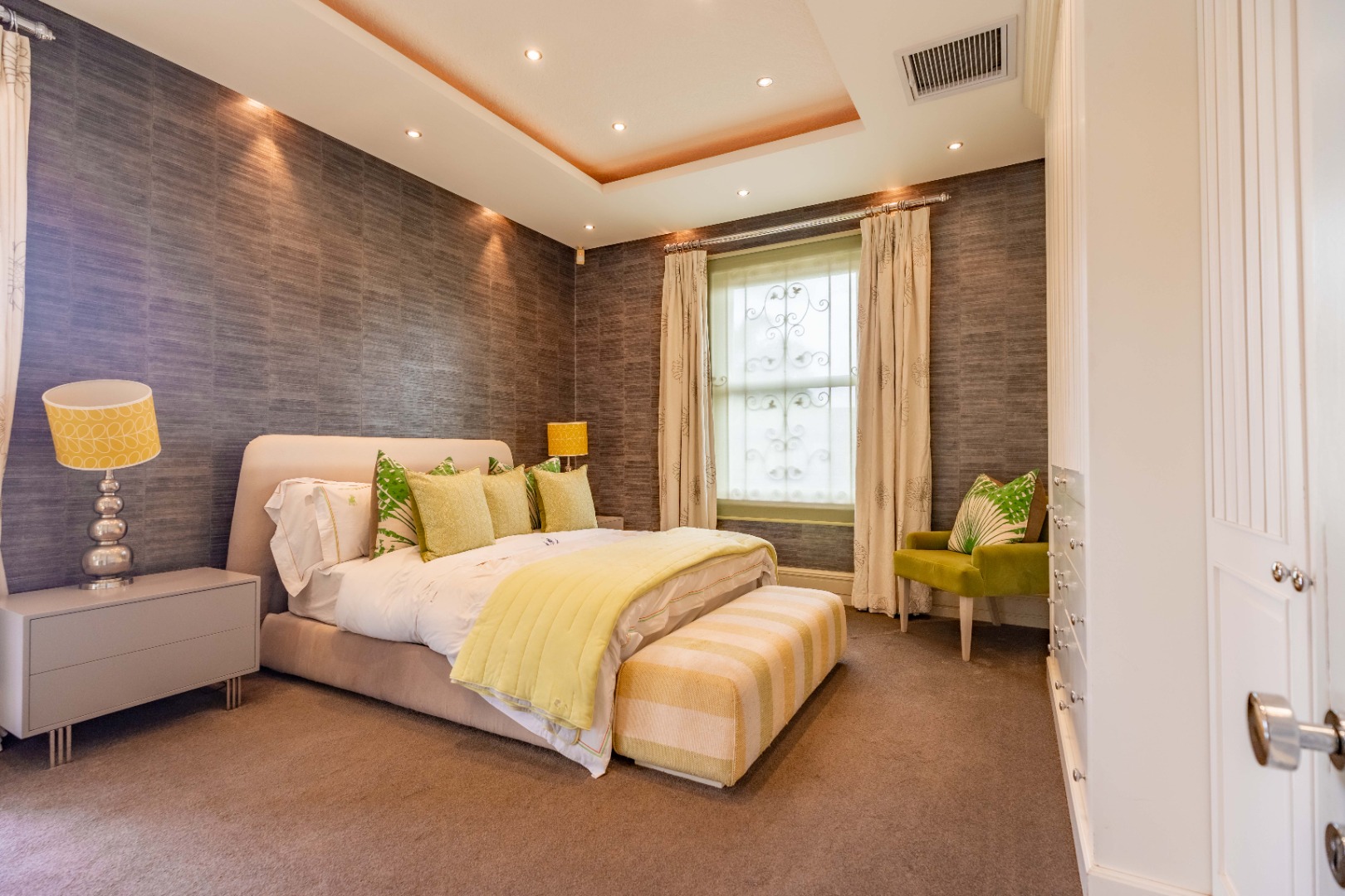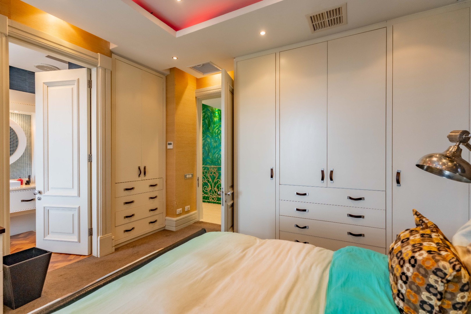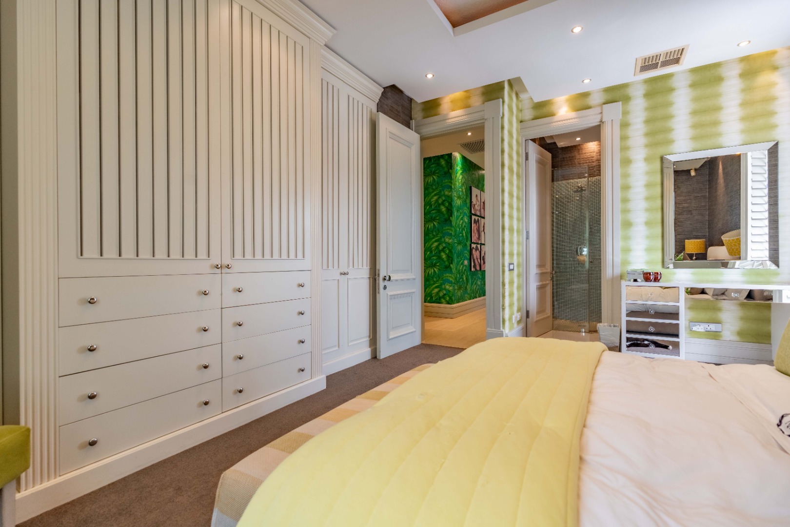 The bedroom on the upper level consists of 4 luxurious bedrooms of generous proportions, all en-suite. The stylish master suite with a walk-in dressing room and bespoke, en-suite bathroom, leads onto a private balcony with views of the ocean.