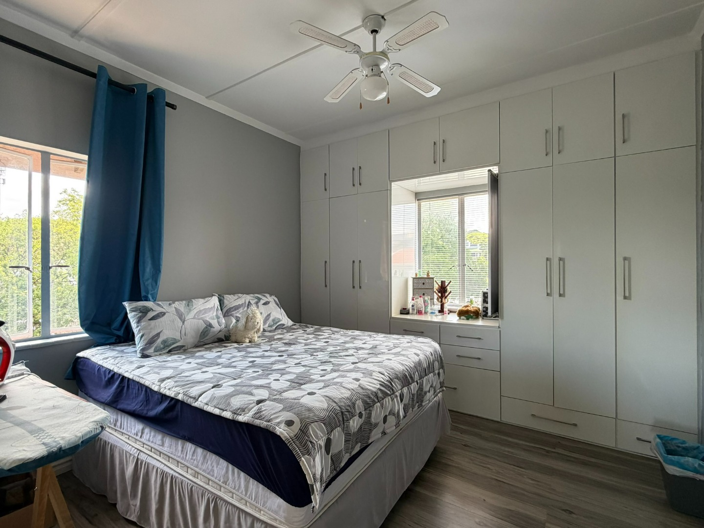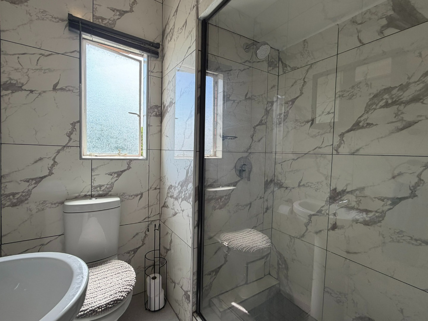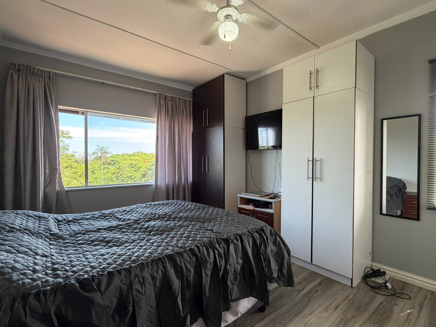 The unit offers two generously sized bedrooms with built-in cupboards and ample natural light. Both bedrooms are fitted with laminate flooring, while the lounge and bathrooms are fully tiled. The modern bathroom includes a shower and basin, complemented by a separate guest toilet.