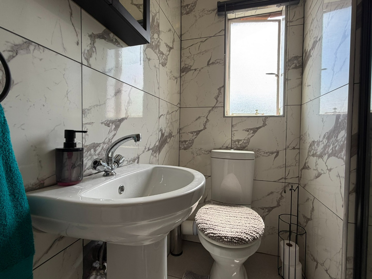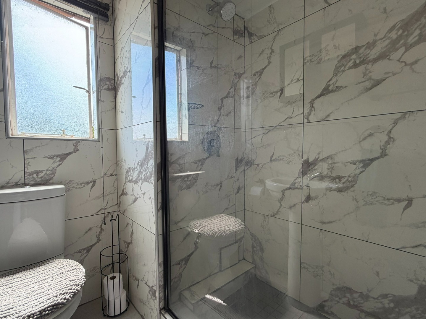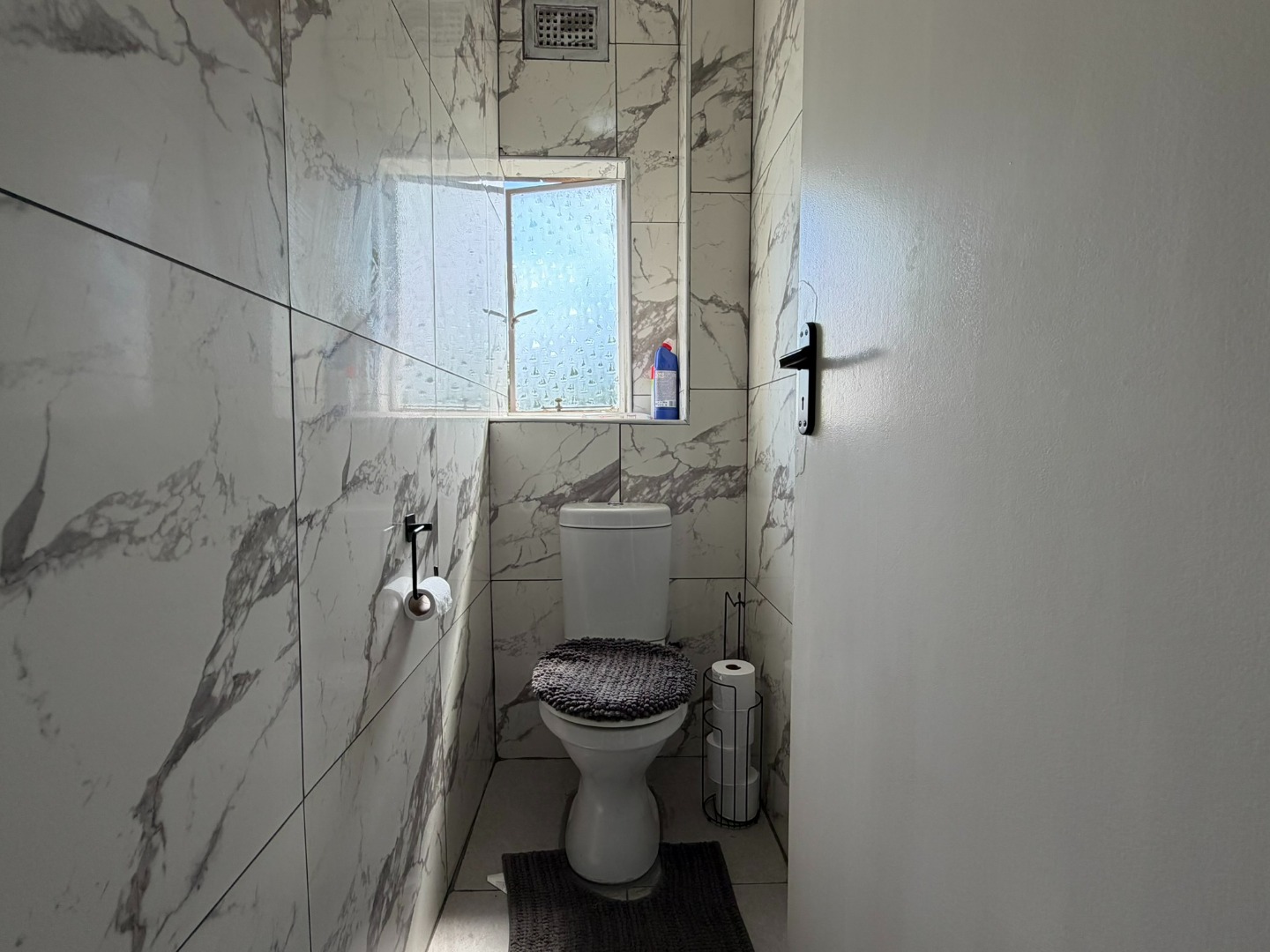 The unit offers two generously sized bedrooms with built-in cupboards and ample natural light. Both bedrooms are fitted with laminate flooring, while the lounge and bathrooms are fully tiled. The modern bathroom includes a shower and basin, complemented by a separate guest toilet.