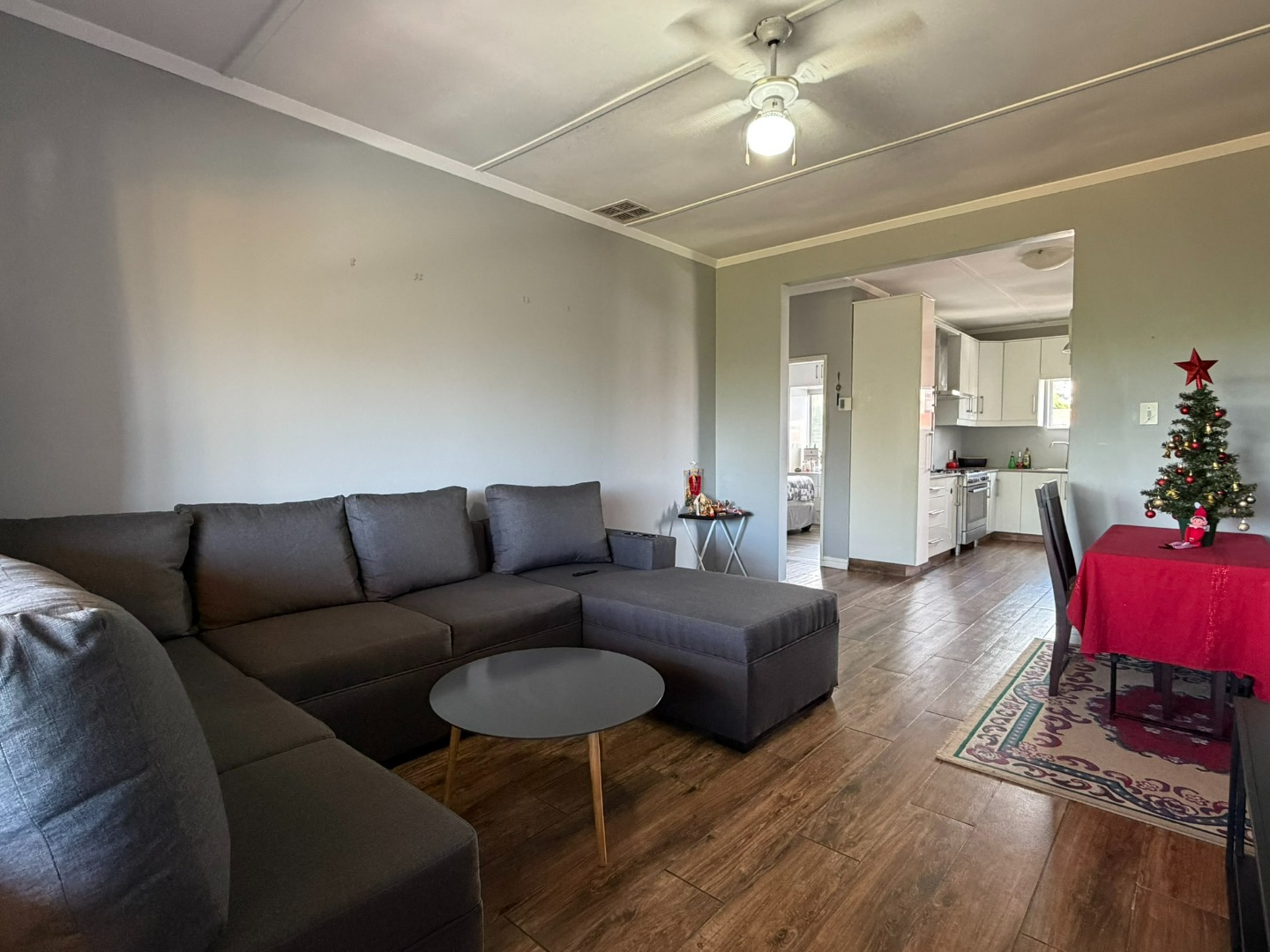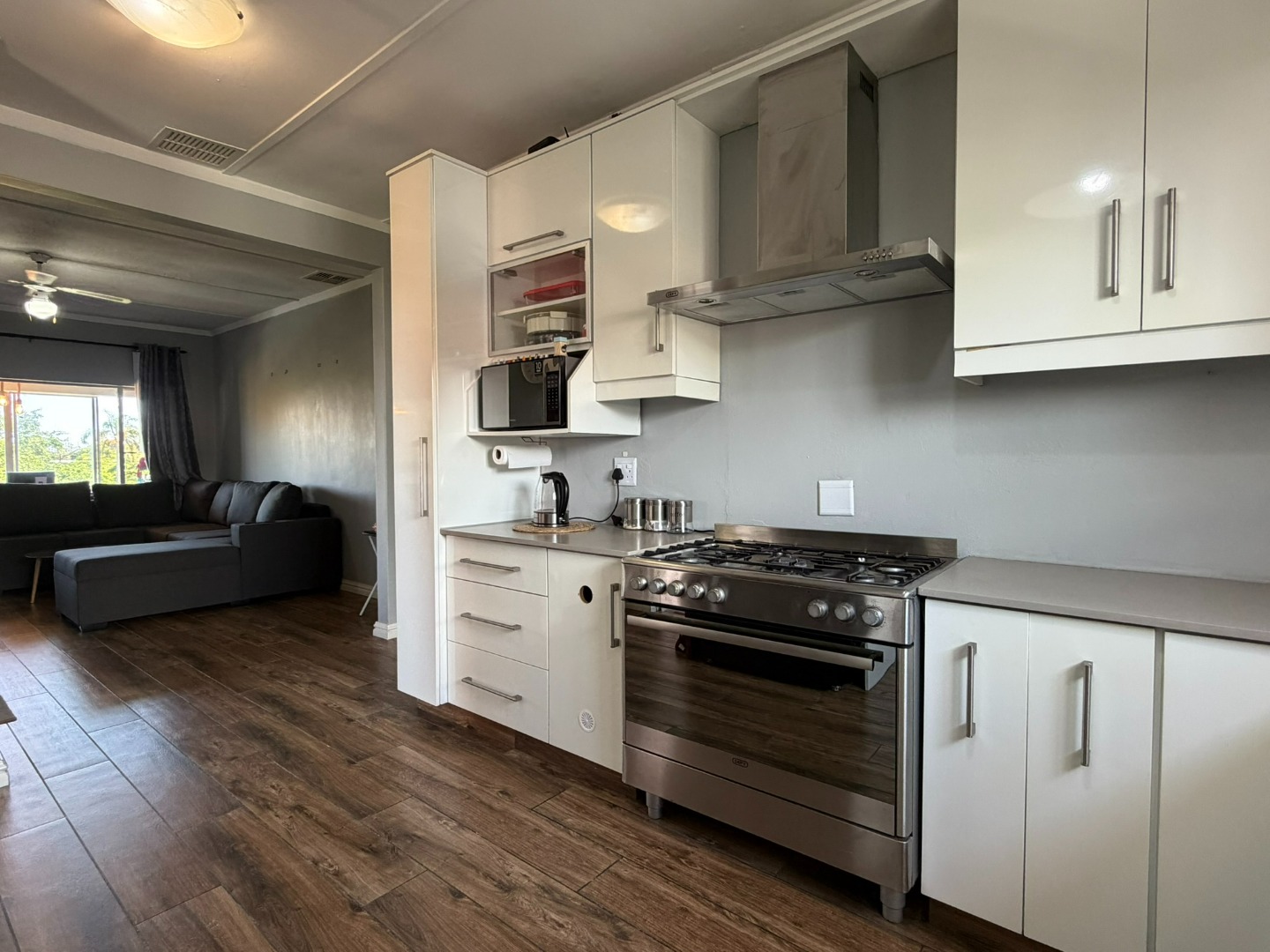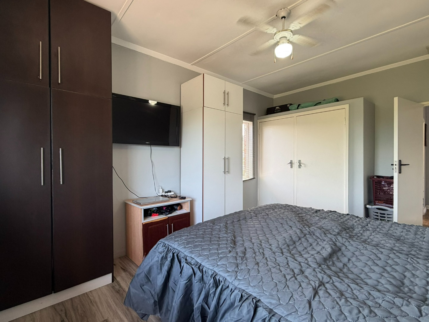 Spacious two-bedroom unit situated on the top floor, featuring a modern open-plan kitchen with built-in cupboards, Caesarstone countertops, a gas stove, and plumbing for a washing machine. The kitchen flows into a comfortable lounge and dining area, which leads onto a half balcony—ideal for a work-from-home office or a kids’ play area.