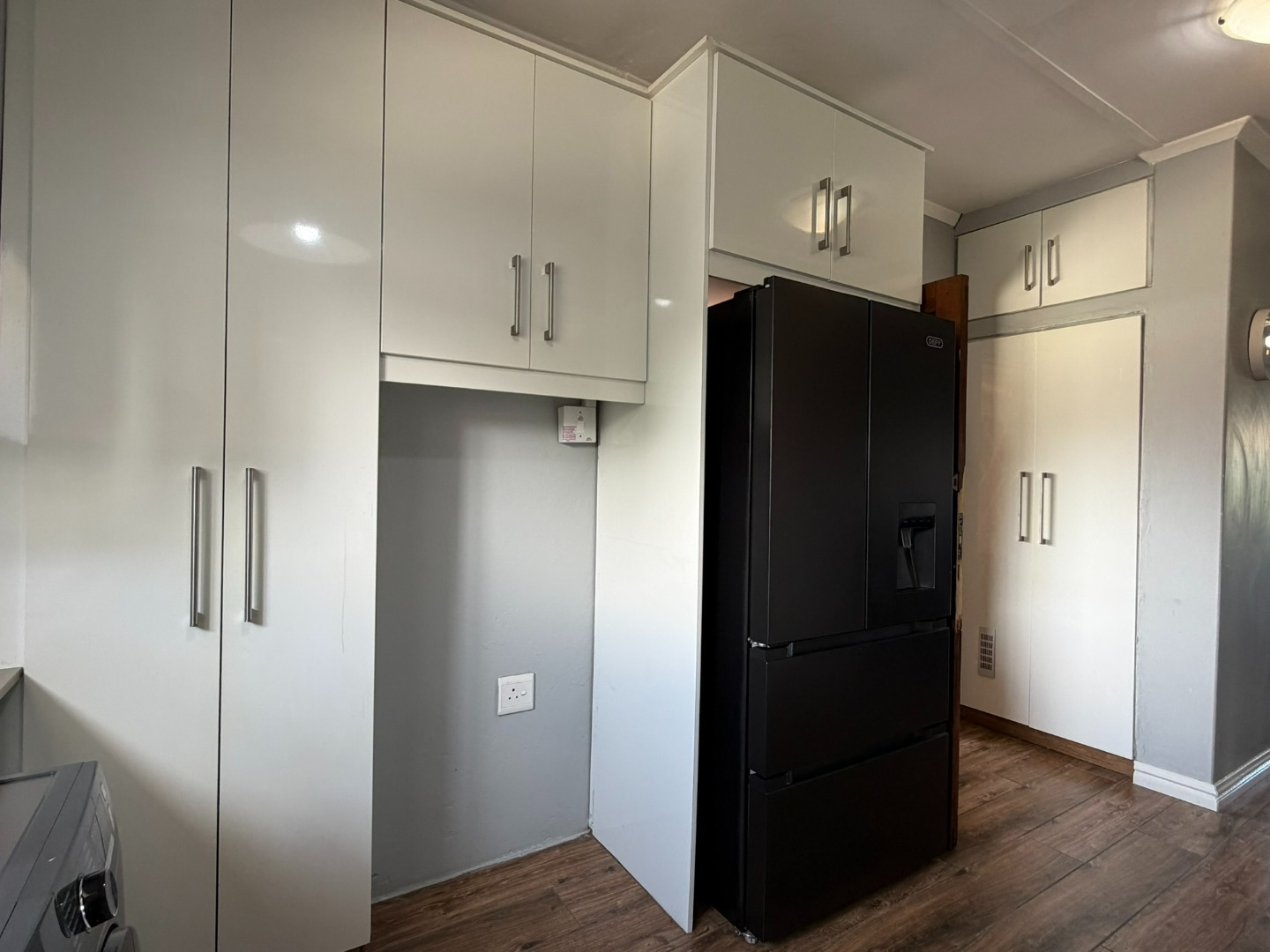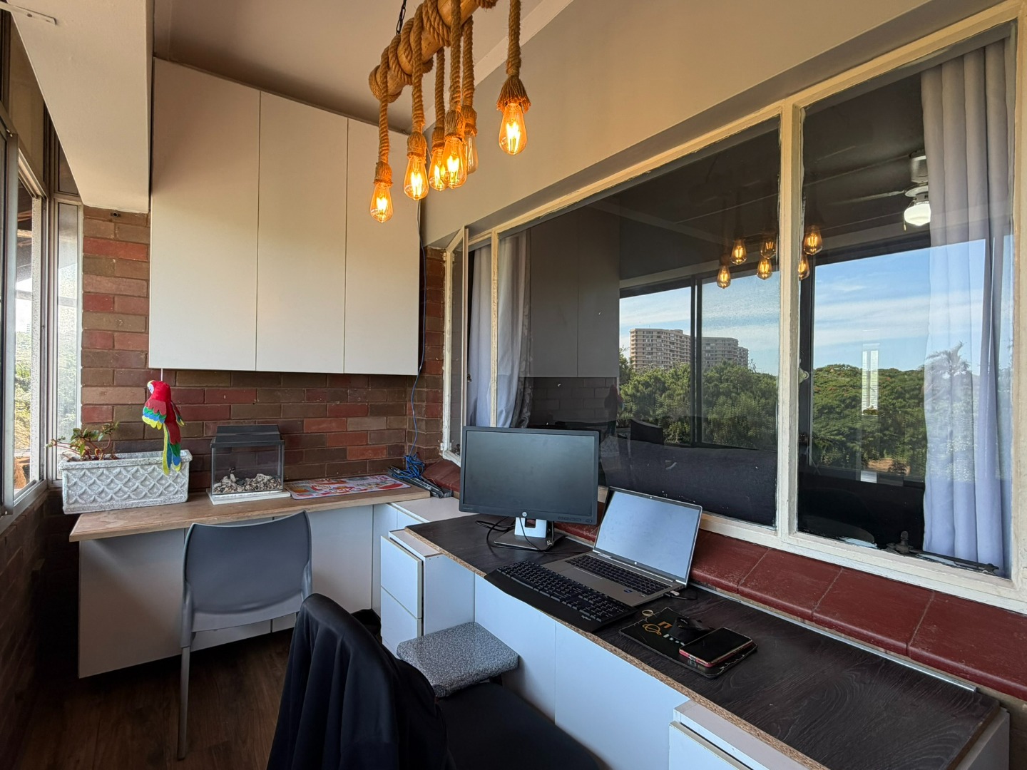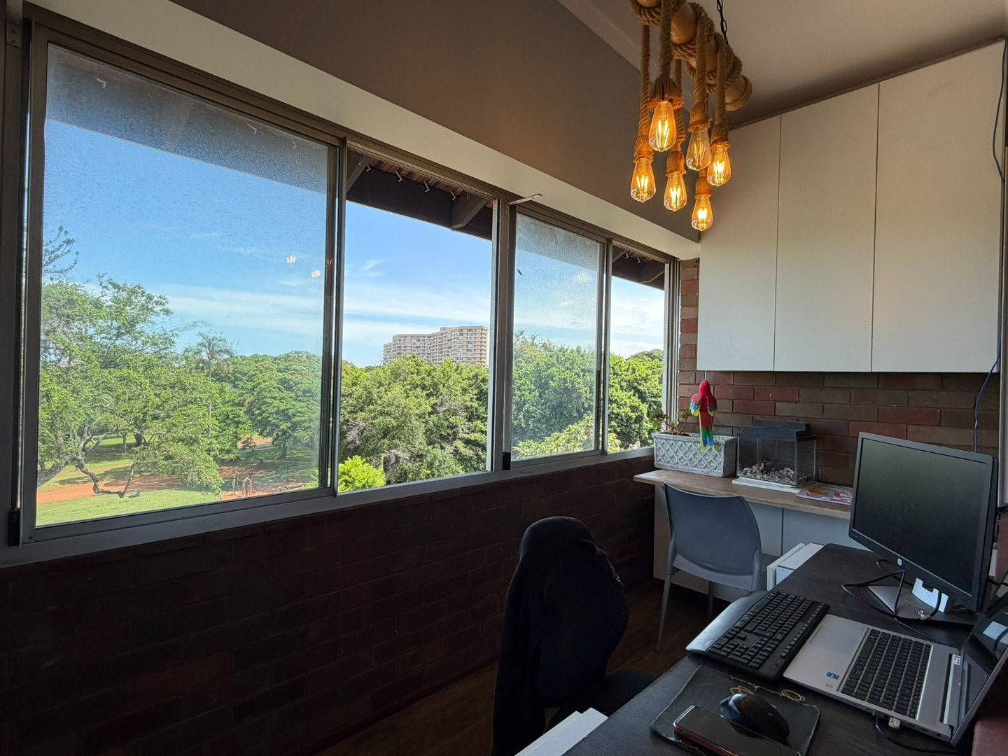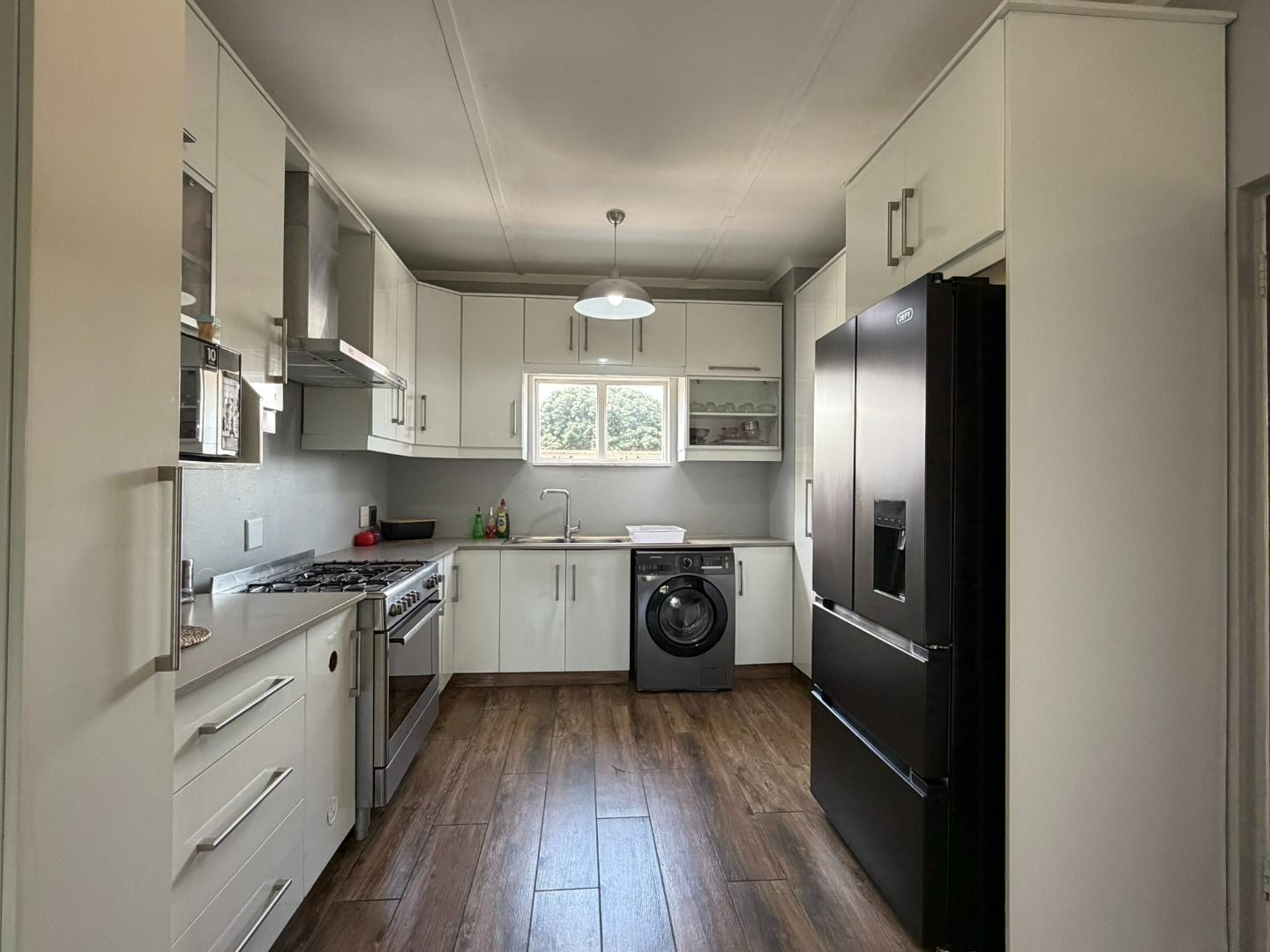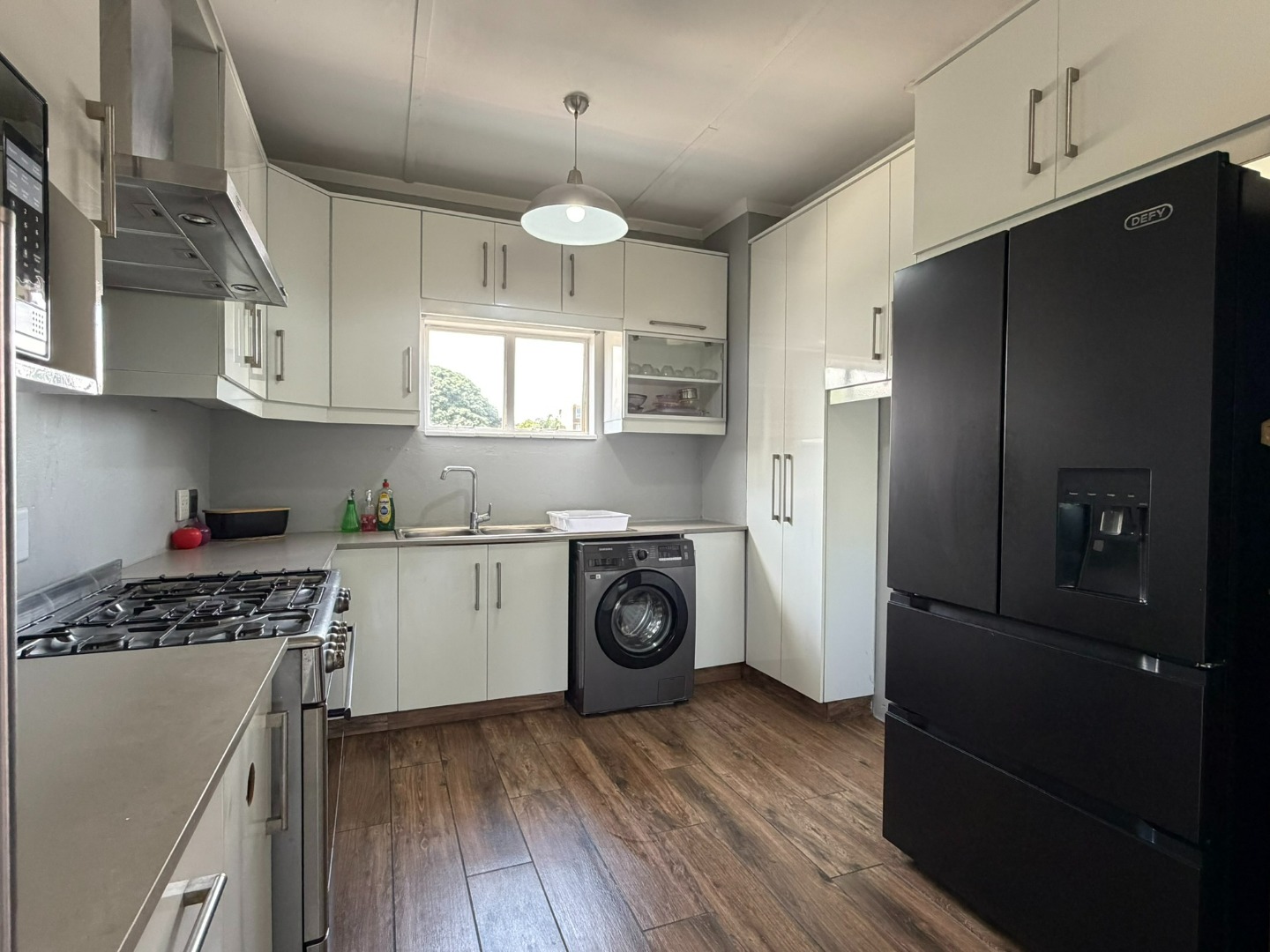 Spacious two-bedroom unit situated on the top floor, featuring a modern open-plan kitchen with built-in cupboards, Caesarstone countertops, a gas stove, and plumbing for a washing machine. The kitchen flows into a comfortable lounge and dining area, which leads onto a half balcony—ideal for a work-from-home office or a kids’ play area.