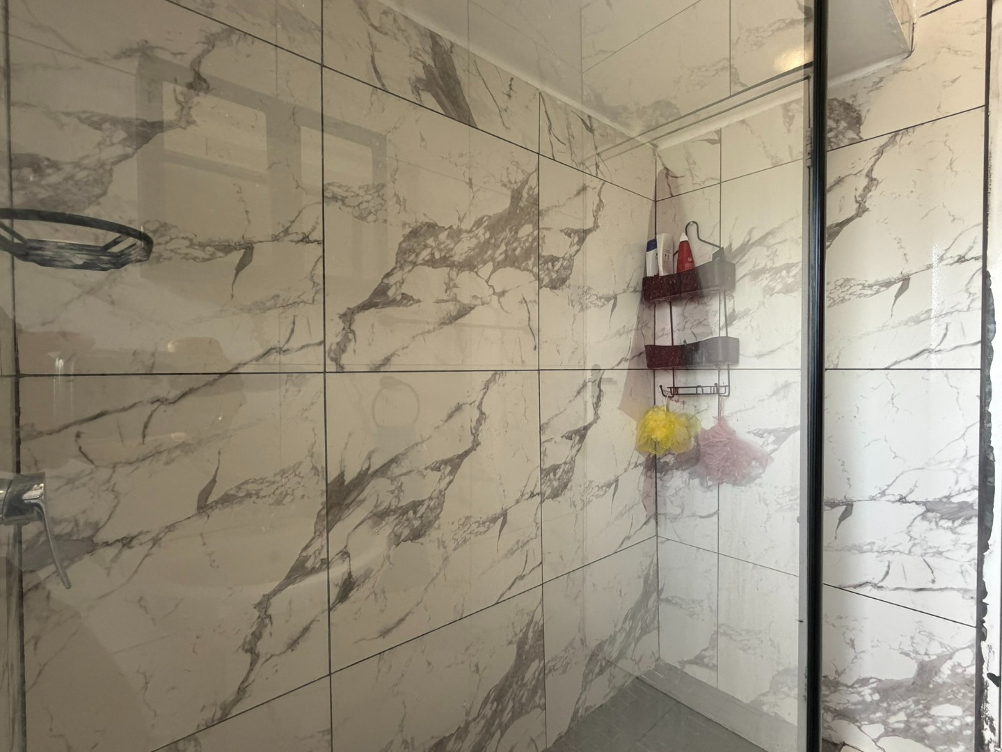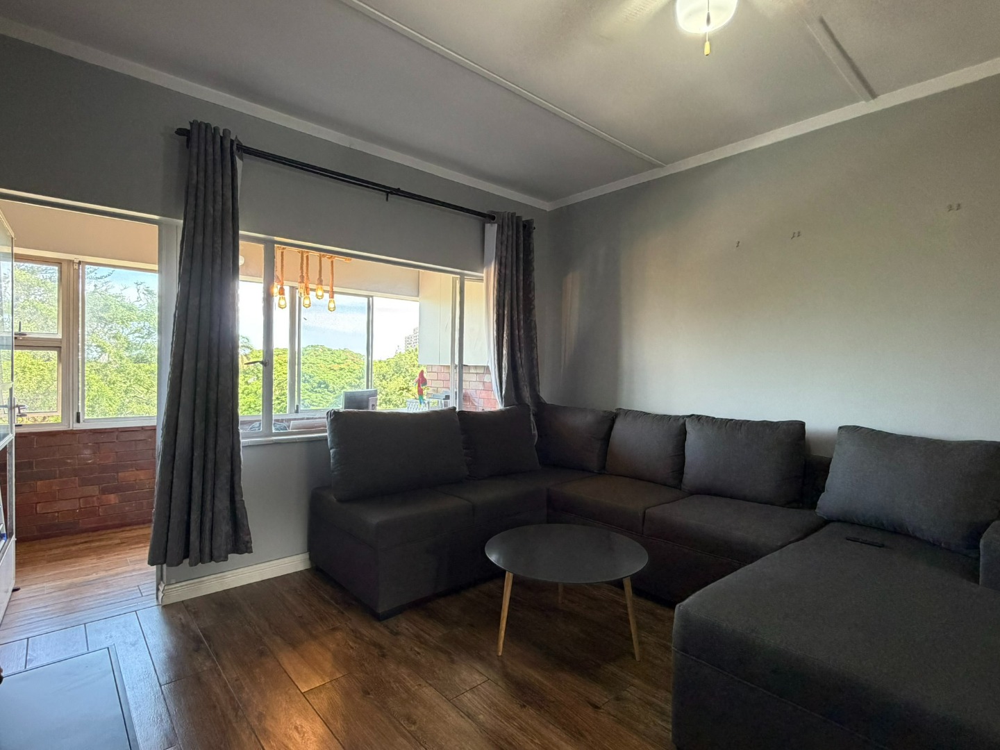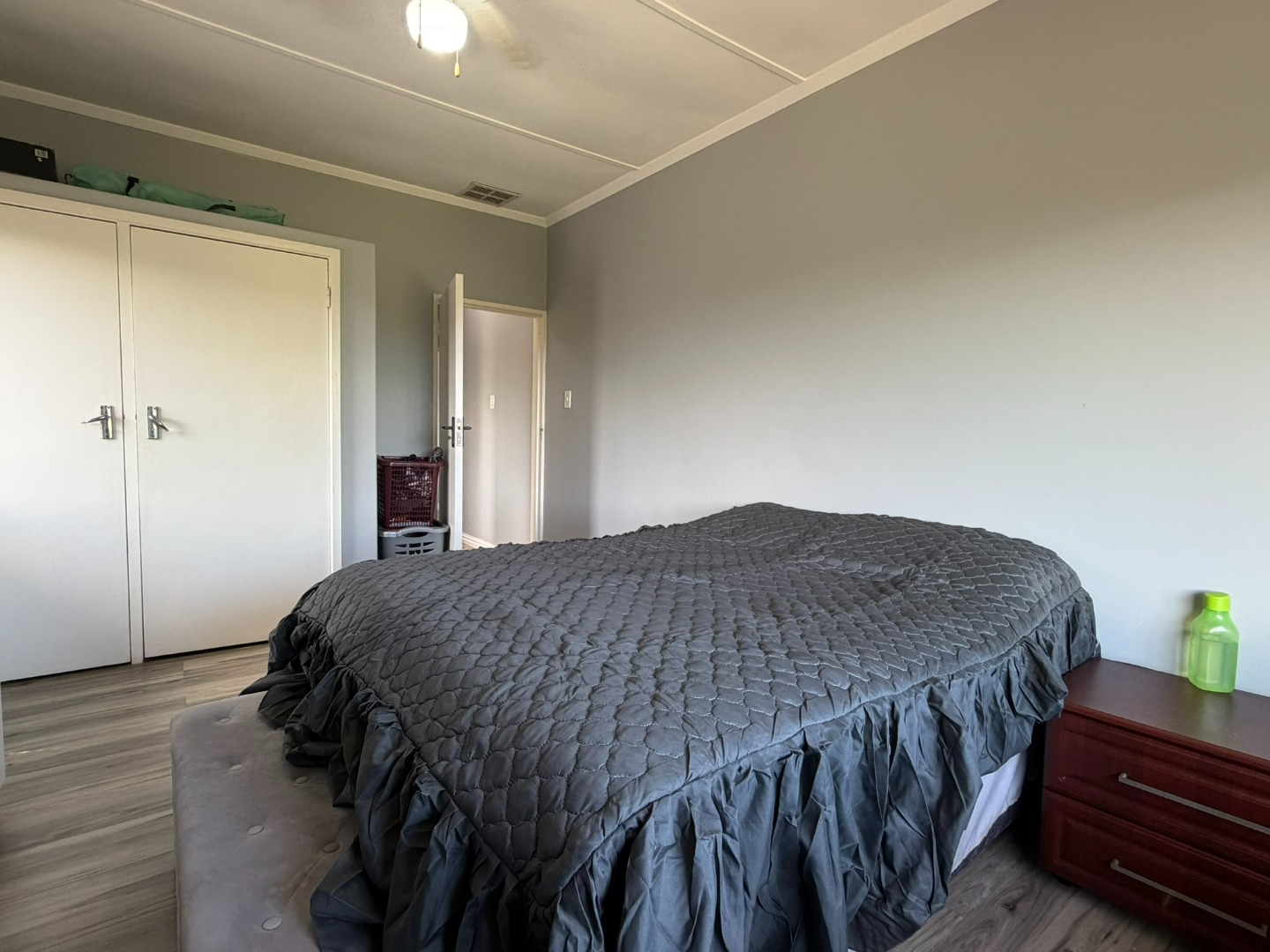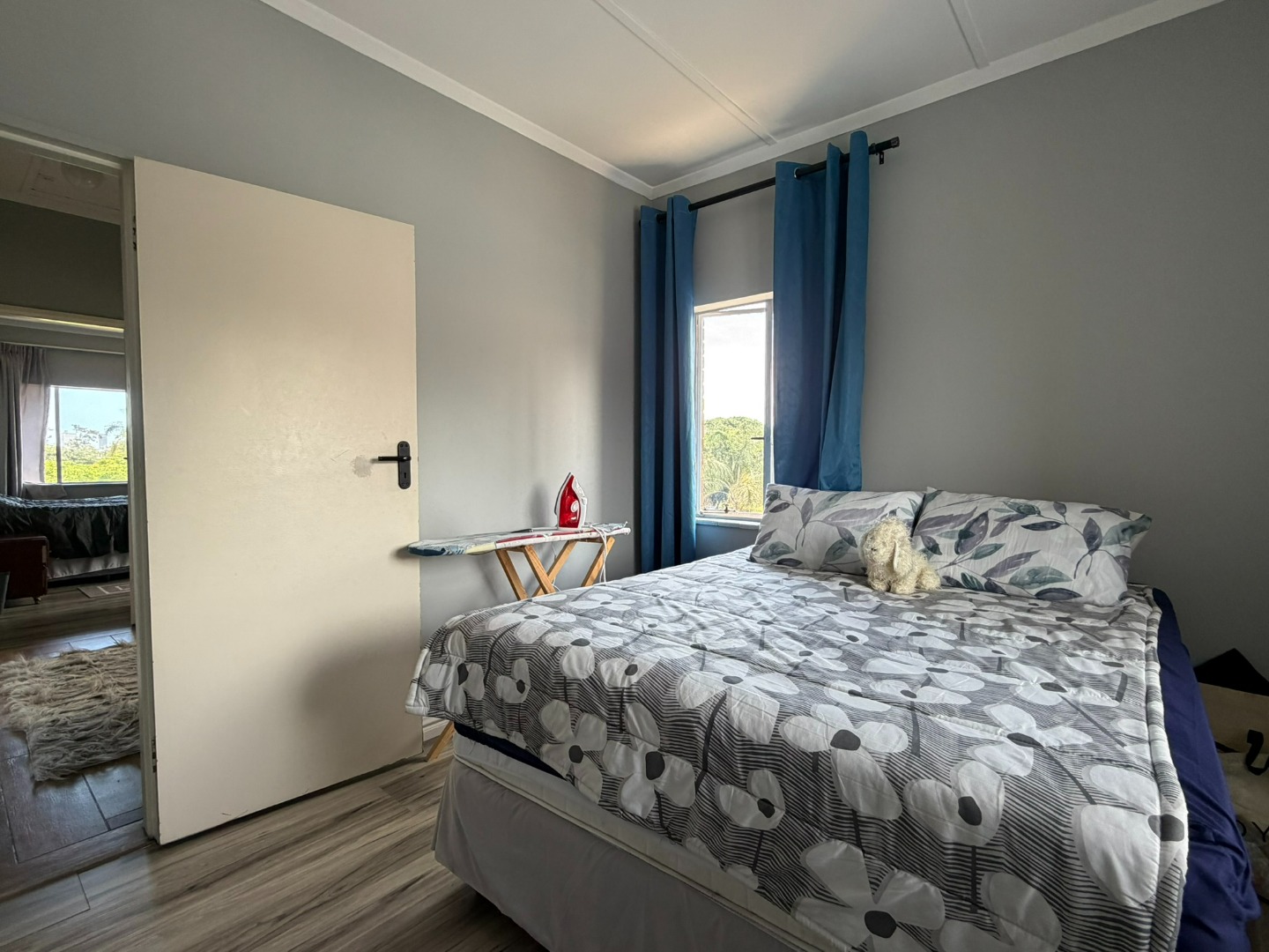 The unit offers two generously sized bedrooms with built-in cupboards and ample natural light. Both bedrooms are fitted with laminate flooring, while the lounge and bathrooms are fully tiled. The modern bathroom includes a shower and basin, complemented by a separate guest toilet.