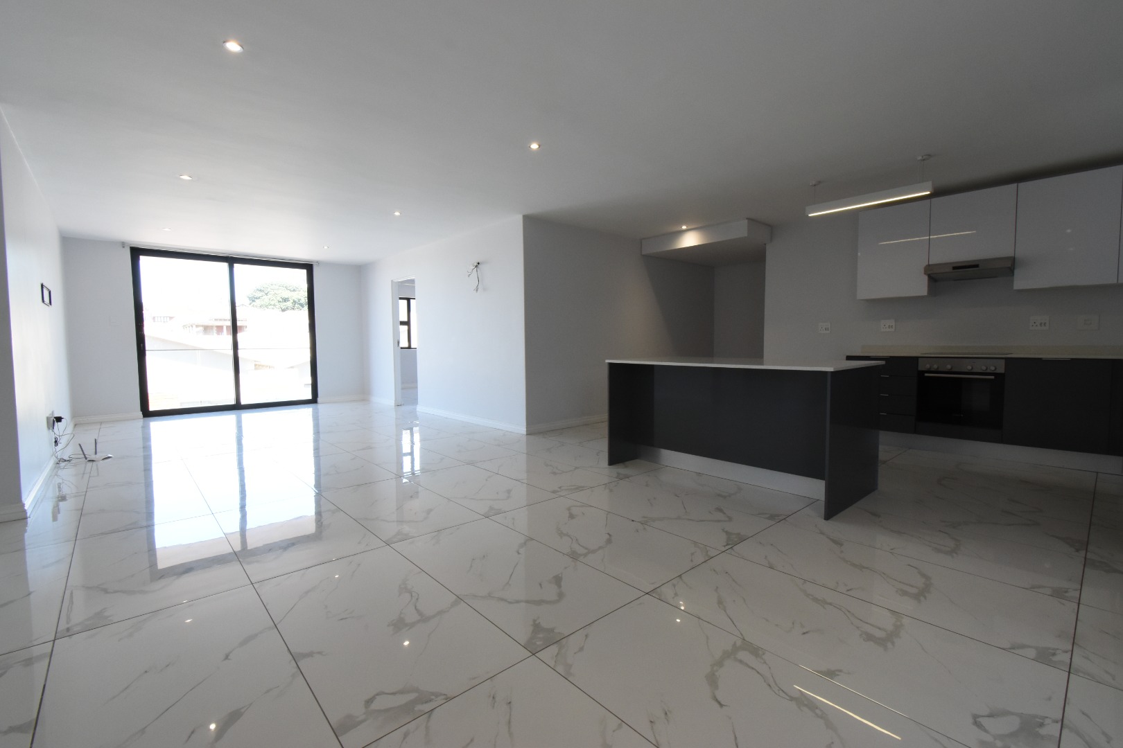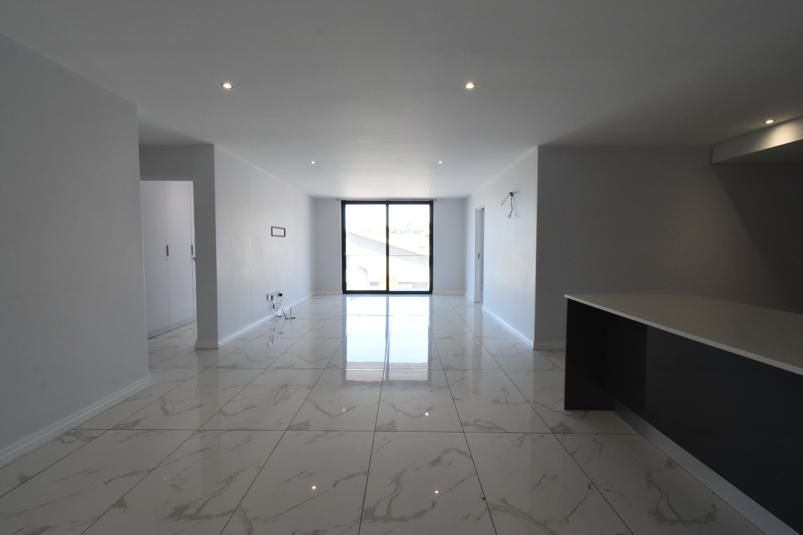 Bright and breezy lounge and living area leading onto a balcony showing off the fabulous sea views and the city lights.
