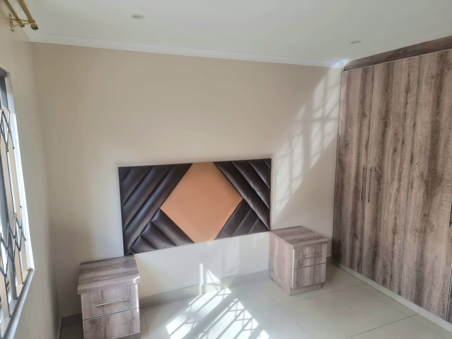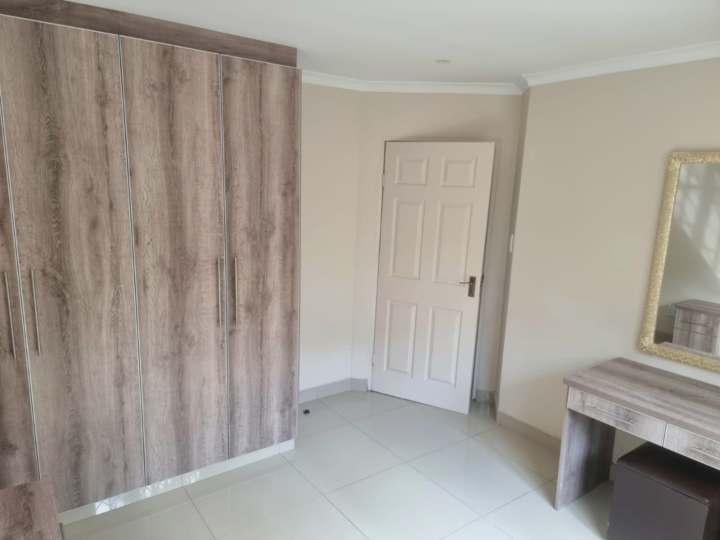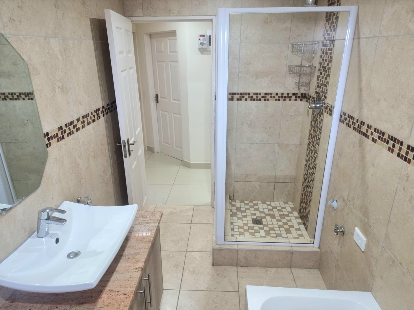 Spacious first-floor apartment available immediately in a secure, well-maintained shared property. Open-plan kitchen with built-in cupboards, quartz countertops, electric hob, oven, and extractor fan. Family TV room leads to first-floor balcony. Features three bedrooms with built-in cupboards, designer headboards, and dressing tables. Main bedroom with en-suite (shower, toilet, basin). Family bathroom with shower, bathtub, toilet, basin, and space for a top-loader washing machine.