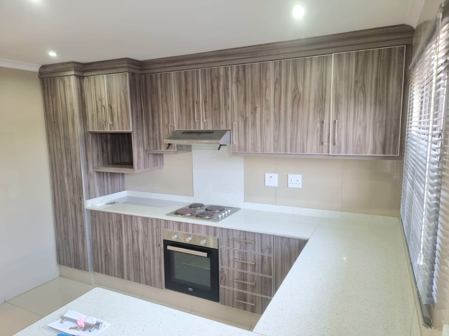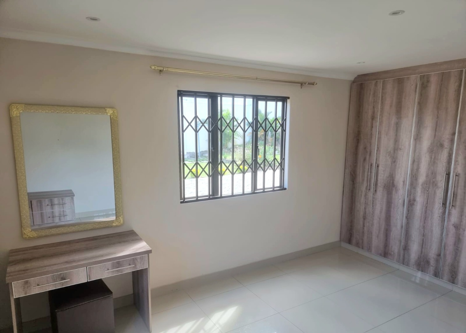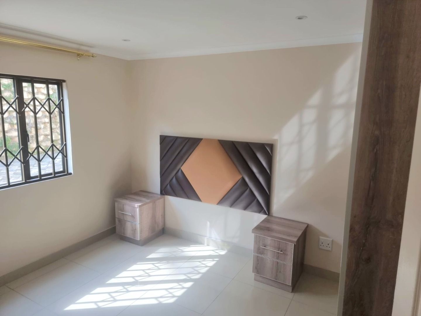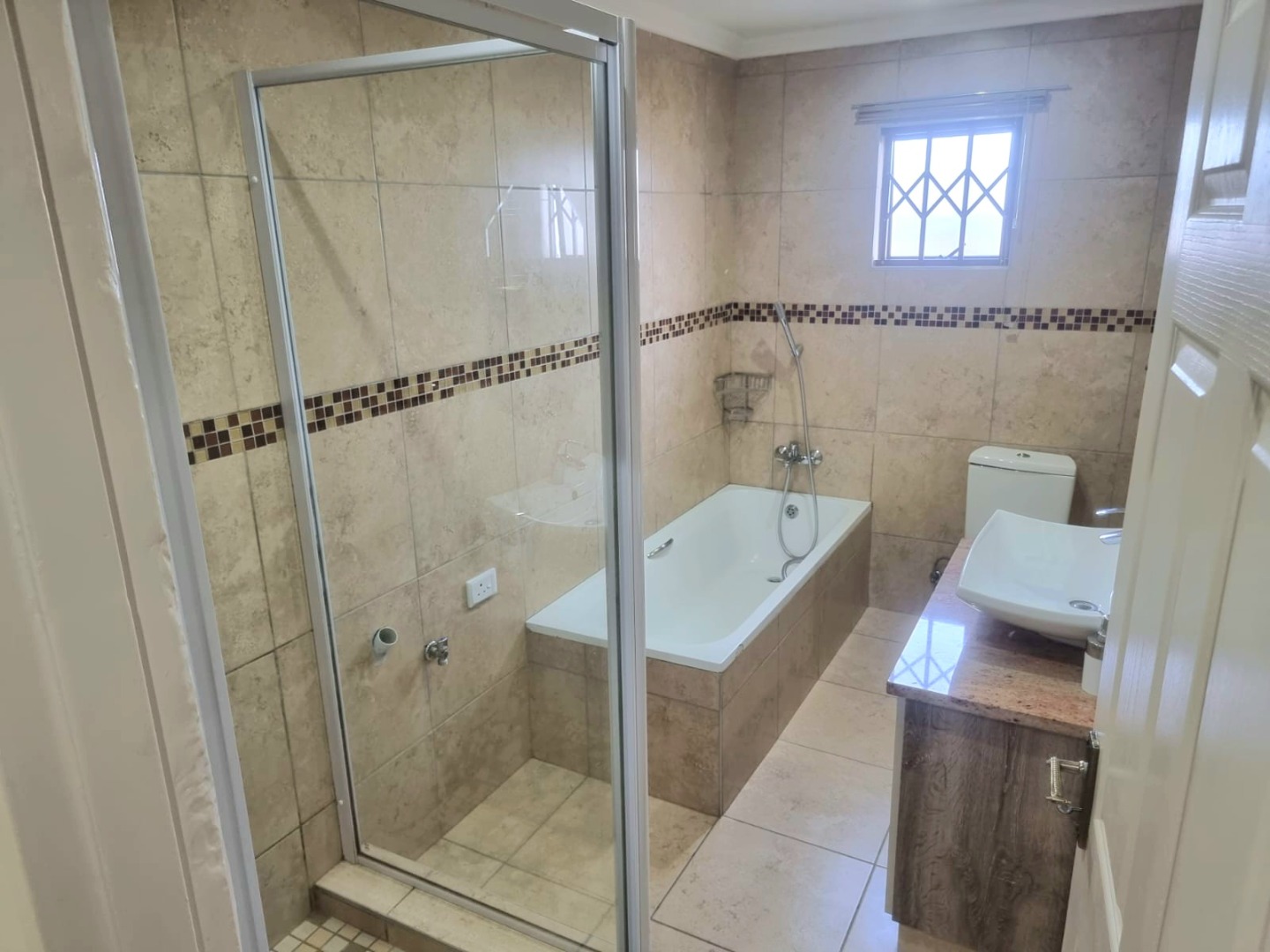 Spacious first-floor apartment available immediately in a secure, well-maintained shared property. Open-plan kitchen with built-in cupboards, quartz countertops, electric hob, oven, and extractor fan. Family TV room leads to first-floor balcony. Features three bedrooms with built-in cupboards, designer headboards, and dressing tables. Main bedroom with en-suite (shower, toilet, basin). Family bathroom with shower, bathtub, toilet, basin, and space for a top-loader washing machine.