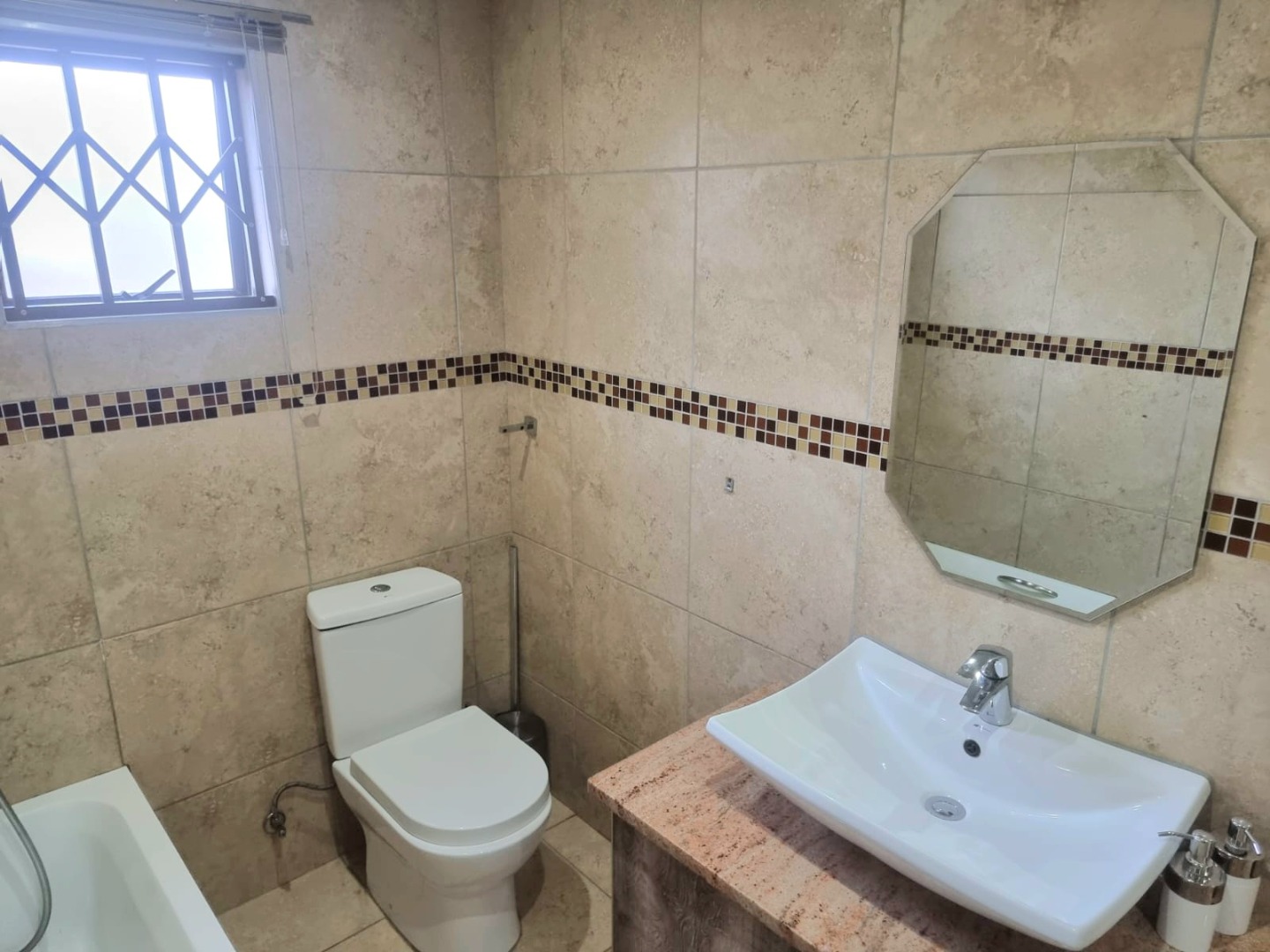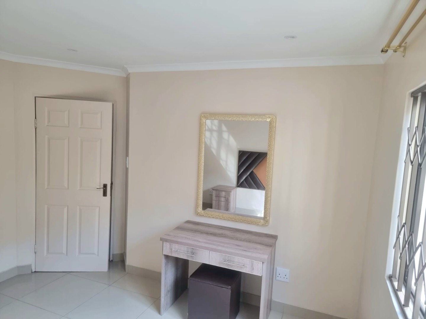 Spacious first-floor apartment available immediately in a secure, well-maintained shared property. Open-plan kitchen with built-in cupboards, quartz countertops, electric hob, oven, and extractor fan. Family TV room leads to first-floor balcony. Features three bedrooms with built-in cupboards, designer headboards, and dressing tables. Main bedroom with en-suite (shower, toilet, basin). Family bathroom with shower, bathtub, toilet, basin, and space for a top-loader washing machine.