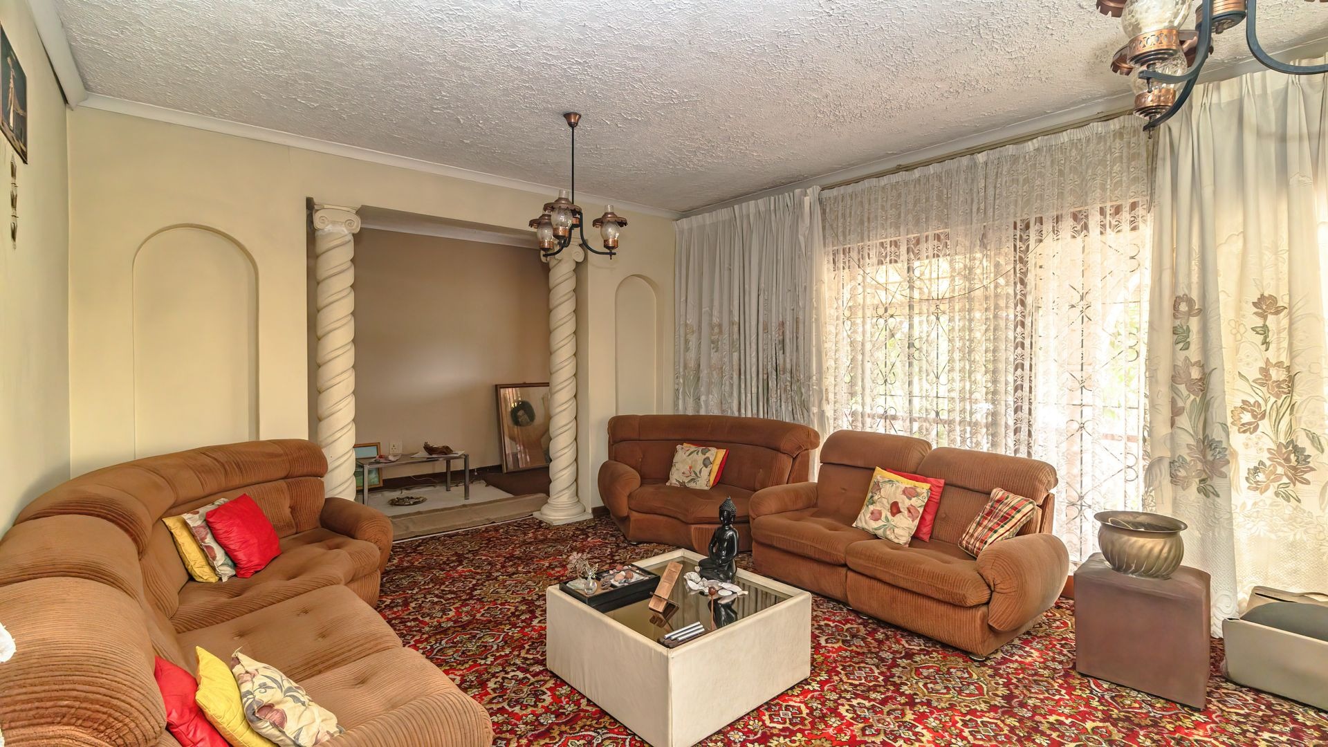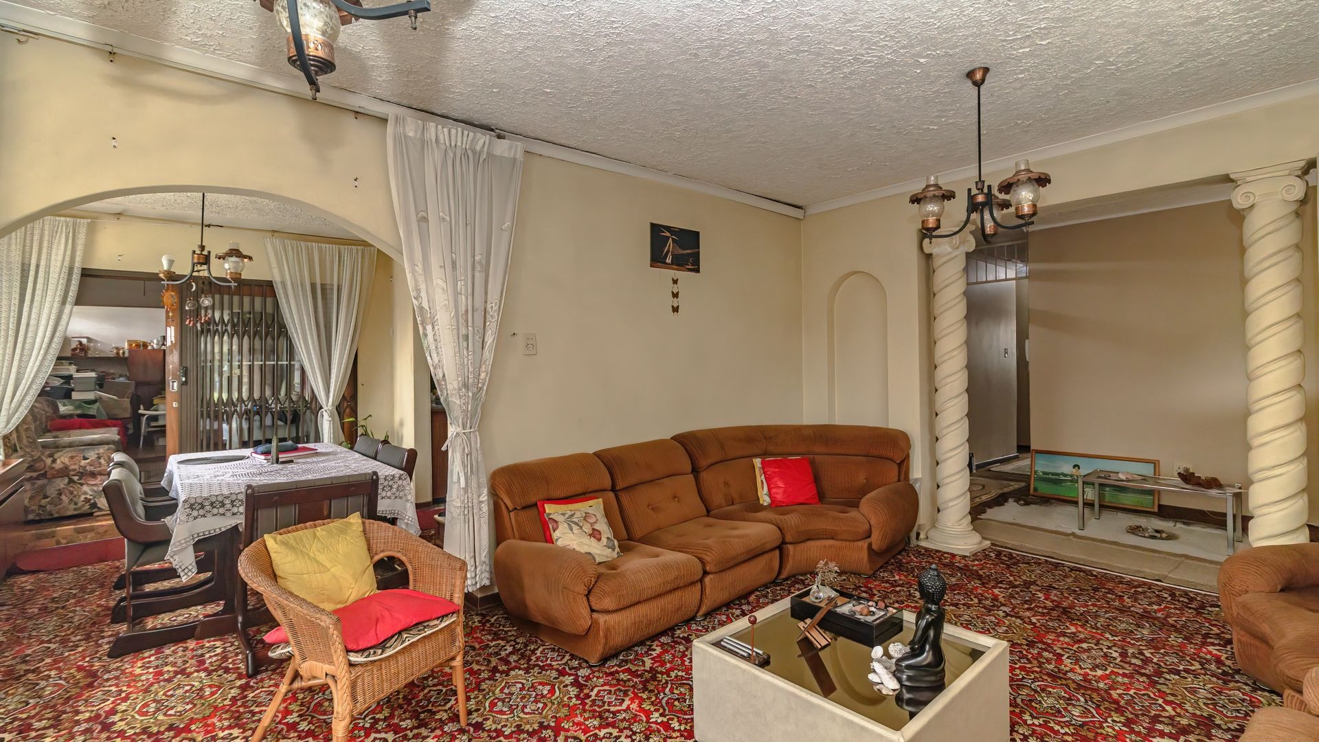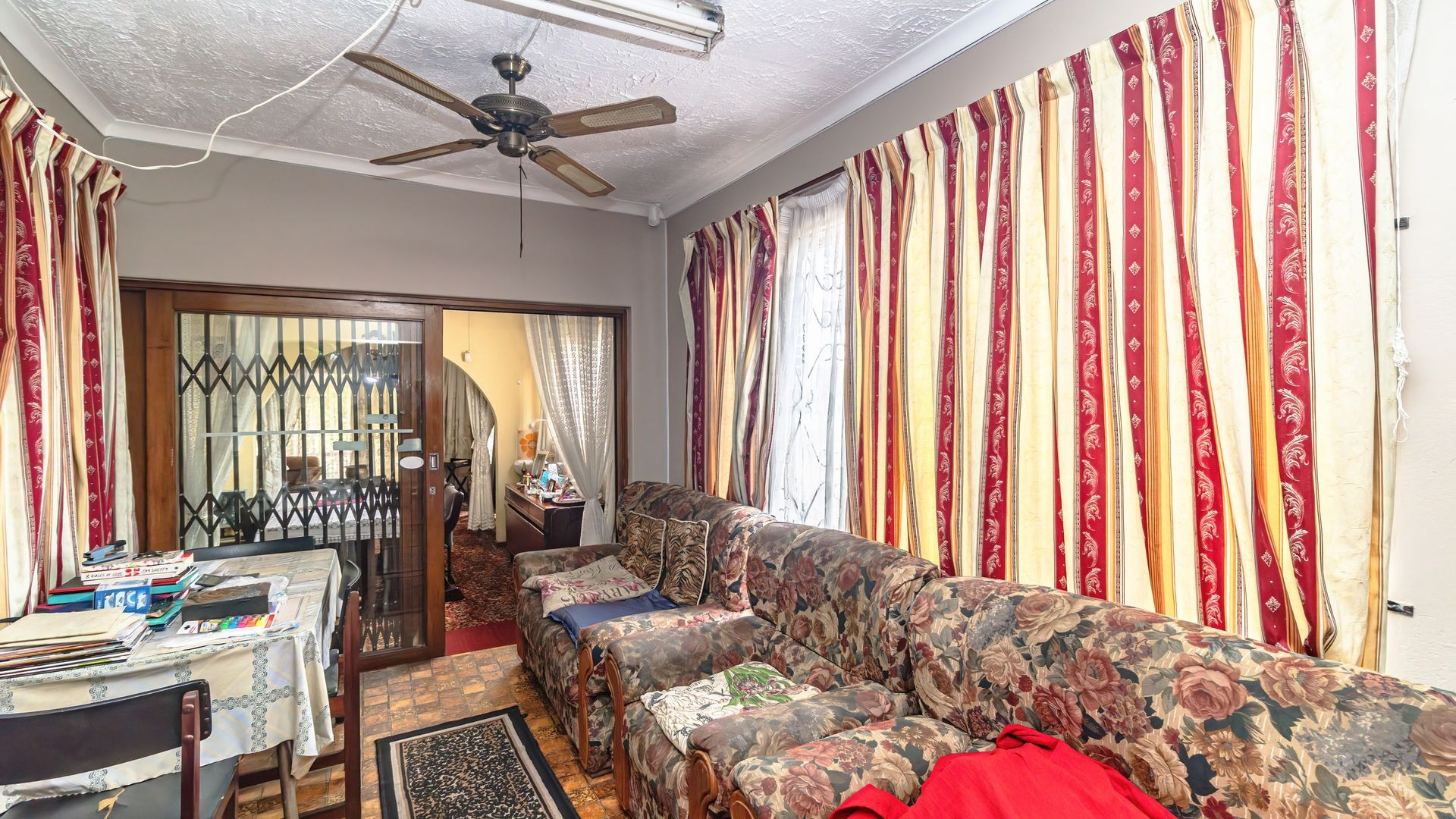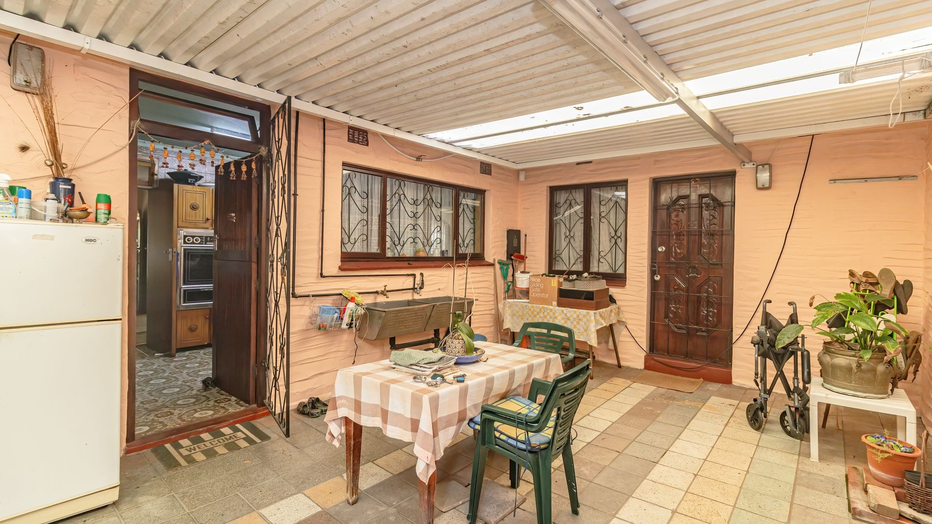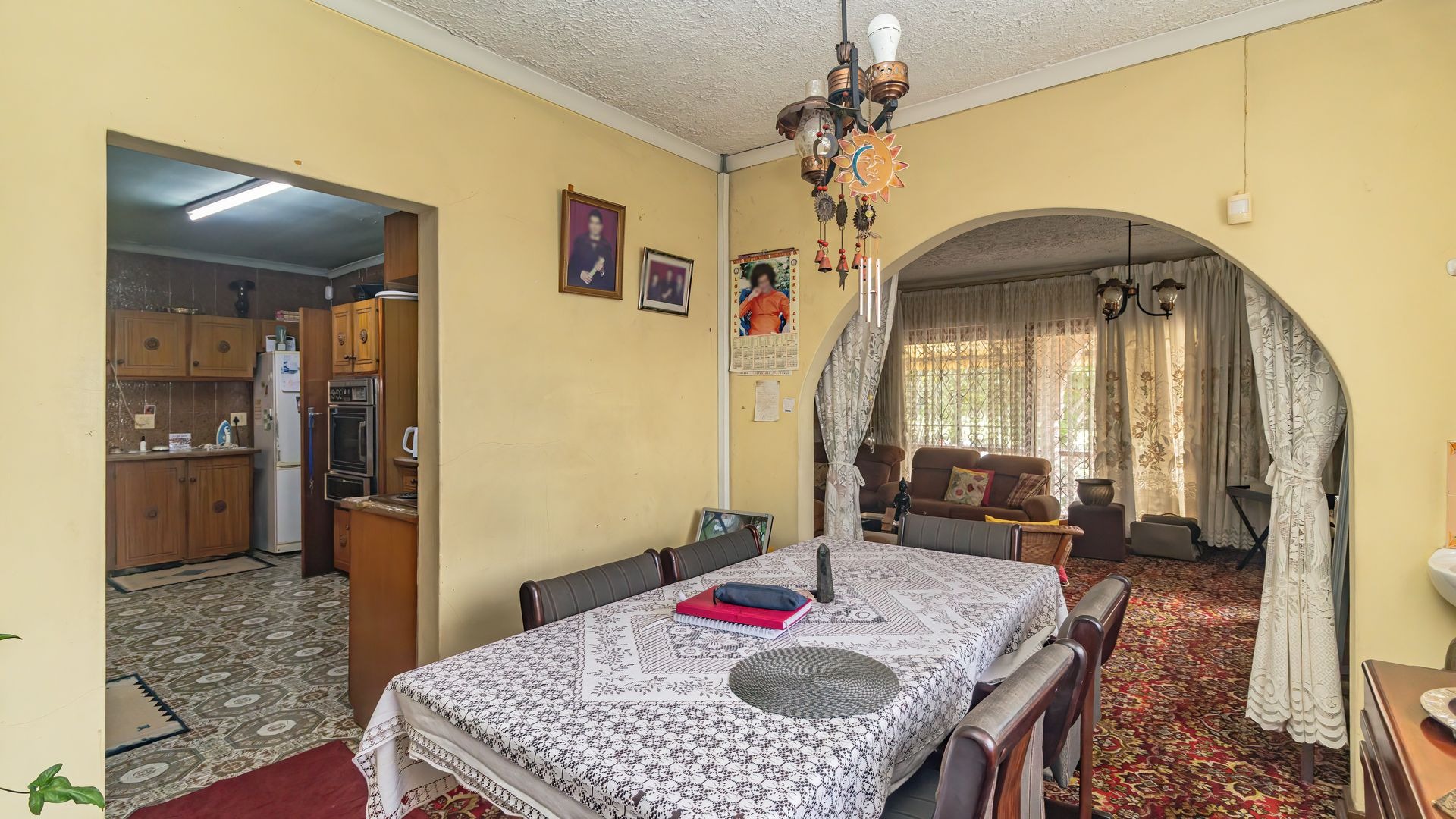 This home features a fully fitted and tiled kitchen that flows seamlessly into a charming dining area, which in turn leads into a warm and inviting lounge, perfect for family living and entertaining.