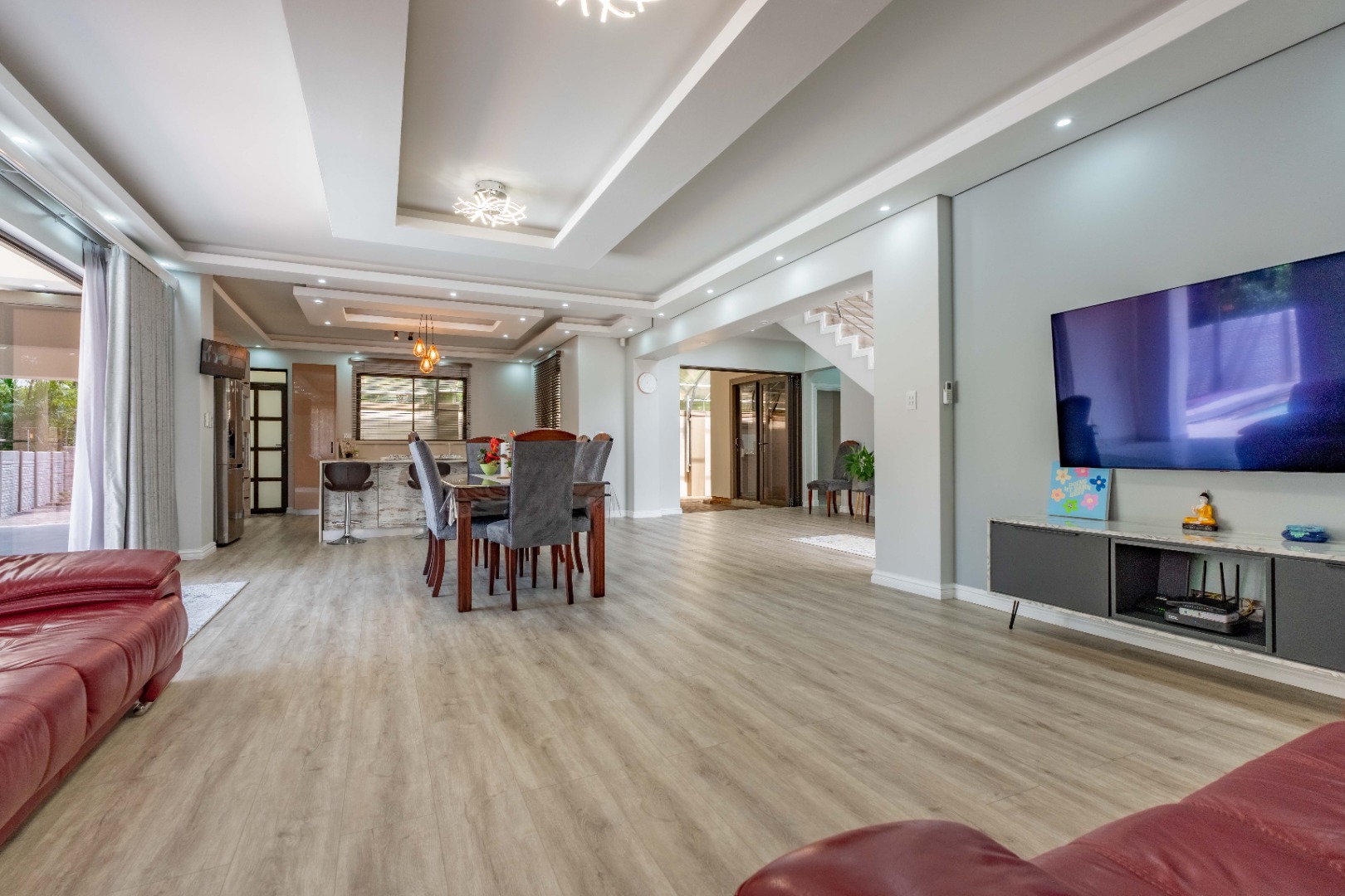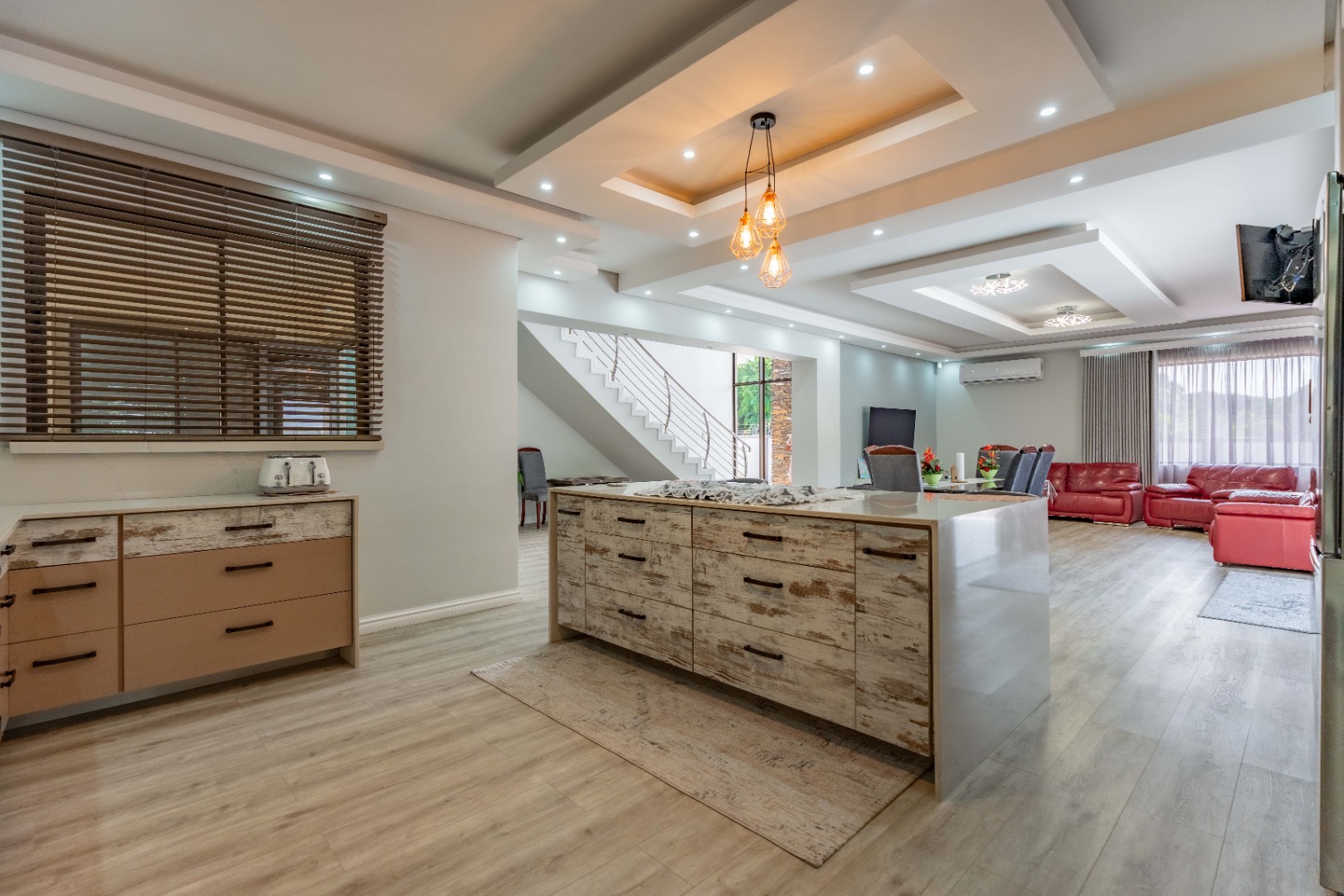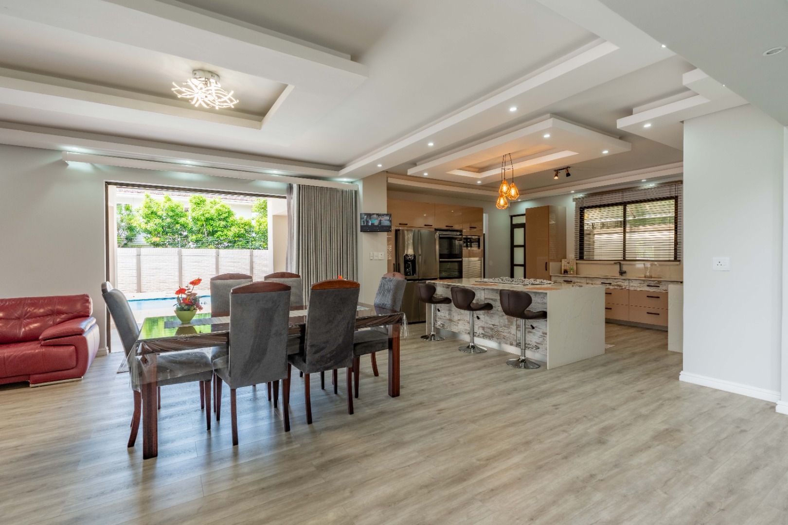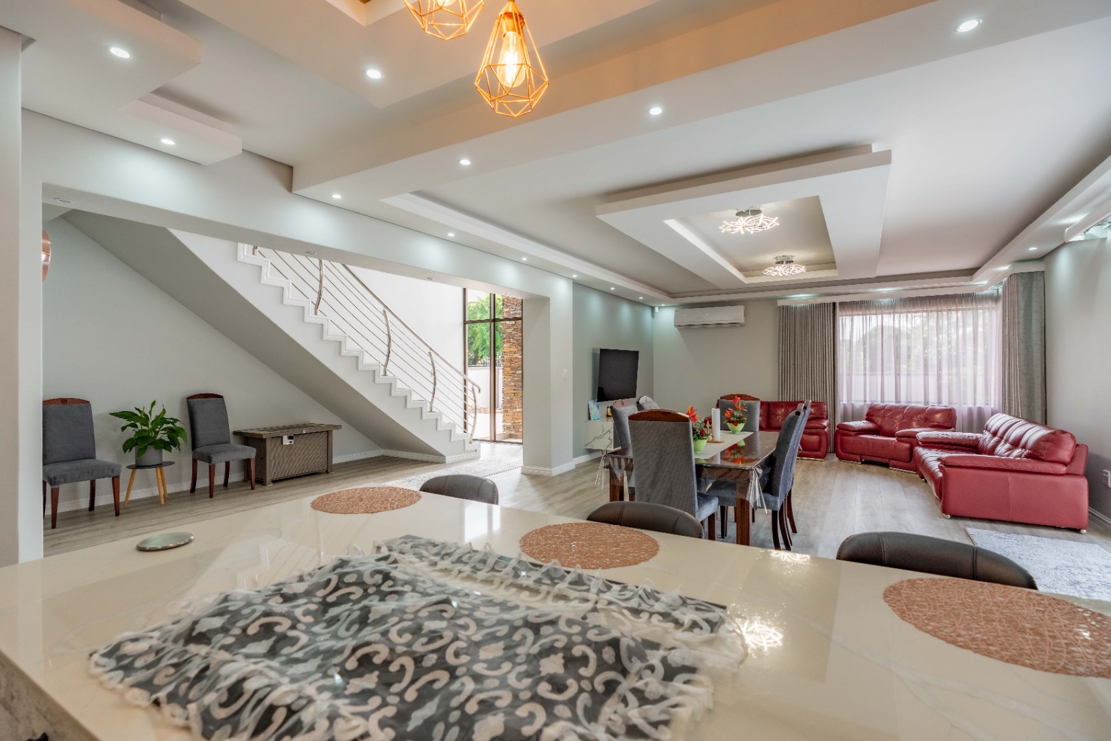The interior of this stunning mansion features light grey vinyl flooring throughout, double-volume ceilings, and spacious open-plan living areas. The designer kitchen is equipped with bespoke finishes, including Caesarstone countertops and Niemann cupboard doors. The expansive outdoor area is perfect for entertaining, with a sparkling pool, two built-in braais, and ample parking.