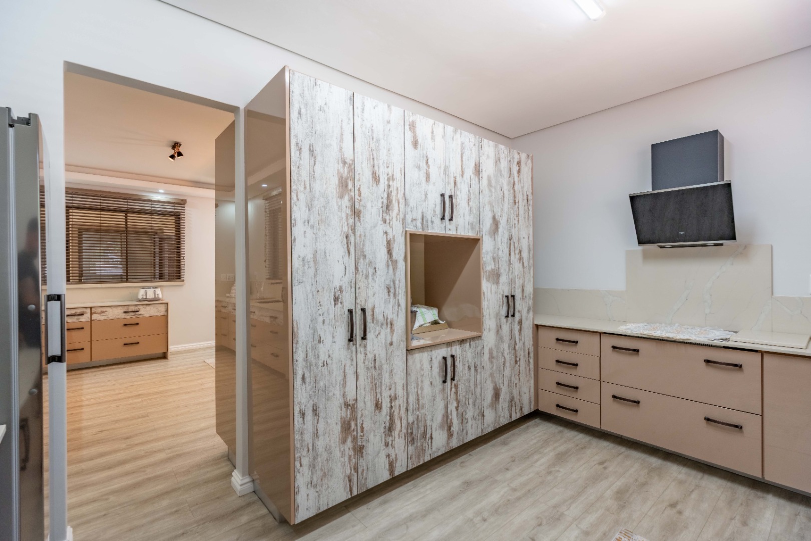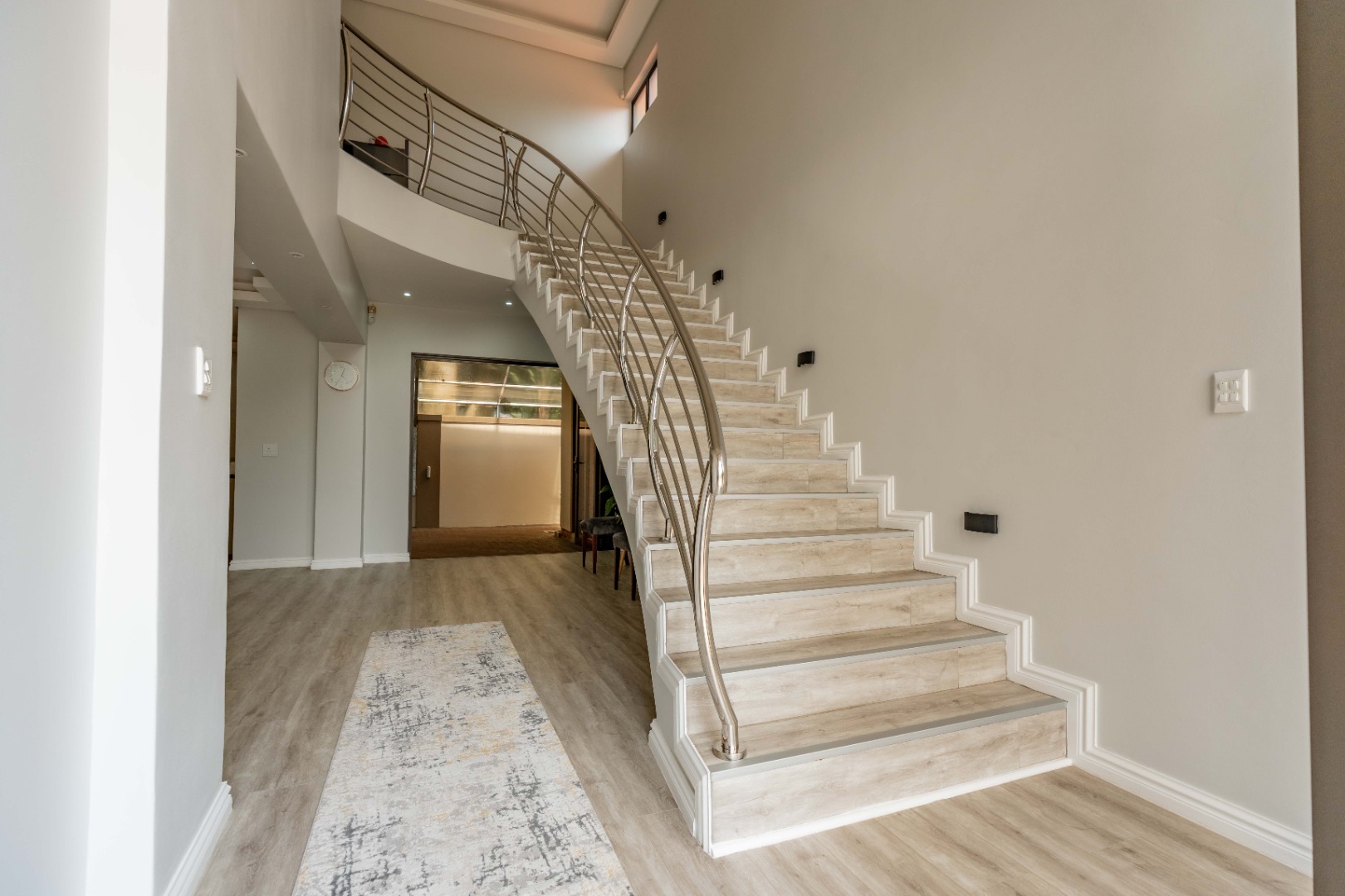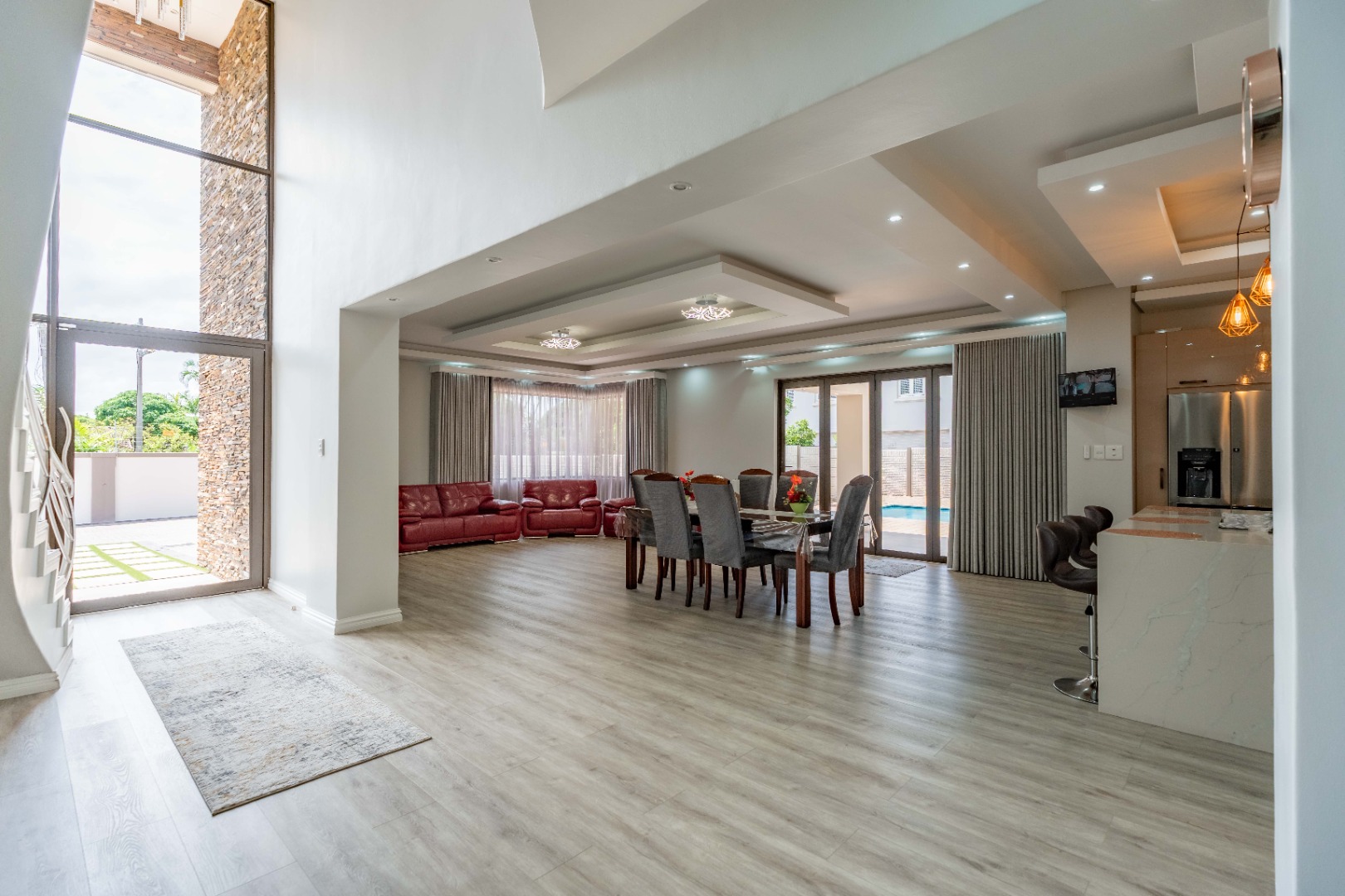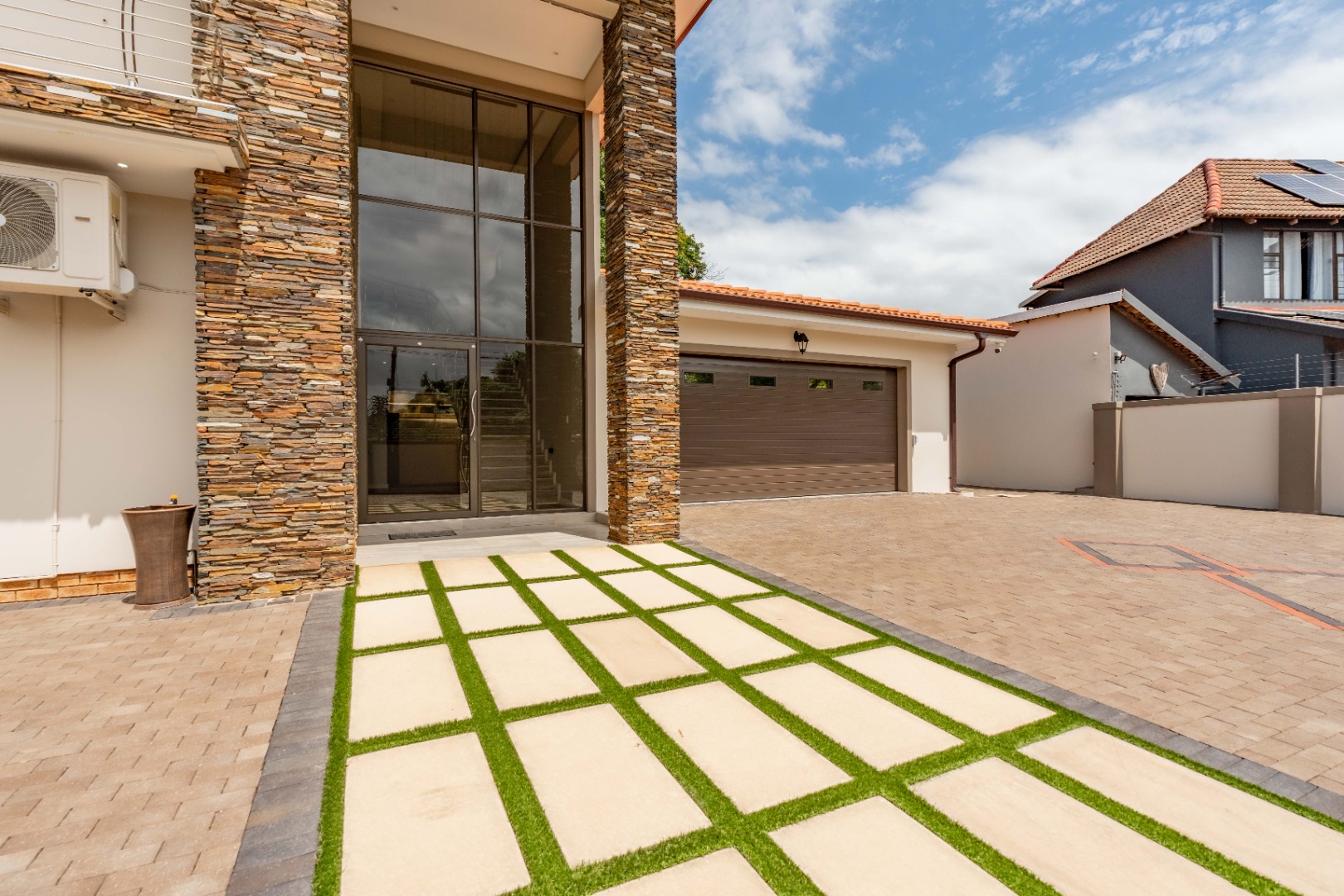 The interior of this stunning mansion features light grey vinyl flooring throughout, double-volume ceilings, and spacious open-plan living areas. The designer kitchen is equipped with bespoke finishes, including Caesarstone countertops and Niemann cupboard doors. The expansive outdoor area is perfect for entertaining, with a sparkling pool, two built-in braais, and ample parking.