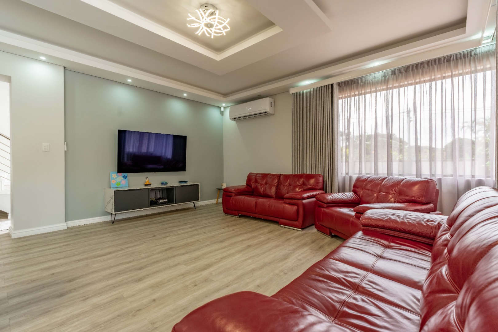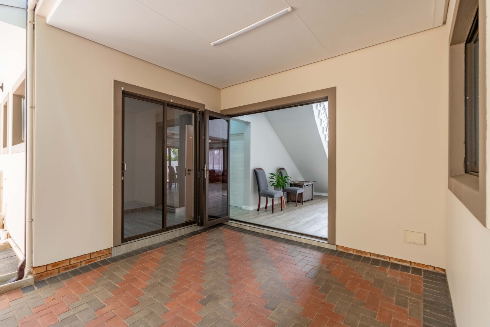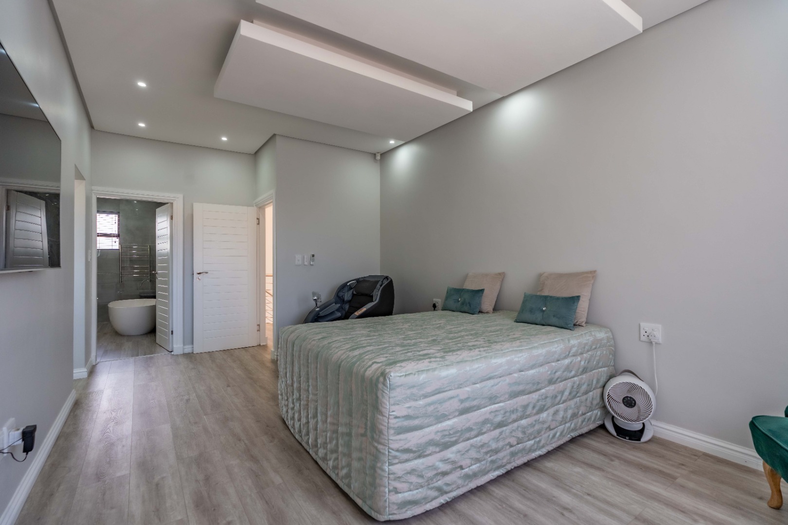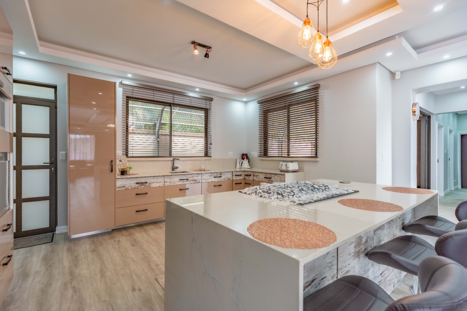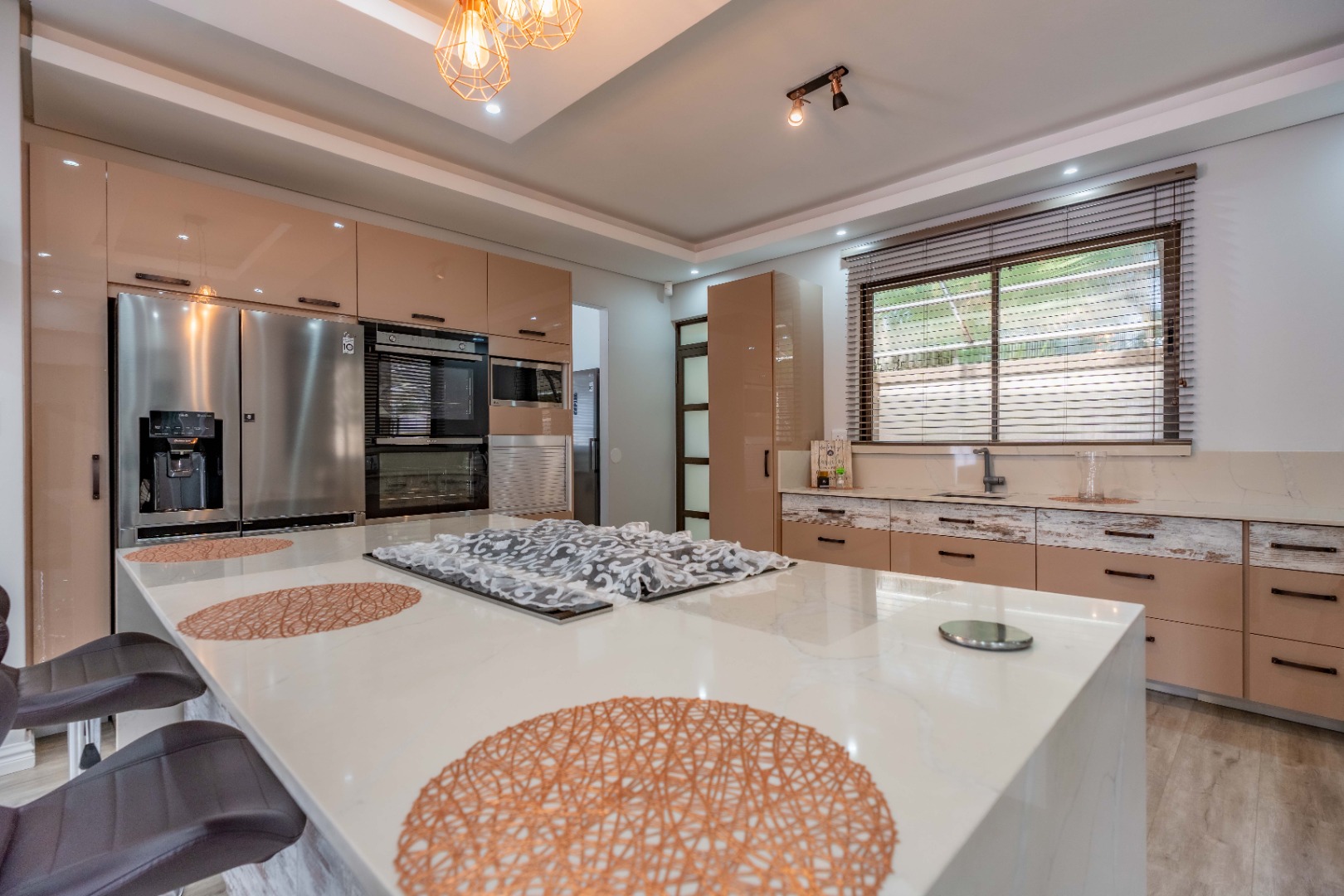 The interior of this stunning mansion features light grey vinyl flooring throughout, double-volume ceilings, and spacious open-plan living areas. The designer kitchen is equipped with bespoke finishes, including Caesarstone countertops and Niemann cupboard doors. The expansive outdoor area is perfect for entertaining, with a sparkling pool, two built-in braais, and ample parking.