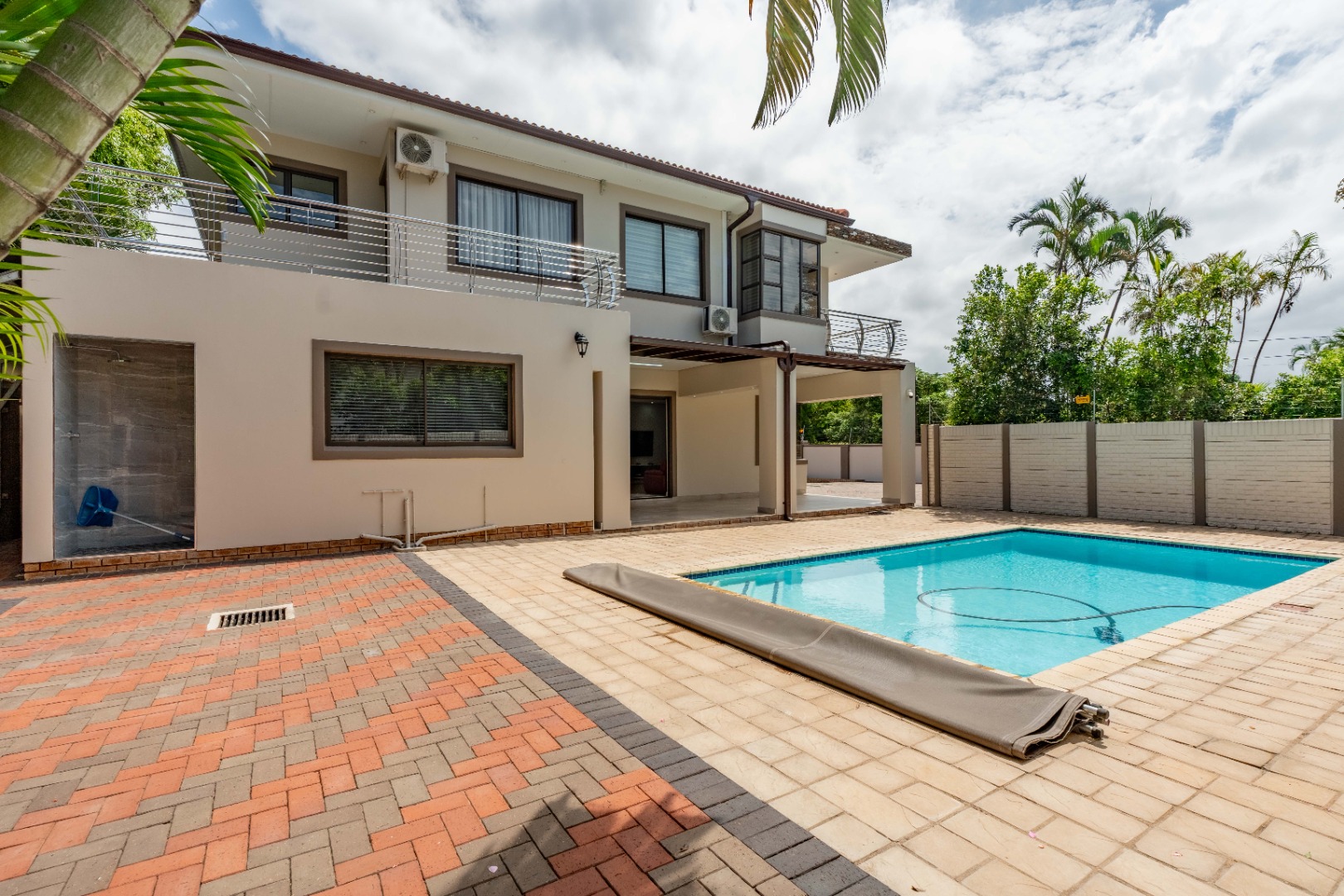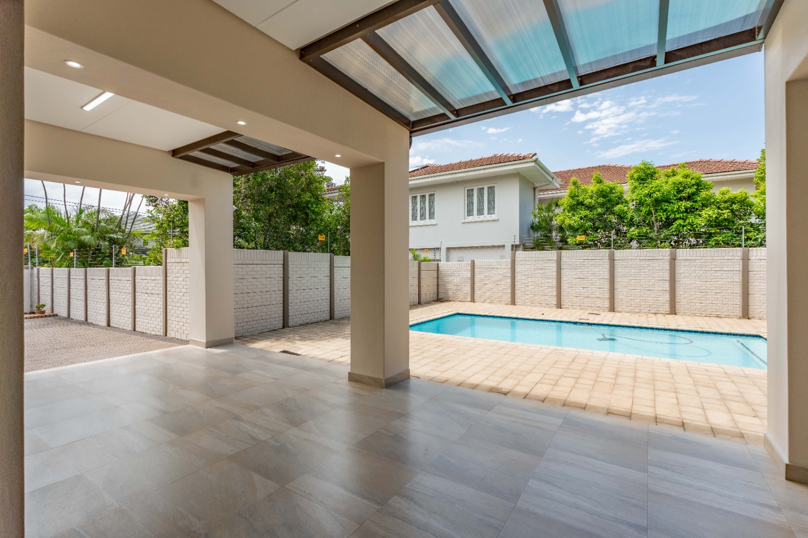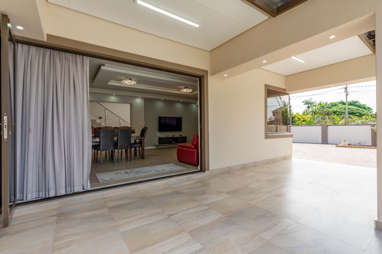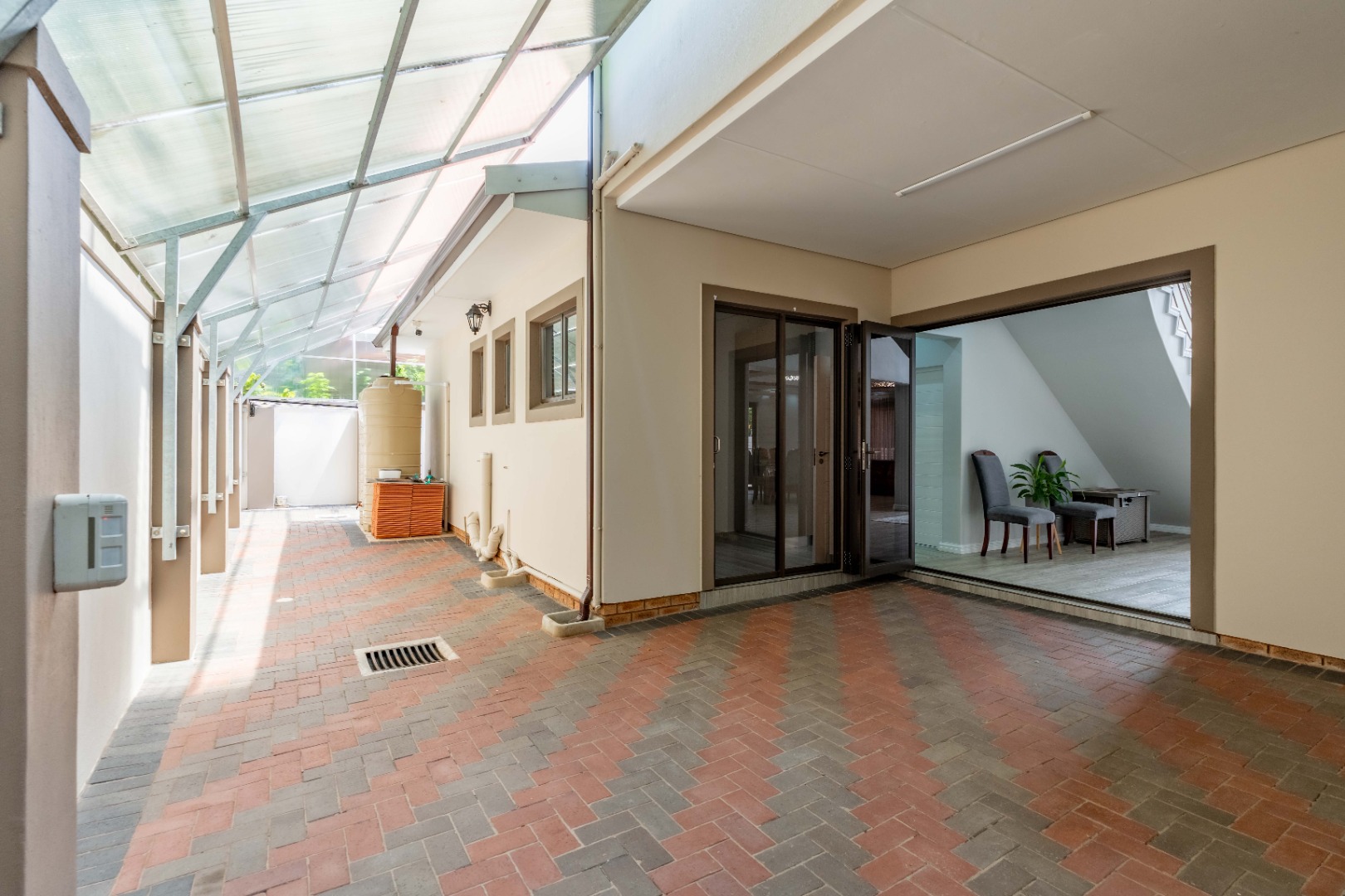 The interior of this stunning mansion features light grey vinyl flooring throughout, double-volume ceilings, and spacious open-plan living areas. The designer kitchen is equipped with bespoke finishes, including Caesarstone countertops and Niemann cupboard doors. The expansive outdoor area is perfect for entertaining, with a sparkling pool, two built-in braais, and ample parking.