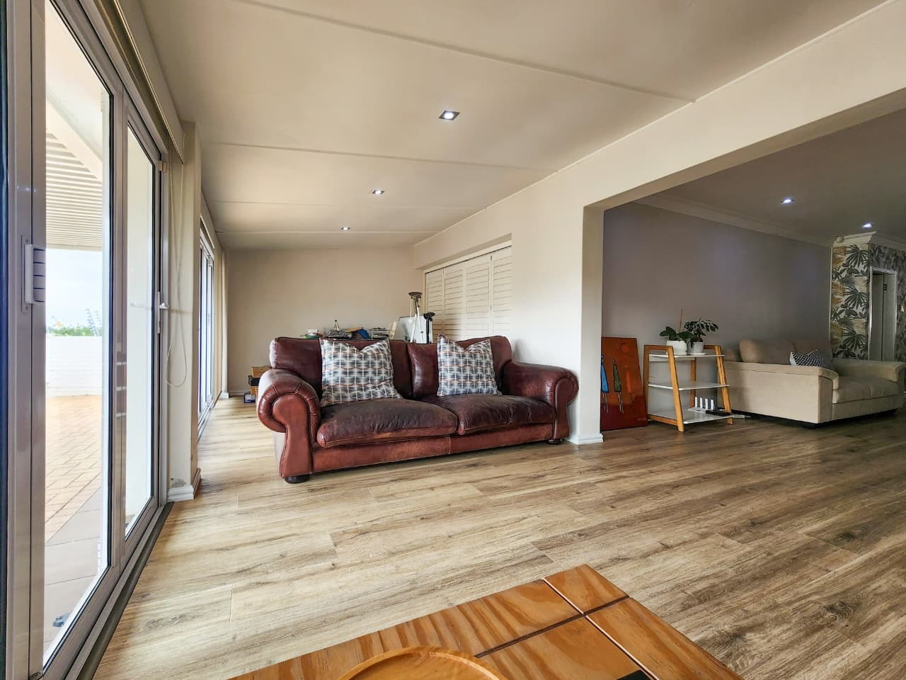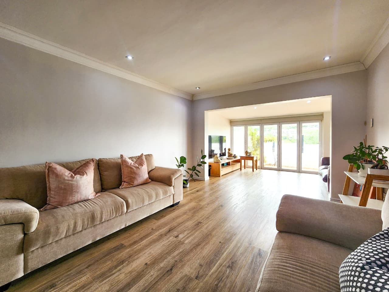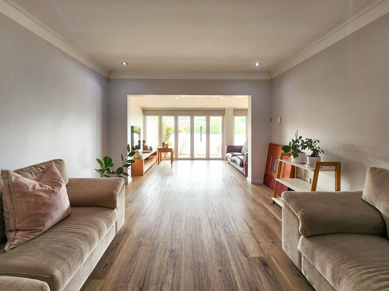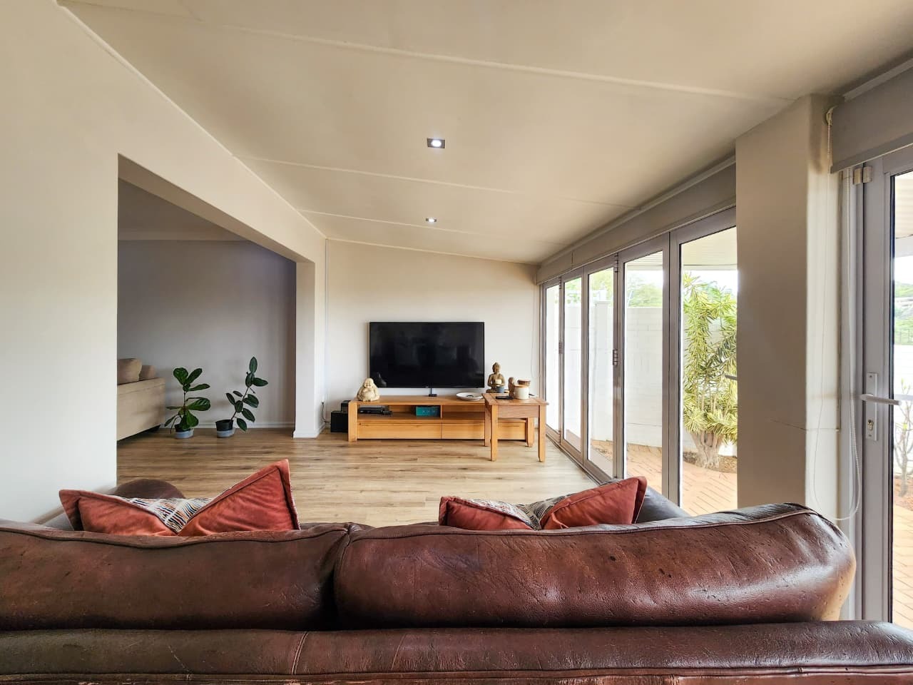 Beyond the kitchen, the spacious open-plan dining area flows seamlessly into the TV lounge, which leads into a formal lounge with an additional corner space—perfect for a home office. Two large concertina sliding doors open onto a covered entertainment area, allowing fresh afternoon breezes to fill the home.