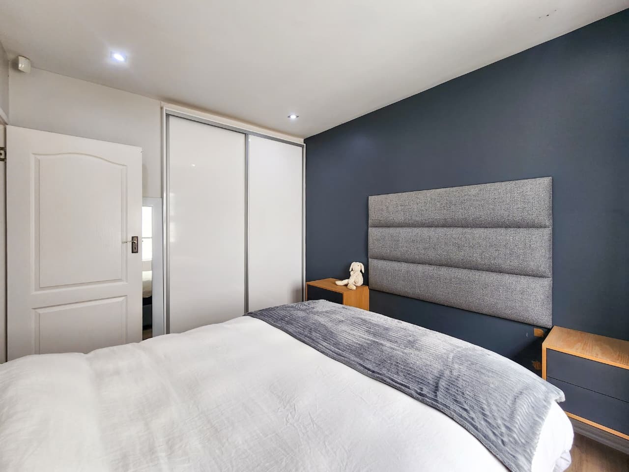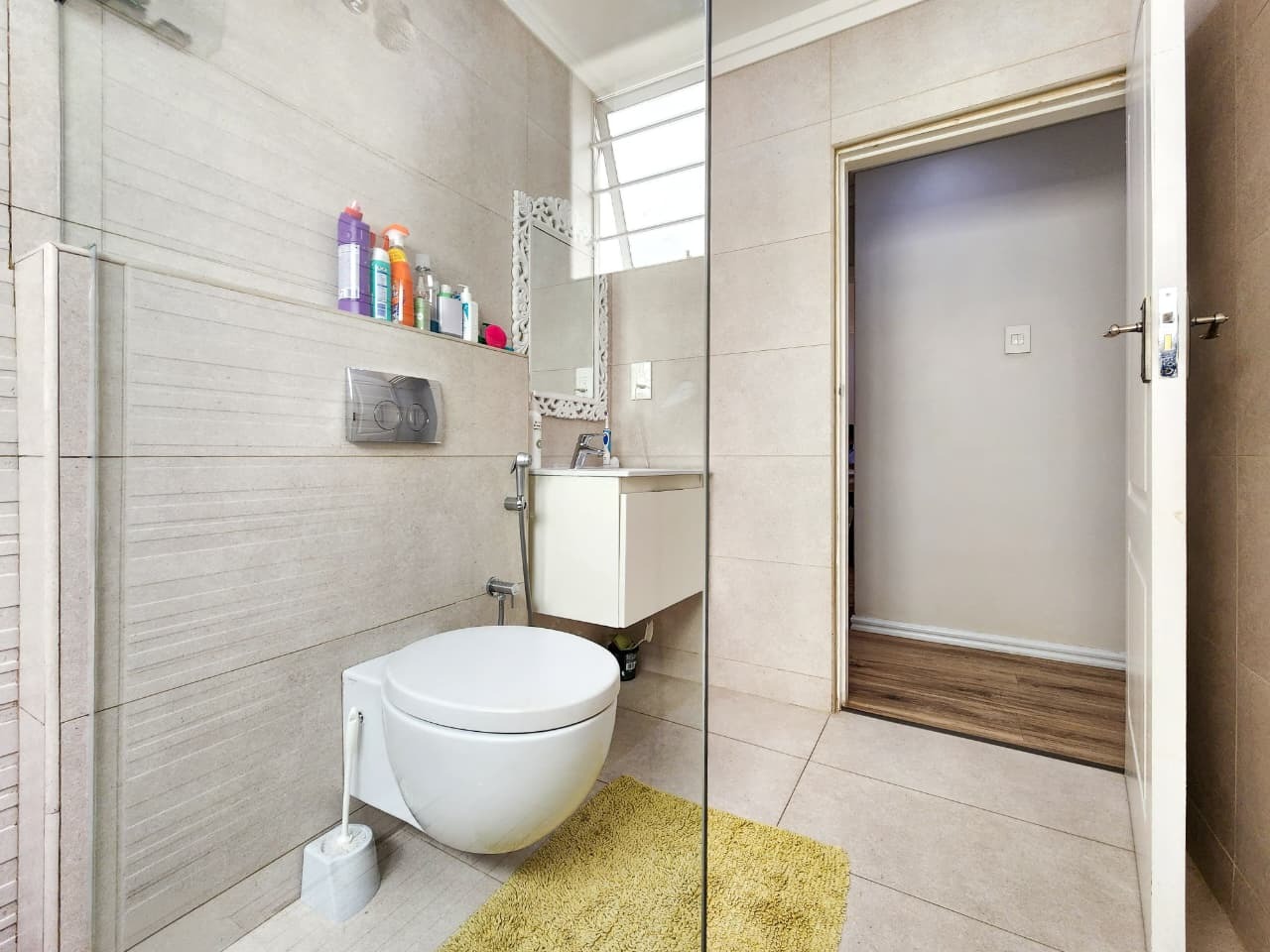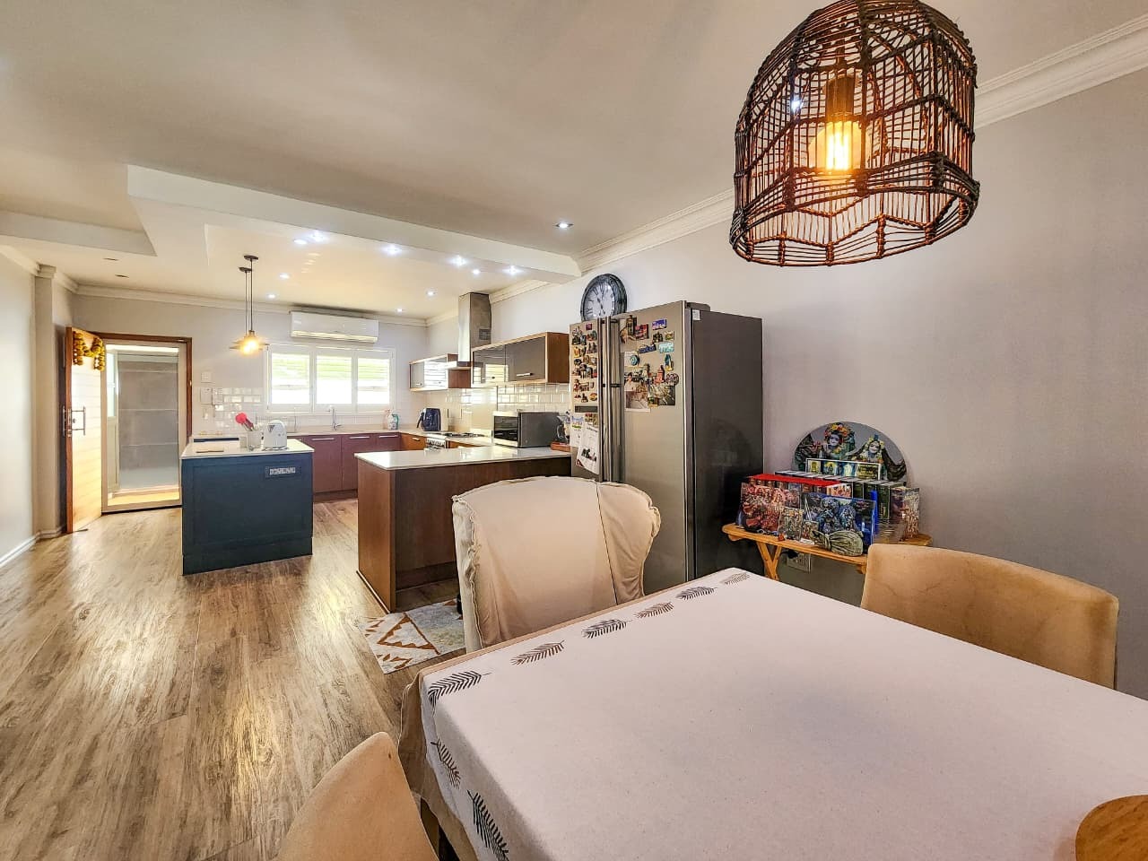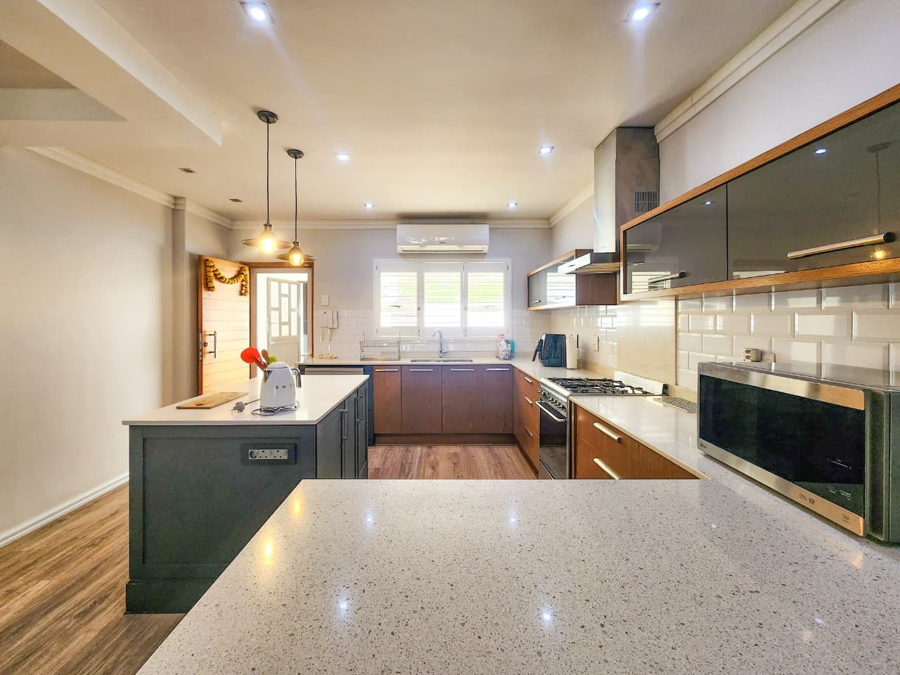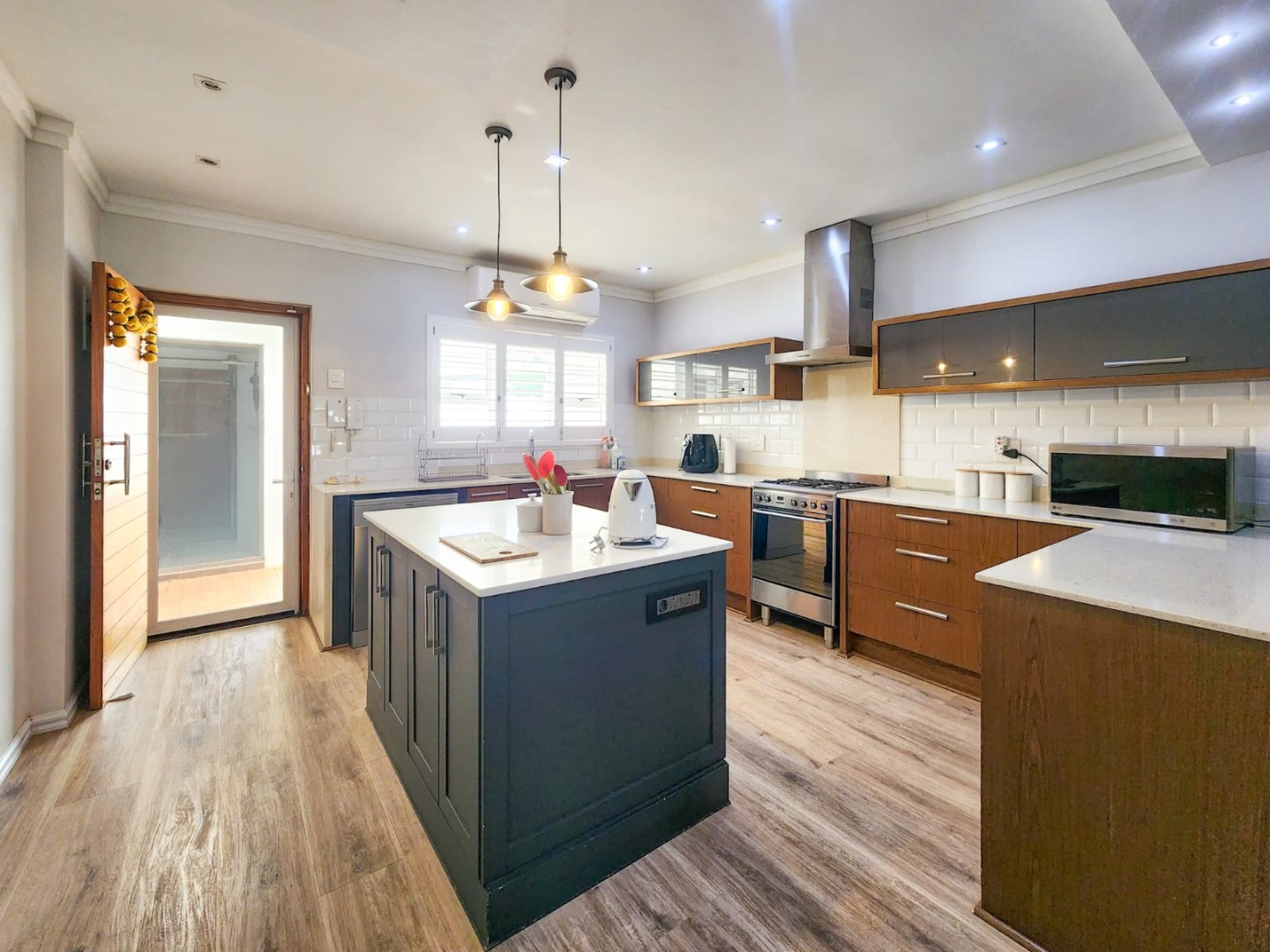 Through the front door, you are welcomed into a stylish open-plan kitchen with ample built-in cupboards, Caesarstone countertops, a breakfast nook, a gas stove with an extractor fan, an under-counter oven, a double-basin sink, and plumbing for a dishwasher.