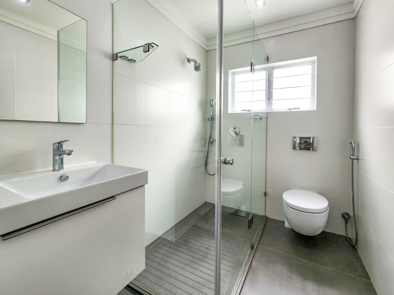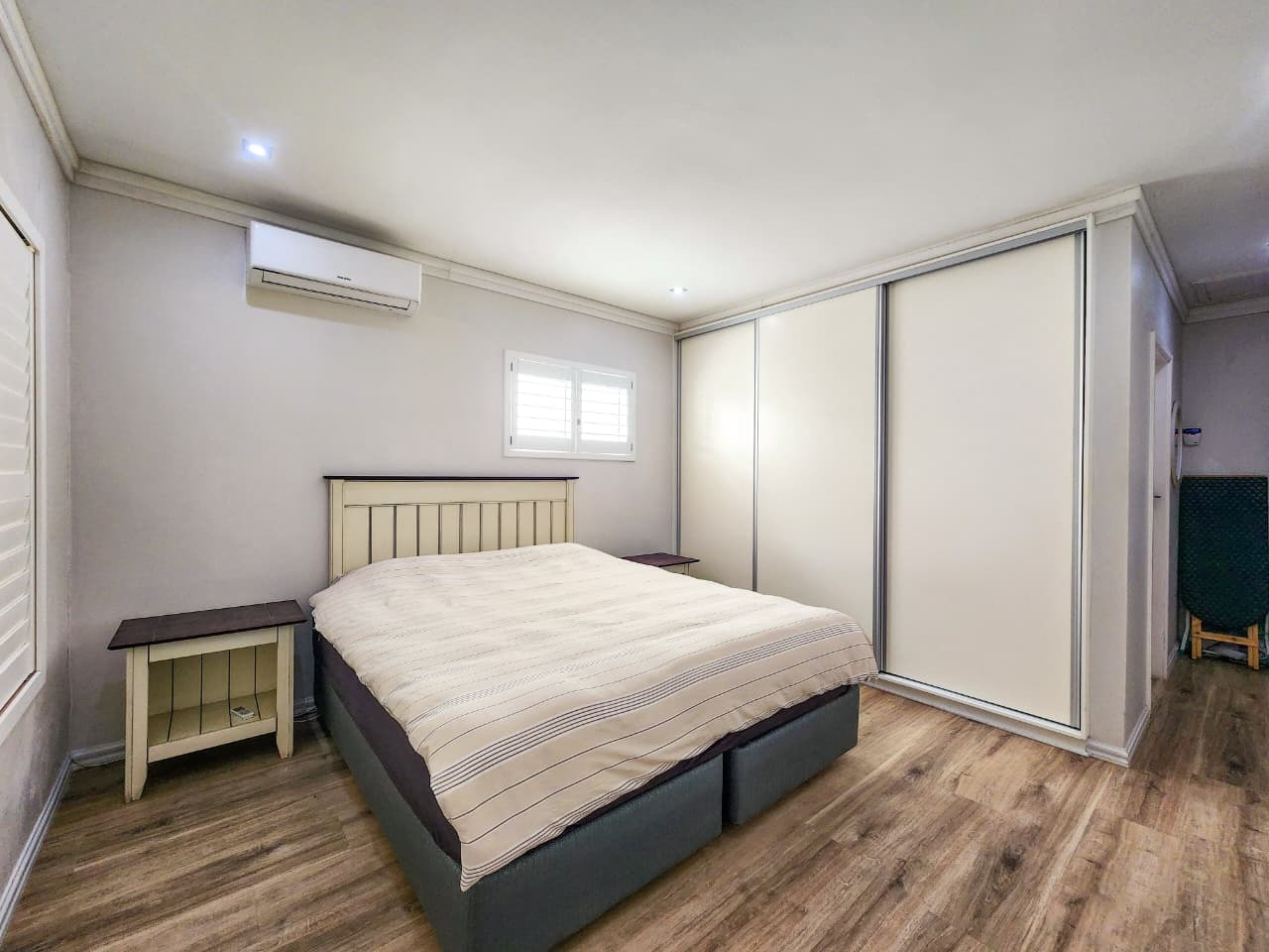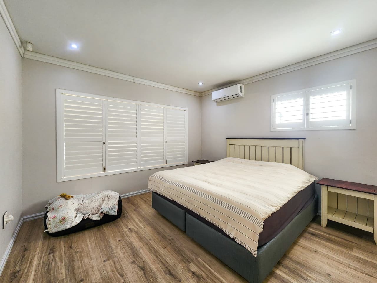 All bedrooms are located on the right side of the unit and are equipped with air conditioning and built-in cupboards. The main bedroom features an en-suite bathroom with a shower and toilet, while the second bathroom includes a shower, toilet, and basin.