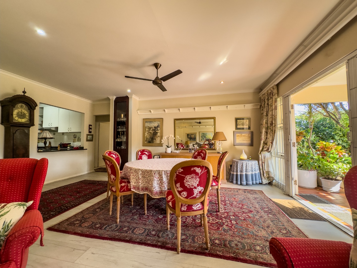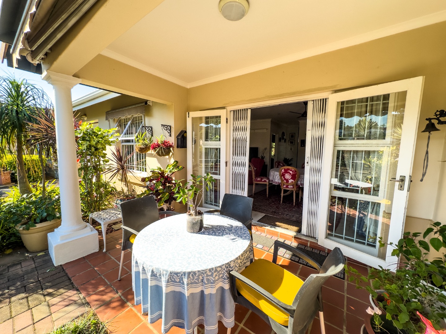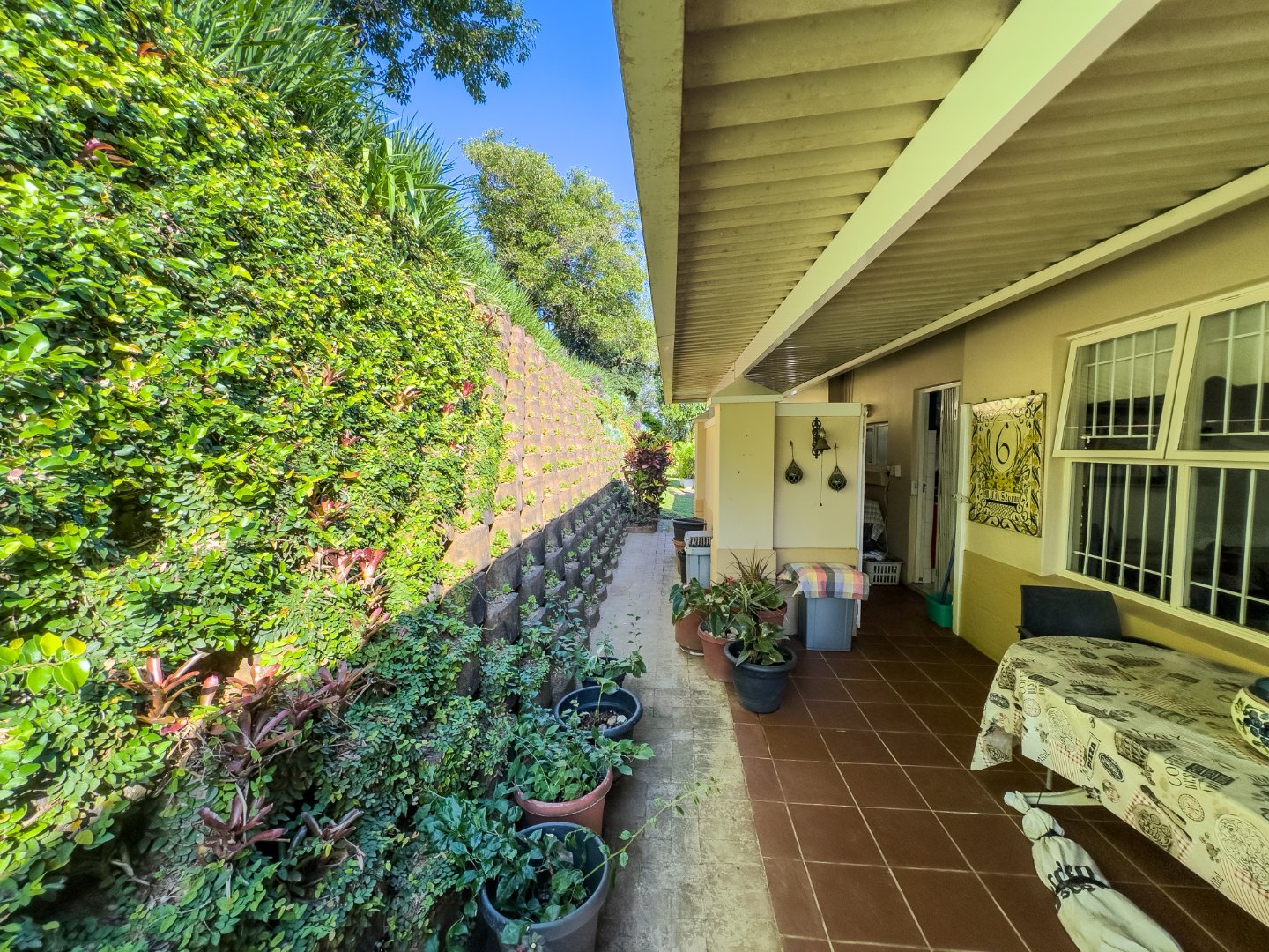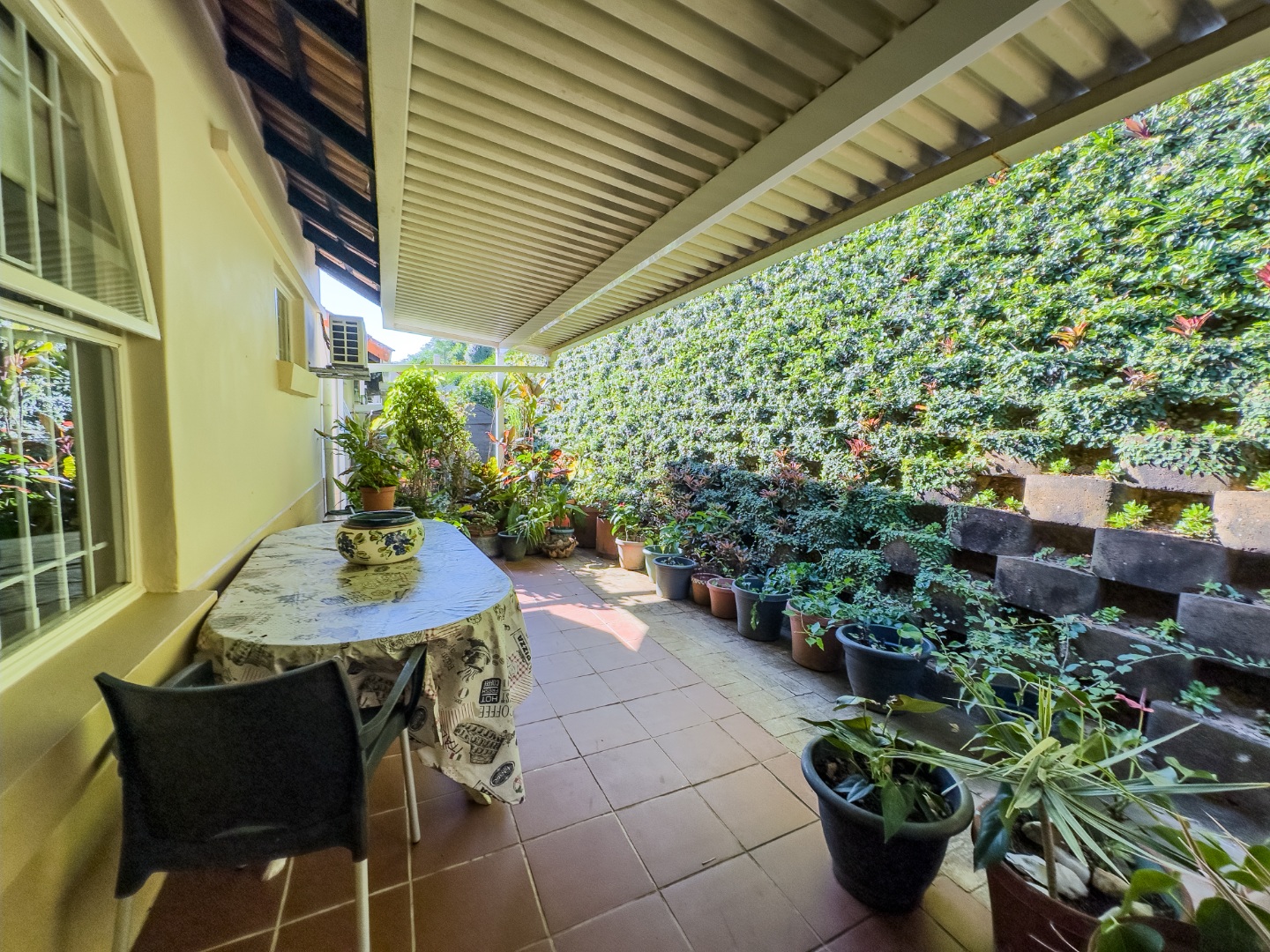 The open-plan lounge and dining area connect seamlessly to a modern kitchen with granite countertops. There’s also a separate enclosed laundry area, which opens out onto a private, covered patio—perfect for enjoying morning coffee, reading, or hosting small gatherings. The third bedroom is currently used as a study and offers flexibility for hobbies or visiting guests. The second bedroom is spacious with built-in cupboards and is conveniently located near a full bathroom with a bathtub. The main bedroom overlooks the garden and includes built-in storage, with a bathroom featuring a walk-in shower located nearby for easy access.