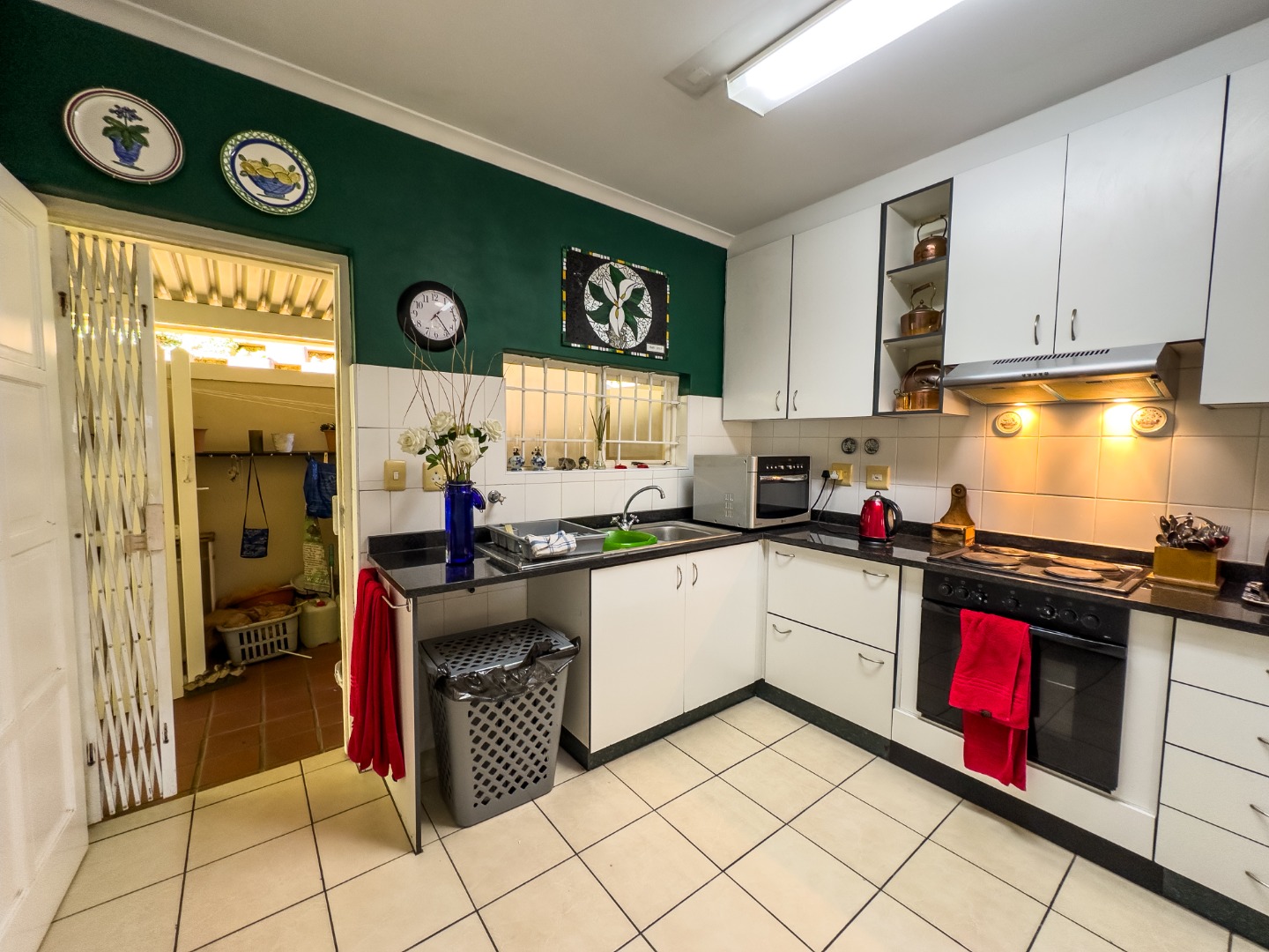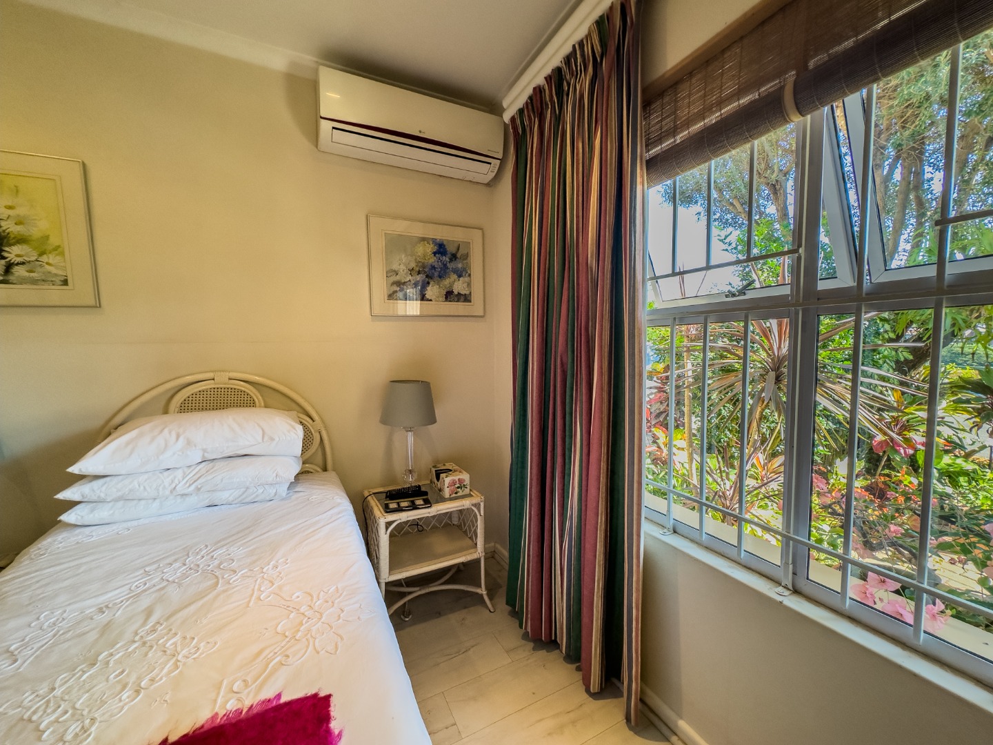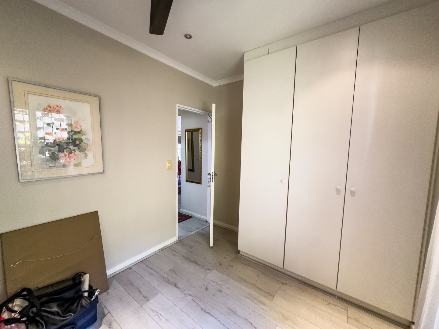 The open-plan lounge and dining area connect seamlessly to a modern kitchen with granite countertops. There’s also a separate enclosed laundry area, which opens out onto a private, covered patio—perfect for enjoying morning coffee, reading, or hosting small gatherings. The third bedroom is currently used as a study and offers flexibility for hobbies or visiting guests. The second bedroom is spacious with built-in cupboards and is conveniently located near a full bathroom with a bathtub. The main bedroom overlooks the garden and includes built-in storage, with a bathroom featuring a walk-in shower located nearby for easy access.