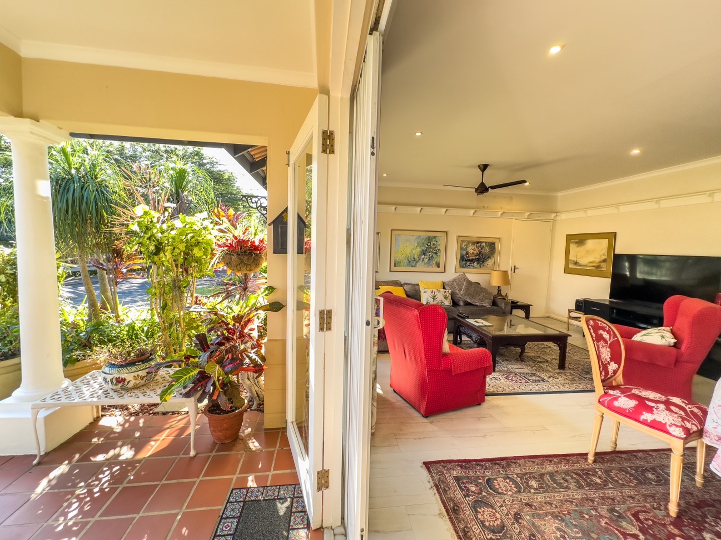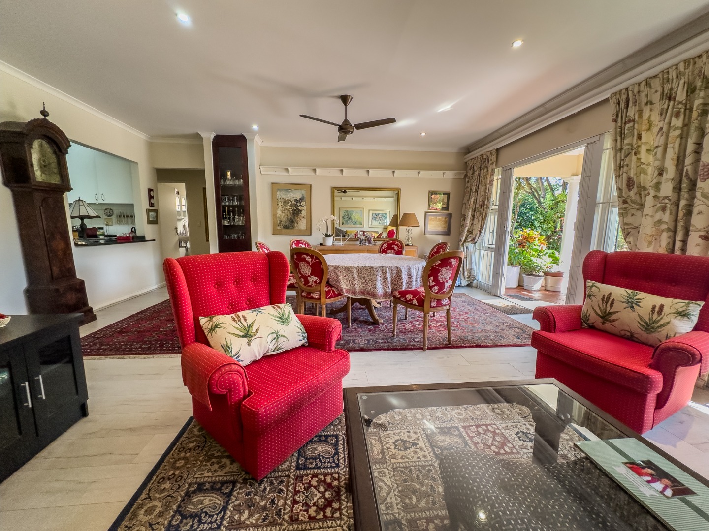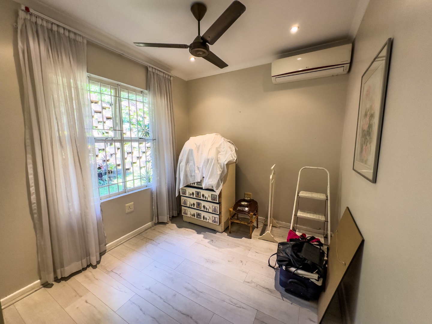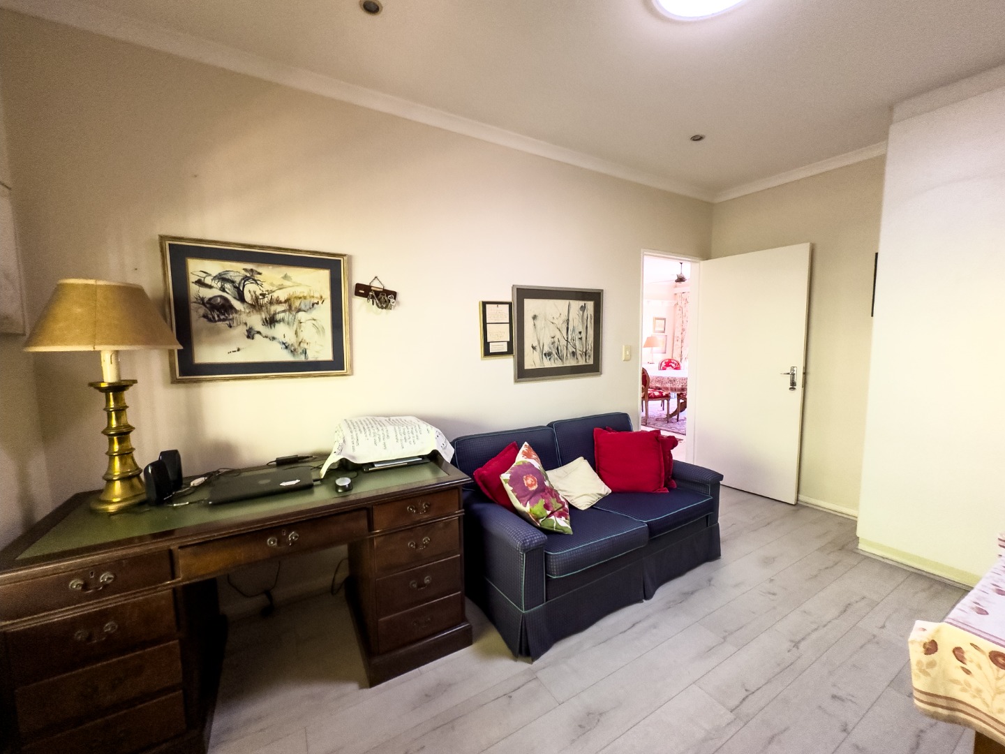 The open-plan lounge and dining area connect seamlessly to a modern kitchen with granite countertops. There’s also a separate enclosed laundry area, which opens out onto a private, covered patio—perfect for enjoying morning coffee, reading, or hosting small gatherings. The third bedroom is currently used as a study and offers flexibility for hobbies or visiting guests. The second bedroom is spacious with built-in cupboards and is conveniently located near a full bathroom with a bathtub. The main bedroom overlooks the garden and includes built-in storage, with a bathroom featuring a walk-in shower located nearby for easy access.