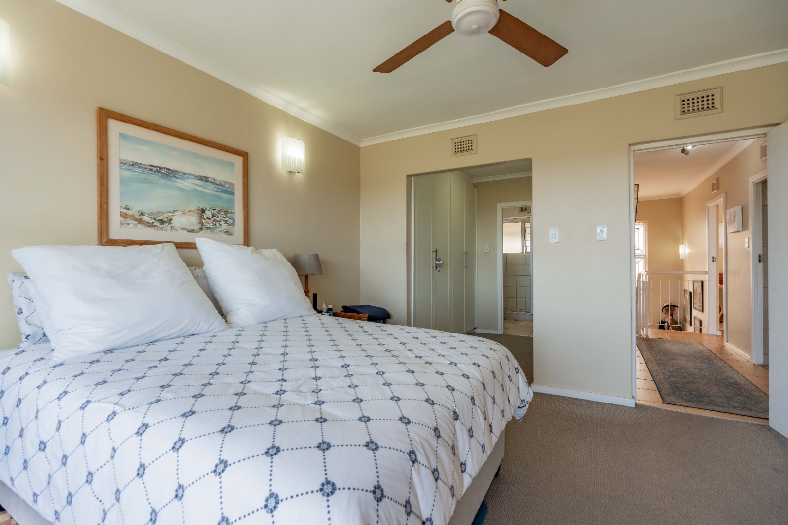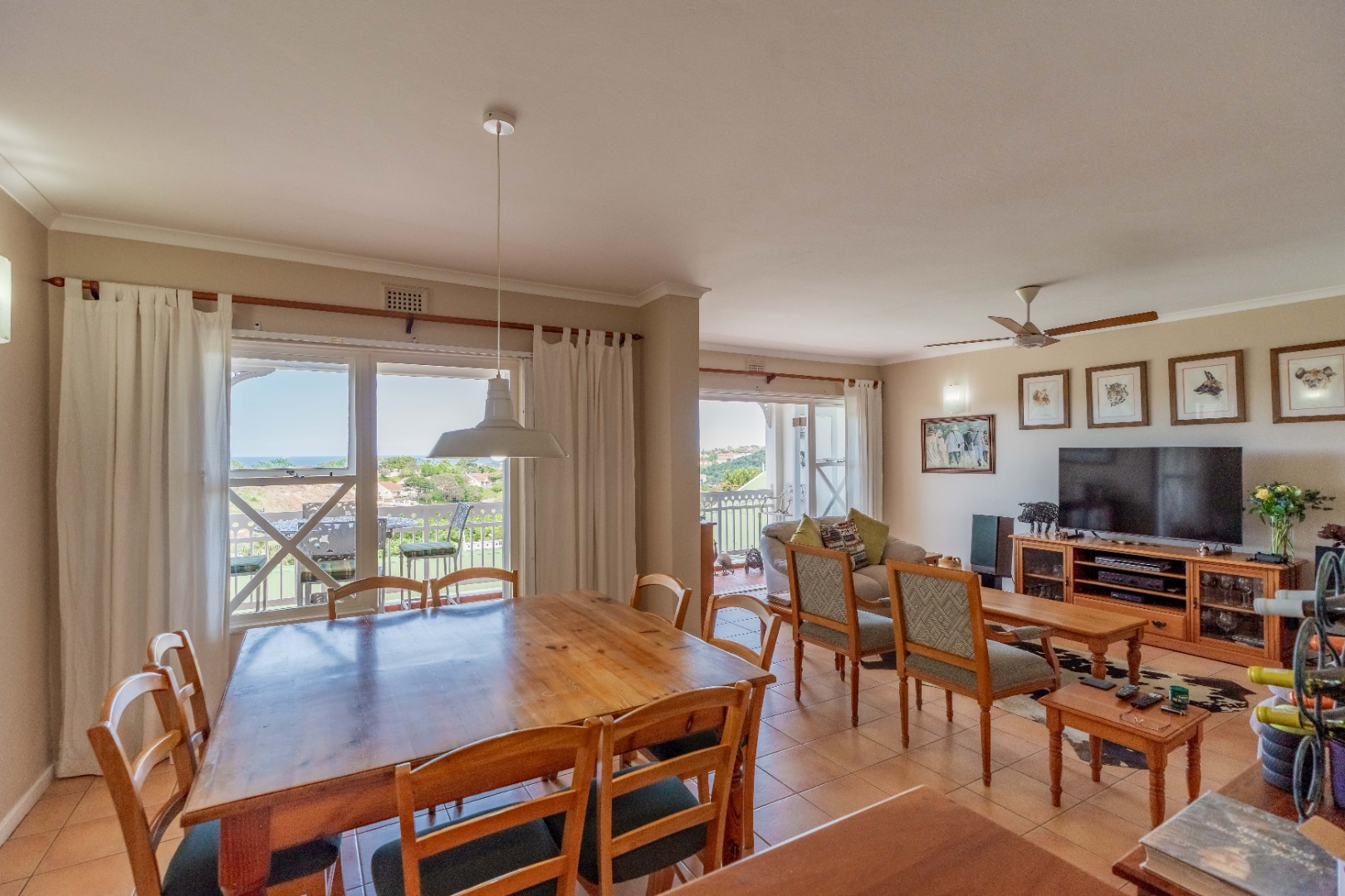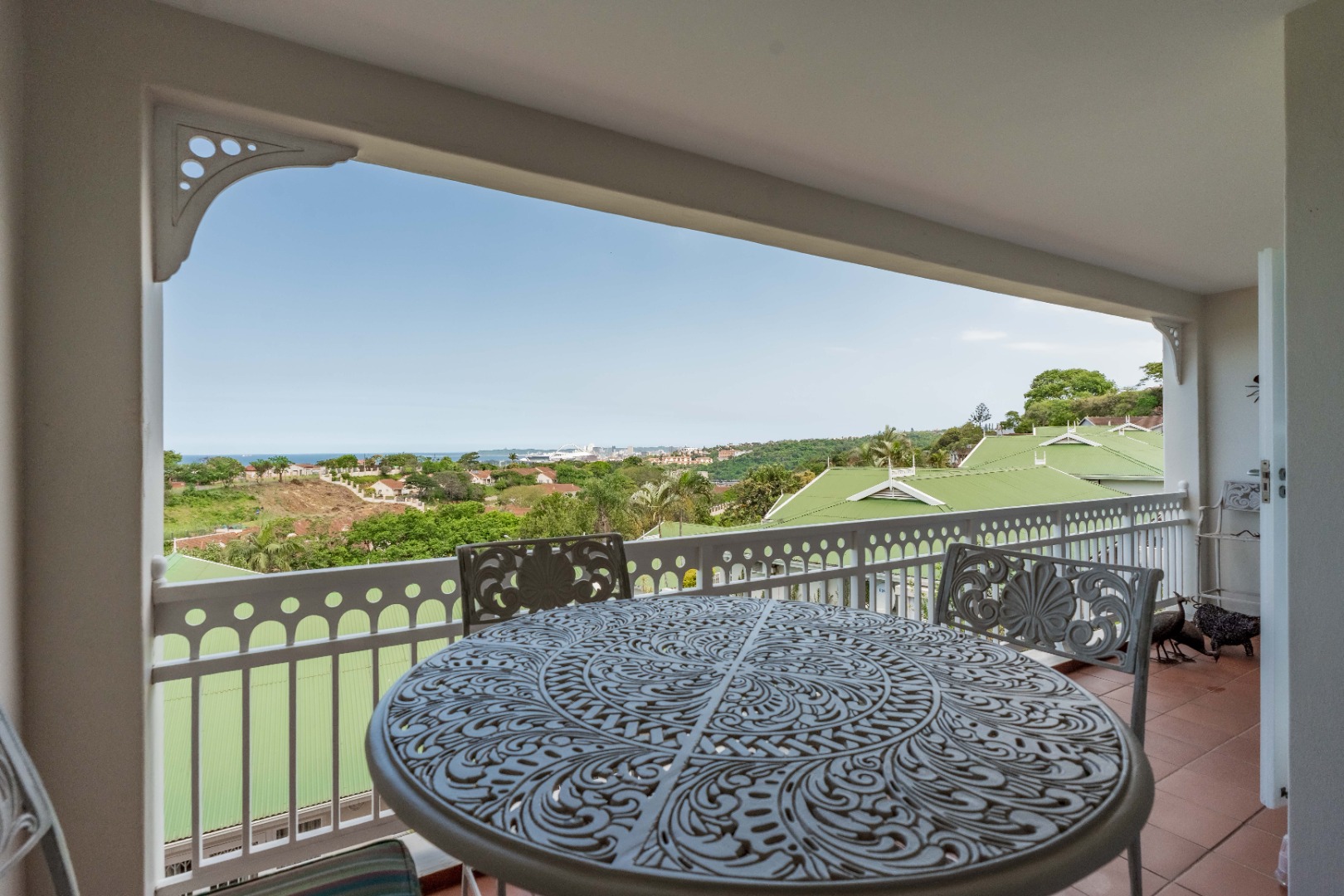 The main living area boasts an open-plan lounge and dining room that flows seamlessly onto the balcony, perfect for soaking in the spectacular ocean and Durban views. The kitchen is modern and well-appointed, with Ceastarstone countertops and gas hob, there is a convenient guest toilet that adds practicality to this level.