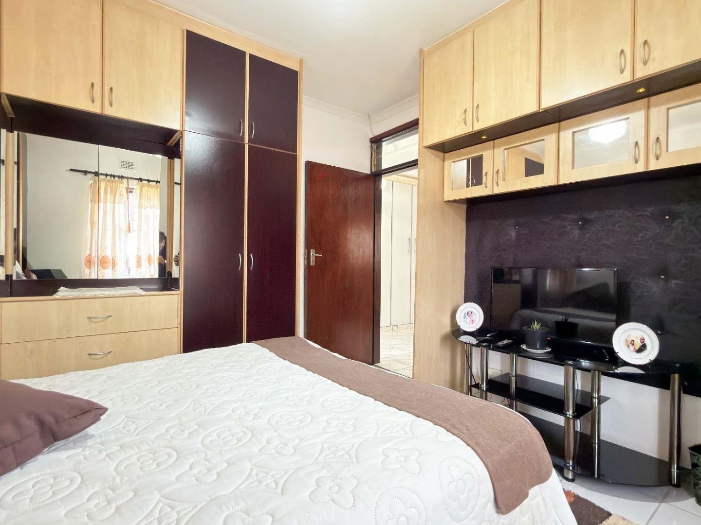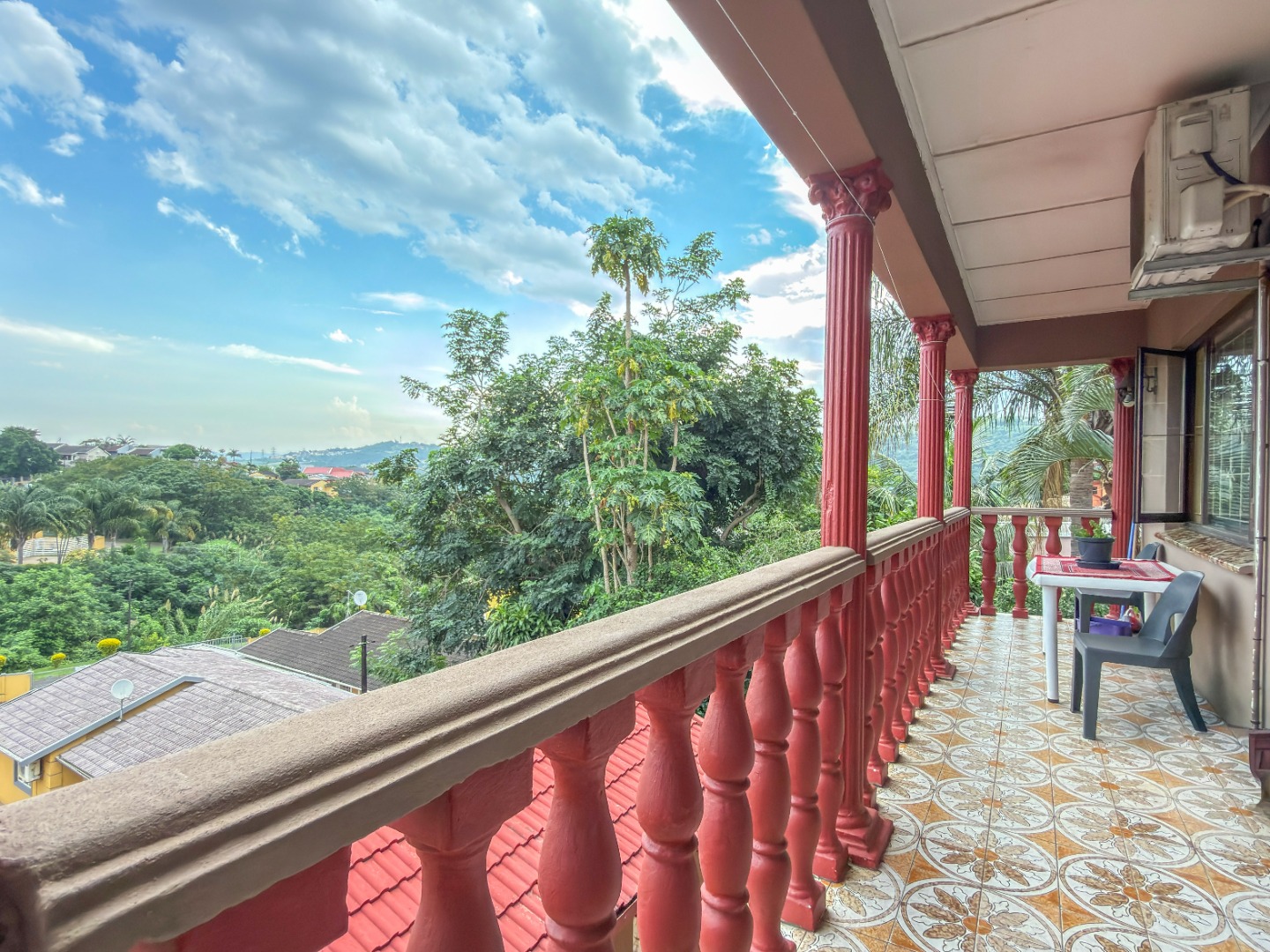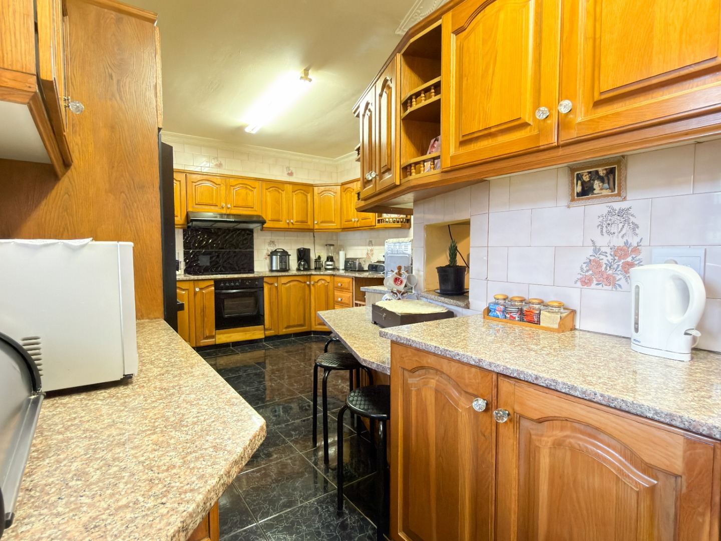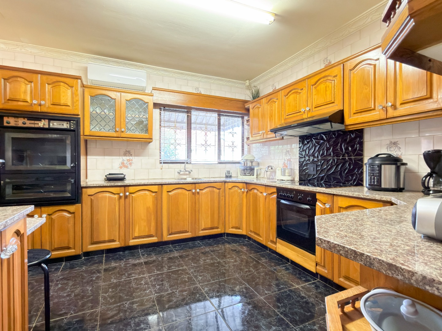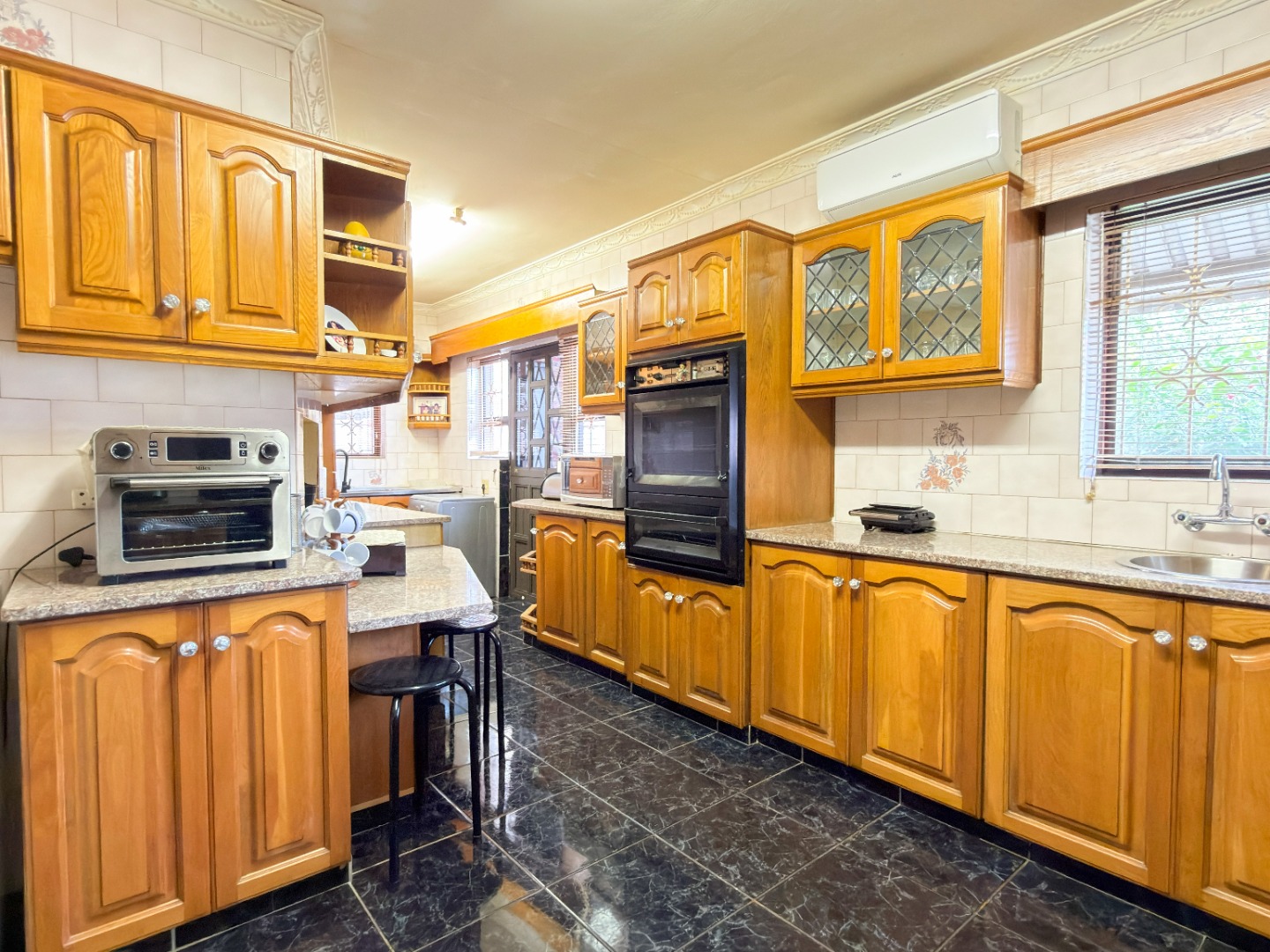 The upper level features generous bedrooms, including a main bedroom with en-suite, air-conditioning and ample built-in cupboards. Living areas are light-filled and spacious, flowing seamlessly into a fully fitted kitchen with granite countertops and a separate scullery, making everyday living both practical and comfortable.