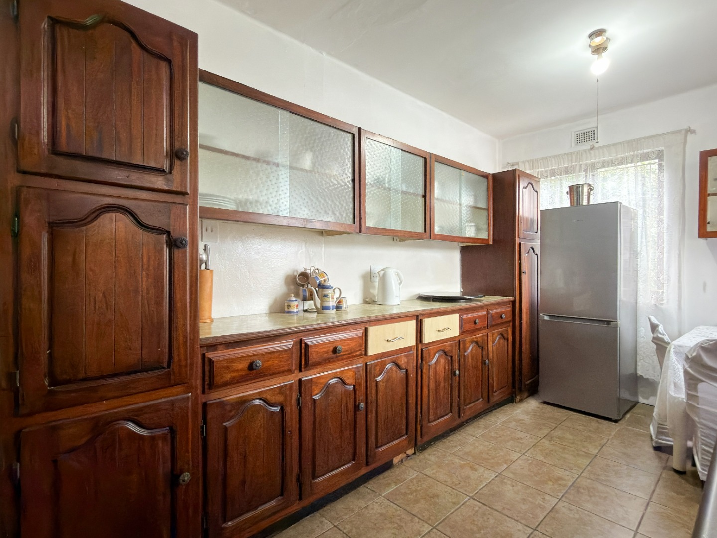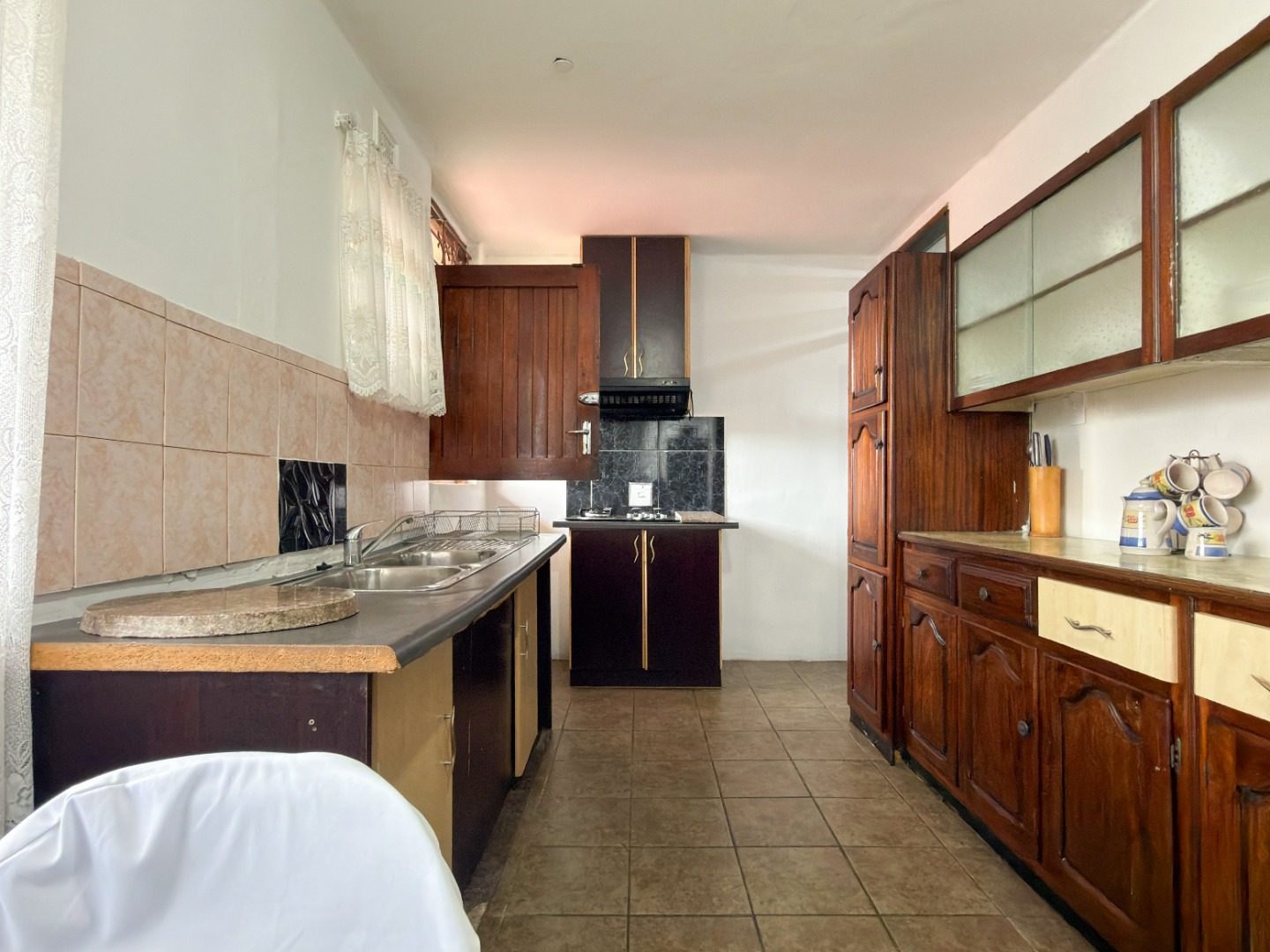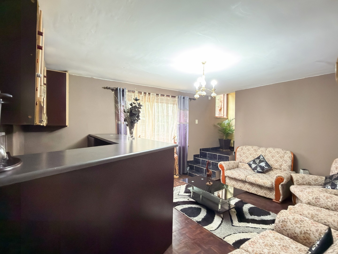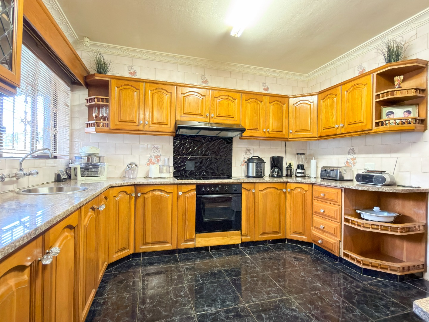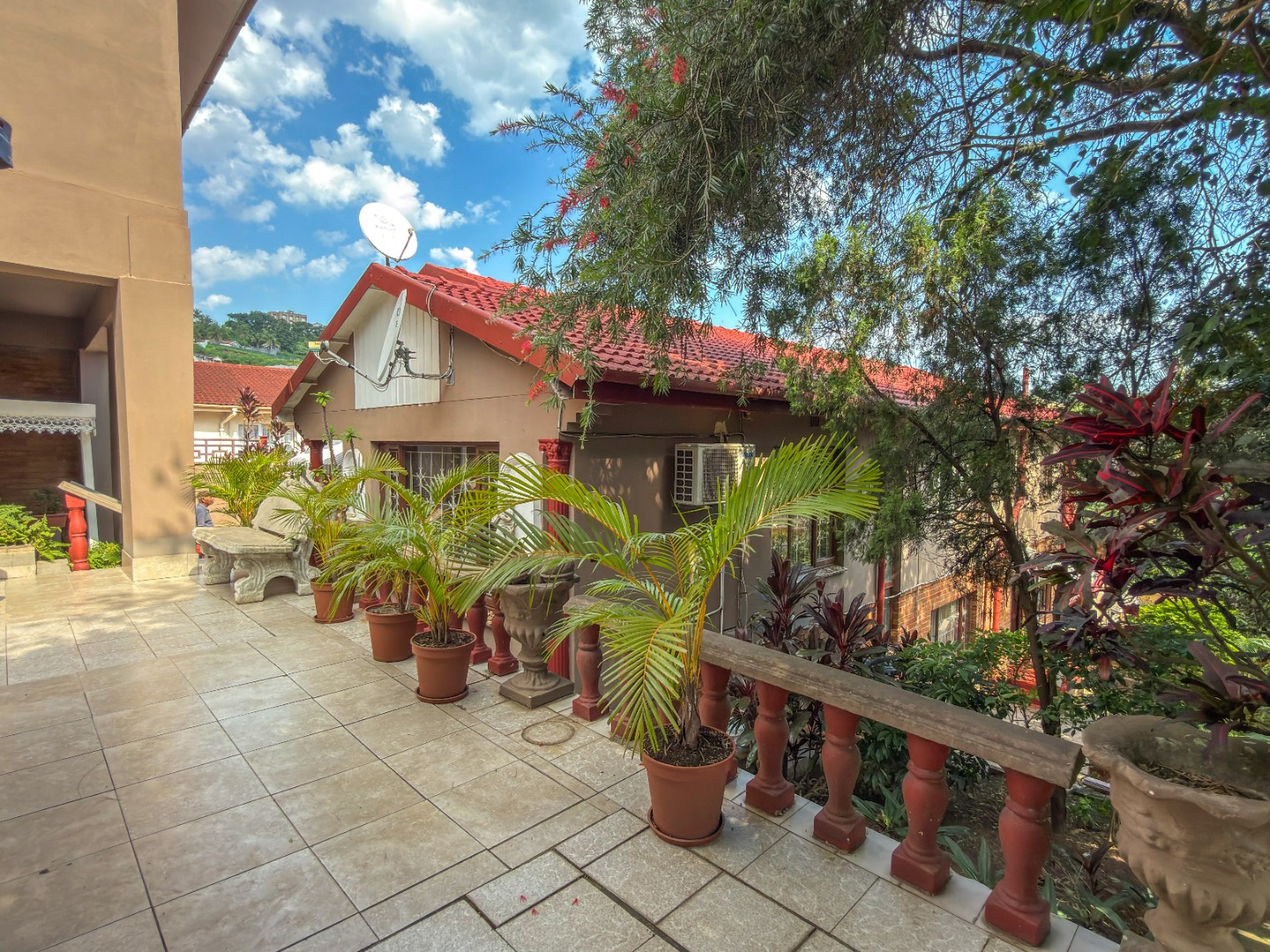 The upper level features generous bedrooms, including a main bedroom with en-suite, air-conditioning and ample built-in cupboards. Living areas are light-filled and spacious, flowing seamlessly into a fully fitted kitchen with granite countertops and a separate scullery, making everyday living both practical and comfortable.