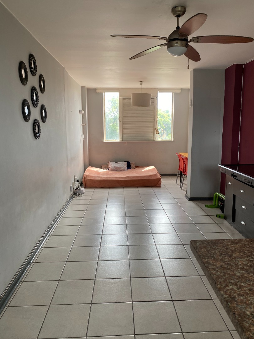 The apartment features an open-plan layout, encompassing a comfortable lounge and a dedicated dining area, providing a versatile living space. The functional kitchen is designed for practicality, offering natural light, ample counter space, and essential provisions for appliances such as a washing machine and refrigerator. Tiled flooring extends throughout the living areas, ensuring easy maintenance.