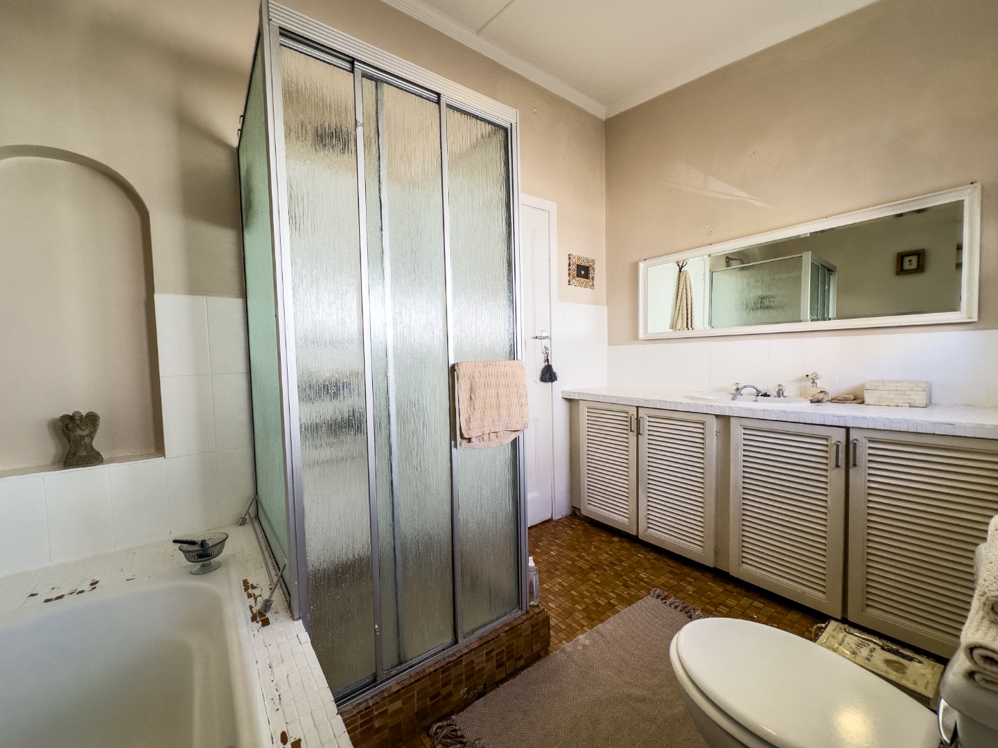 The full bathroom includes all the essentials: a shower, bathtub, toilet, hand basin, and additional cupboard space for storage.
