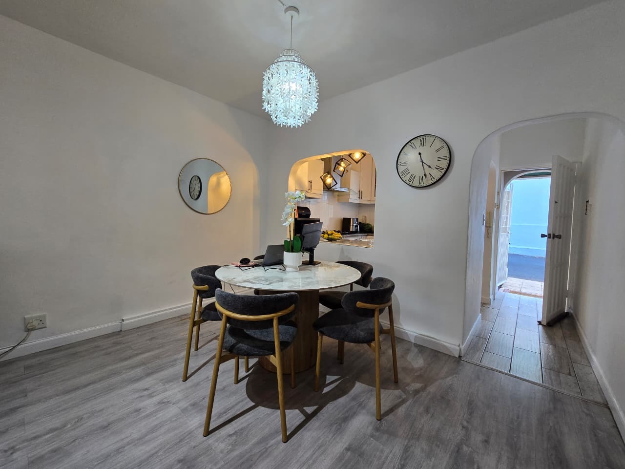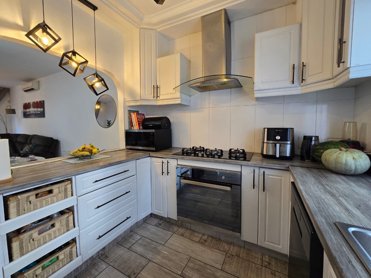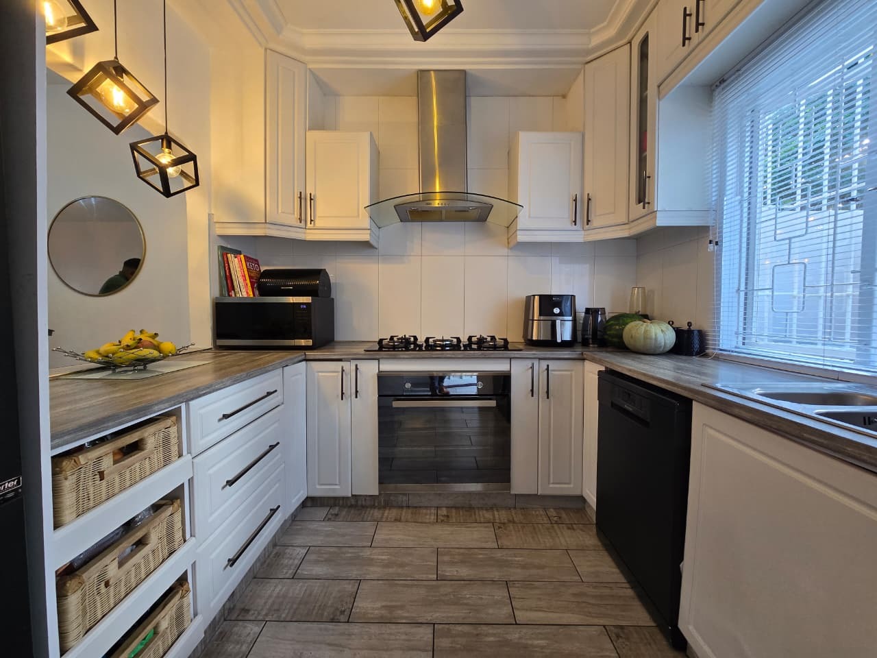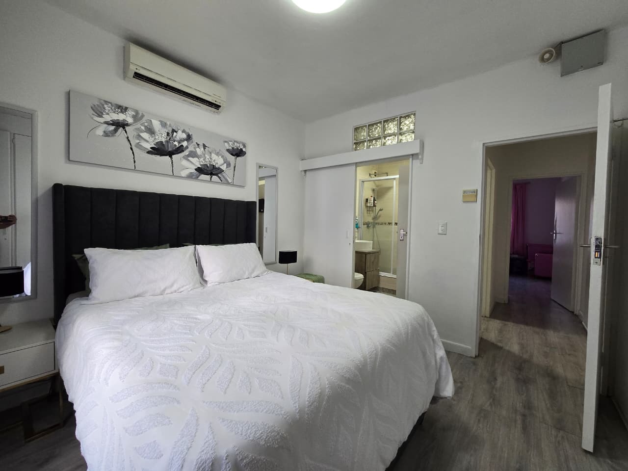 This modern 96 sqm apartment, located within a secure complex in the suburban heart of Bulwer, Durban, offers comfortable and contemporary living. The open-plan design seamlessly connects the lounge and dining areas, creating an inviting atmosphere for relaxation and entertaining. The stylish kitchen is a highlight, featuring modern white cabinetry. Elegant wood-look tiled flooring and chic pendant lighting enhance the sophisticated aesthetic throughout these communal spaces.