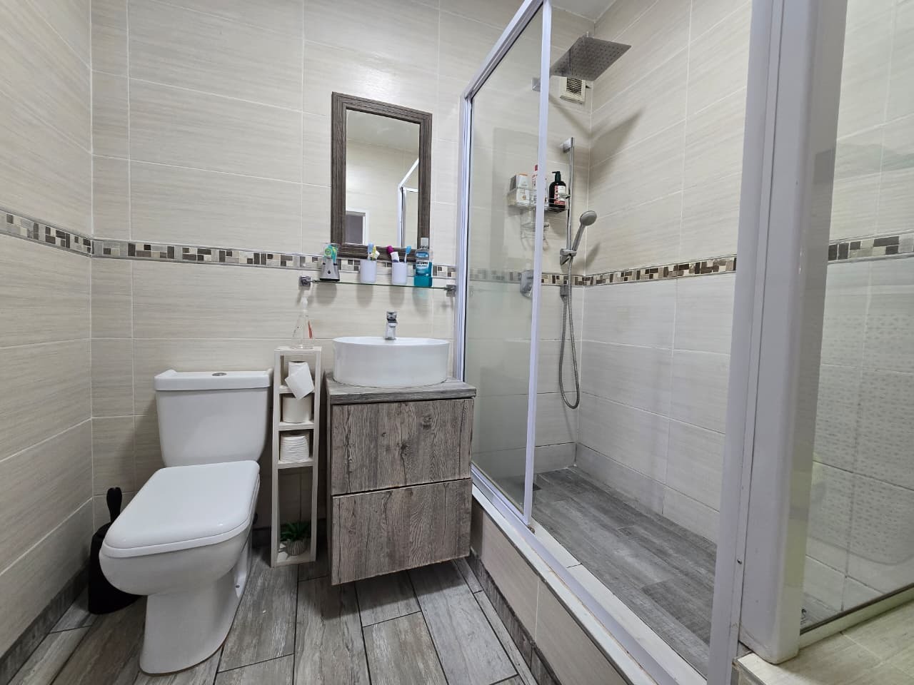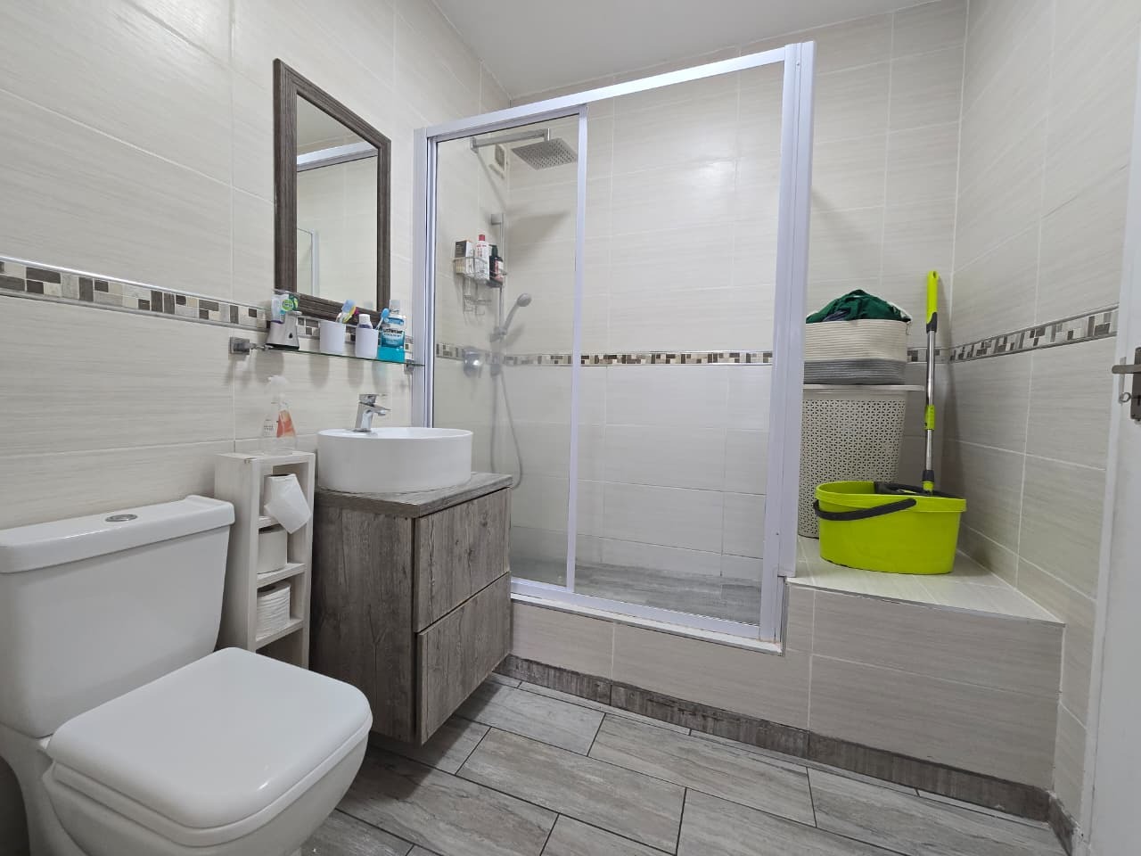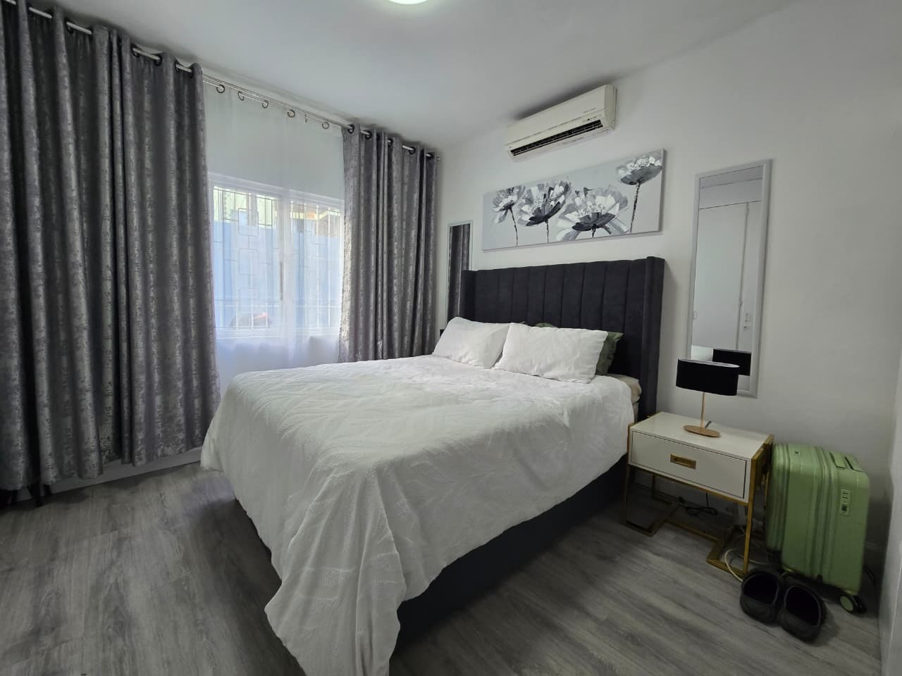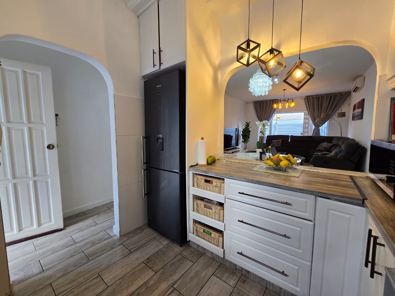 This modern 96 sqm apartment, located within a secure complex in the suburban heart of Bulwer, Durban, offers comfortable and contemporary living. The open-plan design seamlessly connects the lounge and dining areas, creating an inviting atmosphere for relaxation and entertaining. The stylish kitchen is a highlight, featuring modern white cabinetry. Elegant wood-look tiled flooring and chic pendant lighting enhance the sophisticated aesthetic throughout these communal spaces.