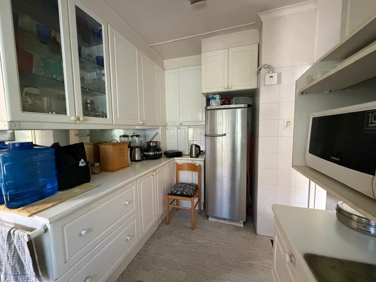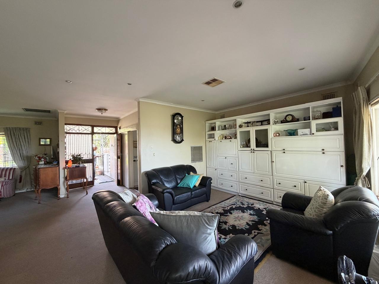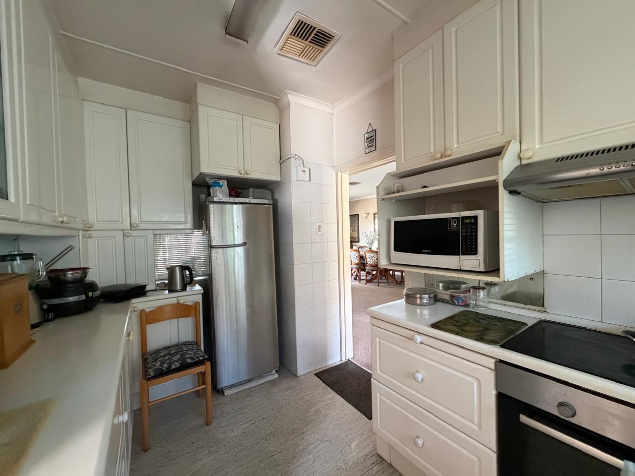 The functional kitchen is equipped with white cabinetry, integrated oven and hob, and a stainless steel refrigerator, providing ample storage. The property features three well-proportioned bedrooms and three bathrooms, ensuring comfortable accommodation. Practical amenities include two garages, additional parking, and a covered carport. The floor size is 206 square metres.