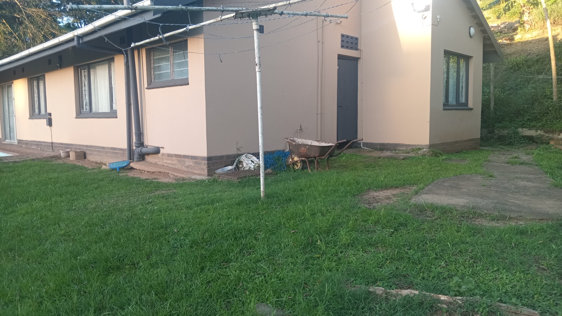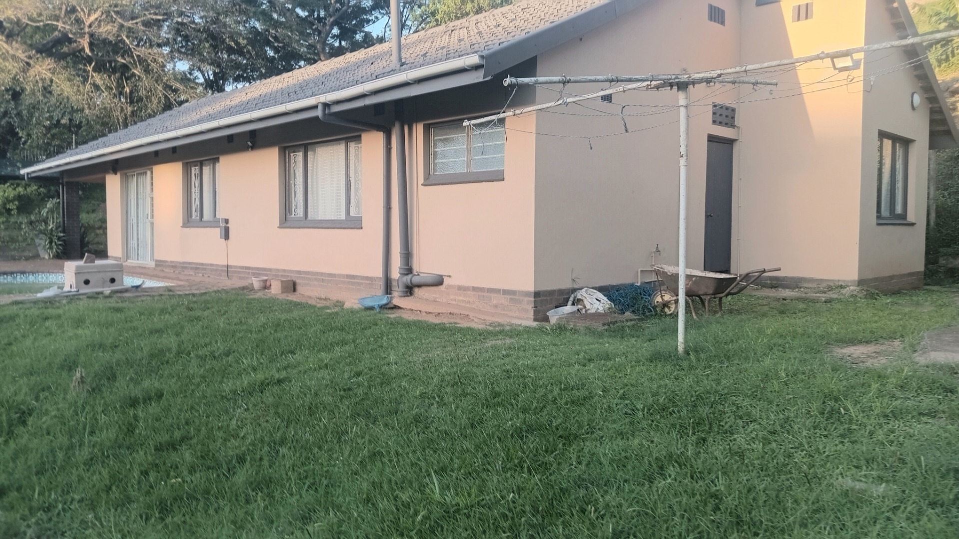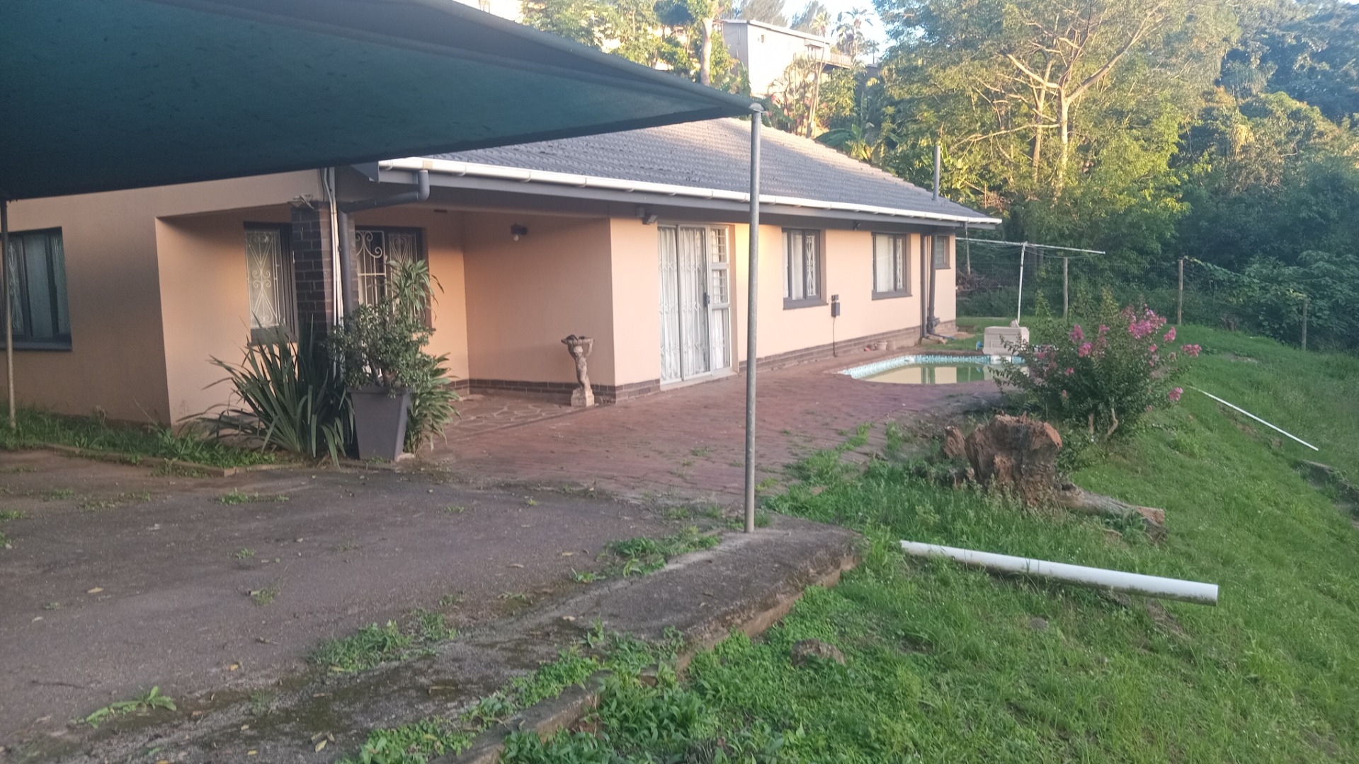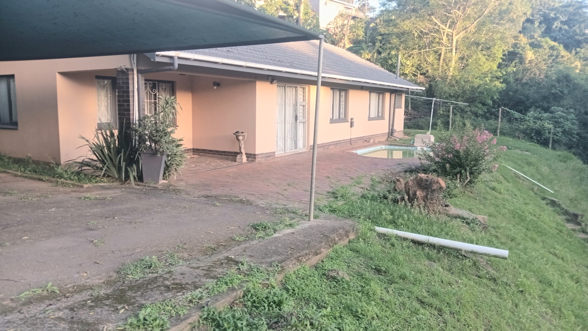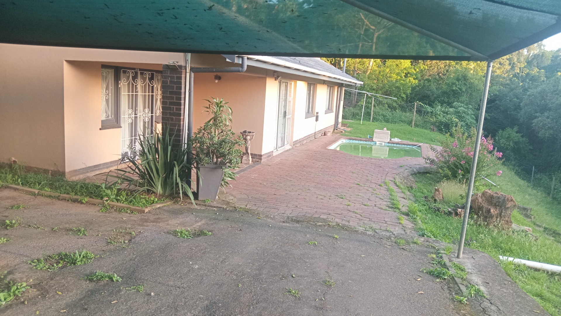 Set on a substantial 1729 sqm erf, the outdoor areas offer significant potential. A private patio and paved areas provide space for relaxation, while the natural green surroundings create a serene backdrop. The property boasts a swimming pool, currently requiring maintenance, which could become a sparkling oasis with some attention. A carport and four dedicated parking spaces cater to your vehicle needs. The light-coloured exterior with dark trim and a tiled roof offers a solid foundation, though the expansive grounds are ready for landscaping to enhance kerb appeal.
