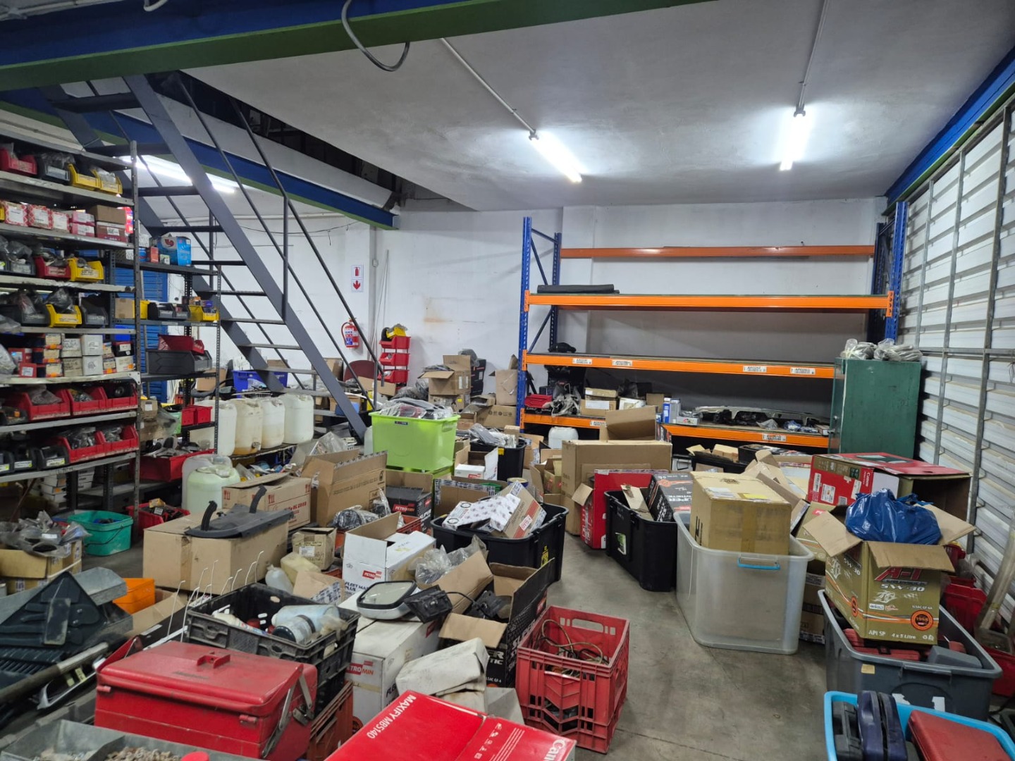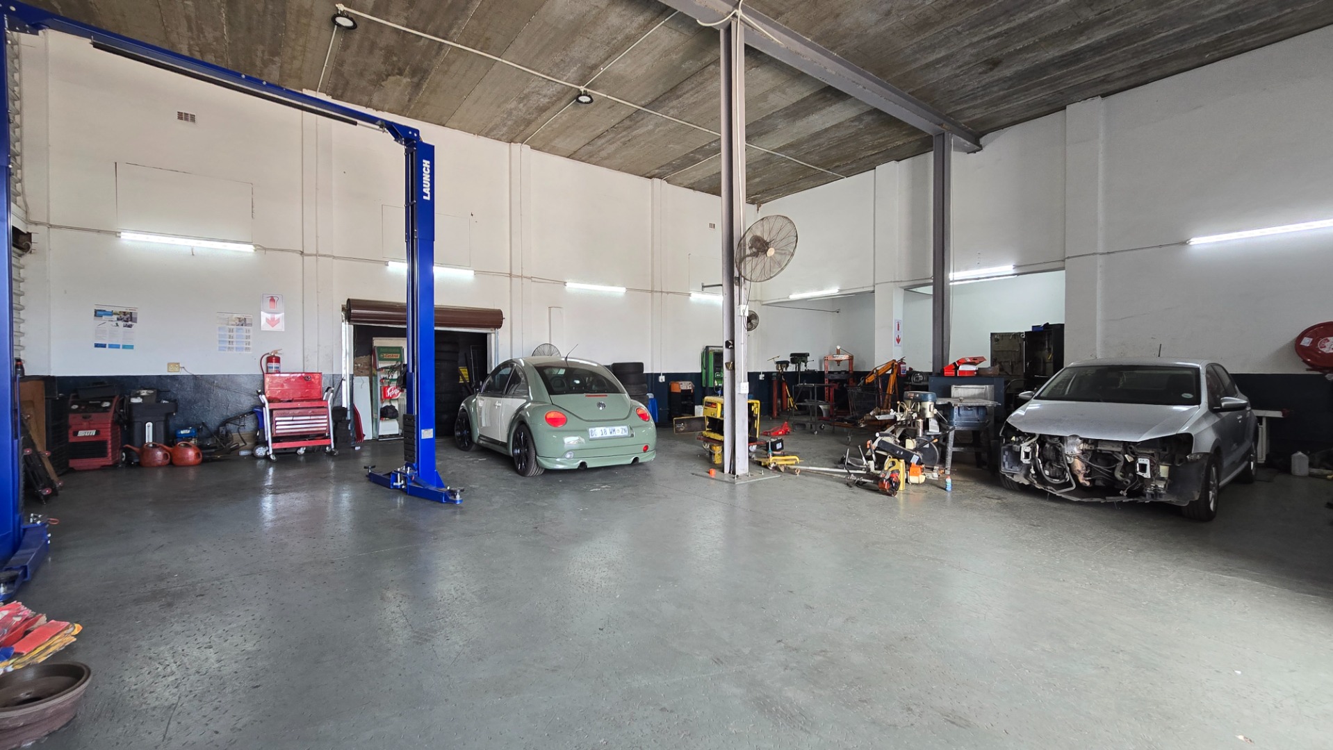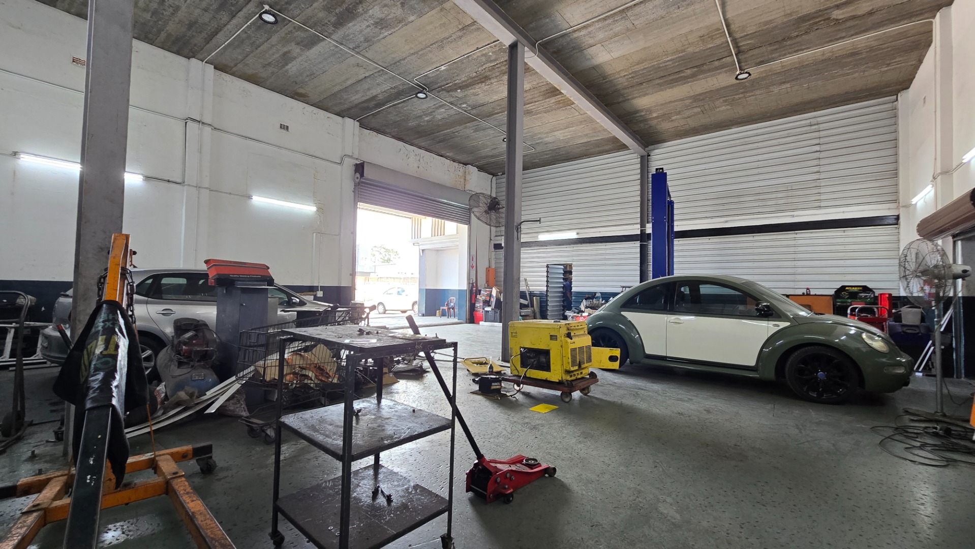 The property features a dedicated two-story commercial building complemented by an extensive workshop/garage area. Operational efficiency is enhanced by multiple garage bays, large roller shutter doors, and a covered open-front workspace, complete with a visible vehicle lift. Internally, the unit boasts a spacious open-plan layout with high industrial ceilings and durable concrete flooring, alongside a functional kitchen and a single bathroom. Existing IT infrastructure, including a server rack, is also present.