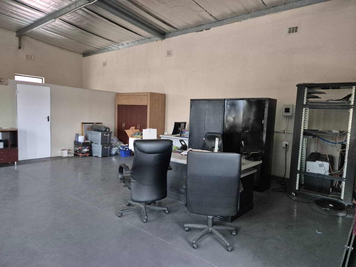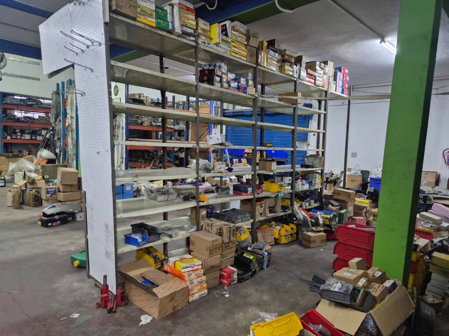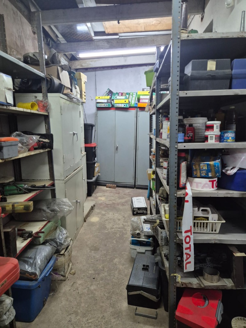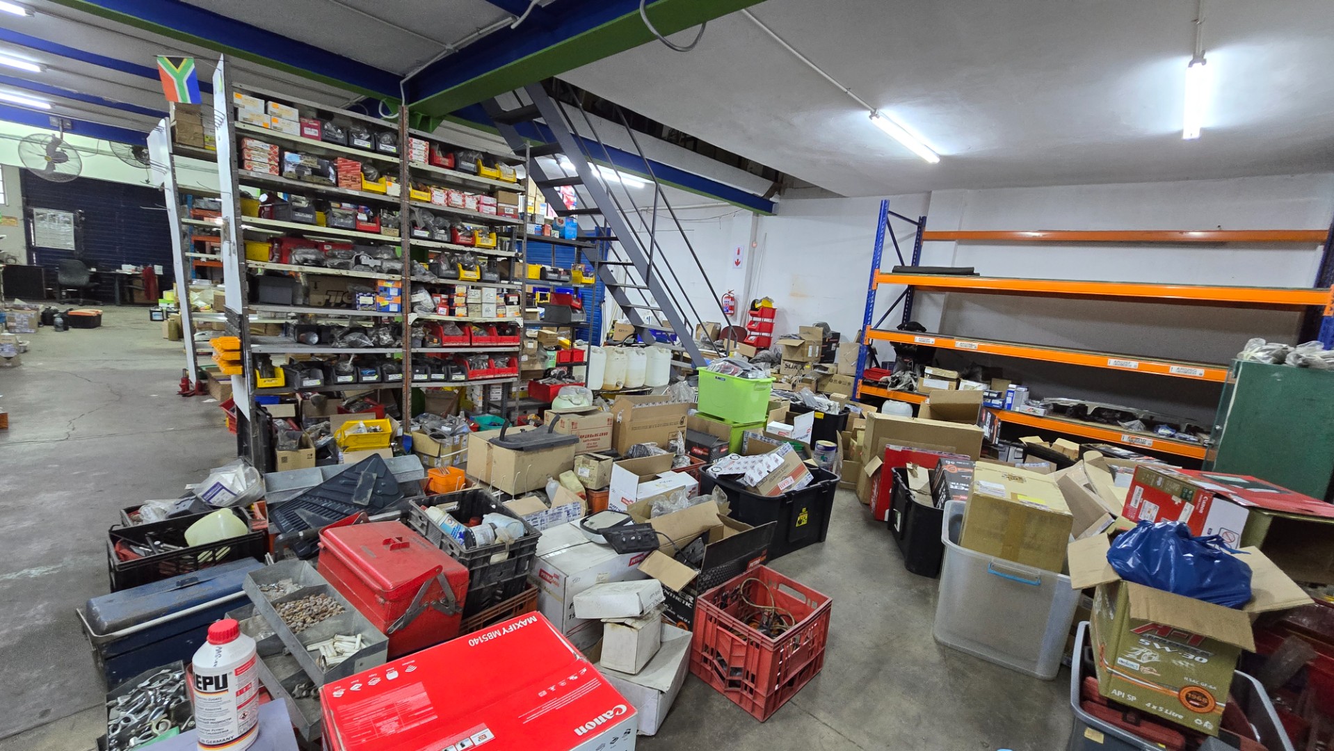 The property features a dedicated two-story commercial building complemented by an extensive workshop/garage area. Operational efficiency is enhanced by multiple garage bays, large roller shutter doors, and a covered open-front workspace, complete with a visible vehicle lift. Internally, the unit boasts a spacious open-plan layout with high industrial ceilings and durable concrete flooring, alongside a functional kitchen and a single bathroom. Existing IT infrastructure, including a server rack, is also present.