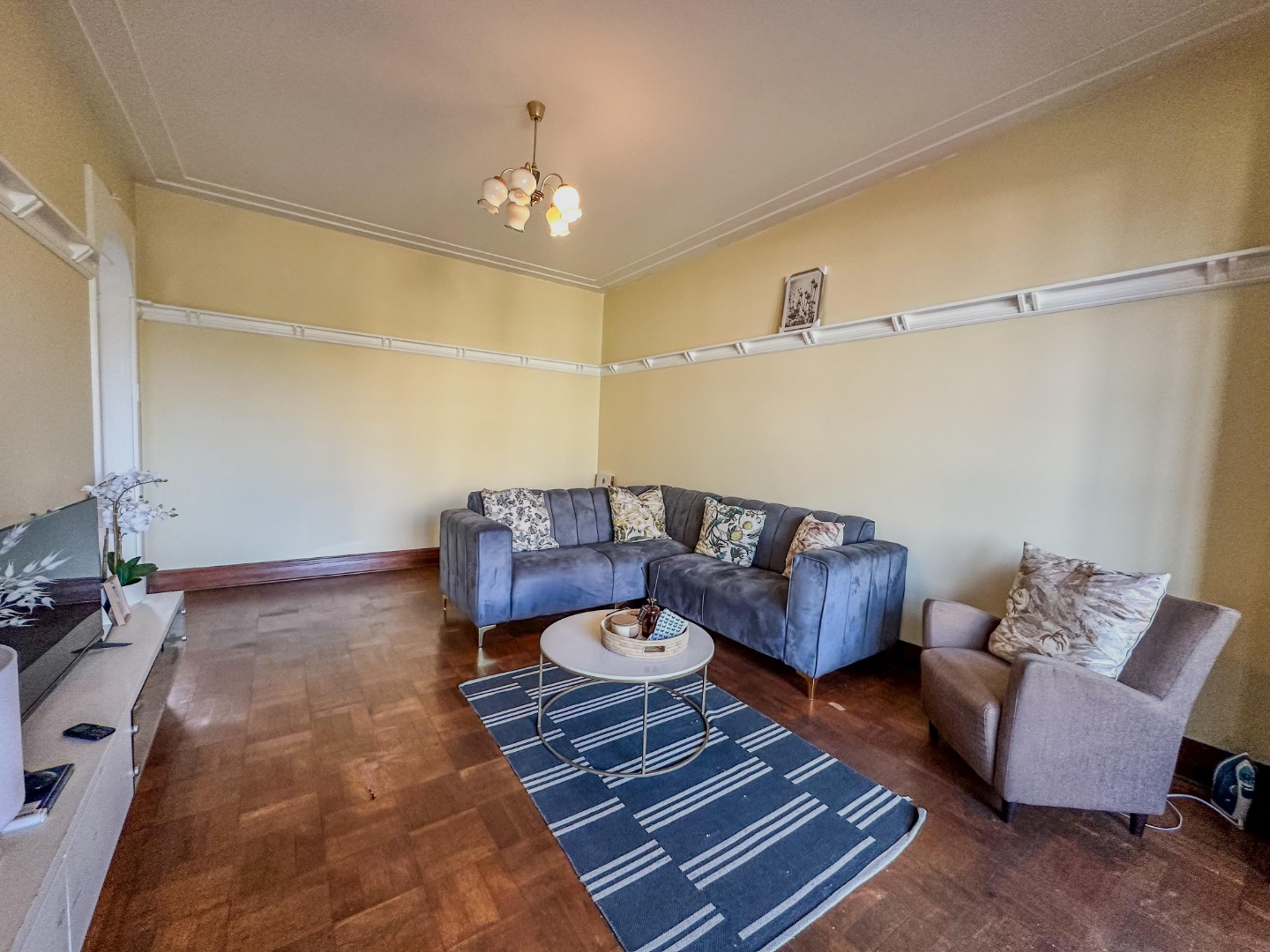 Spanning 84 square meters, this apartment features a practical layout designed for comfortable living. The spacious lounge, complete with parquet wood flooring and ample natural light from a large window, provides an inviting space for relaxation. Adjacent is a dedicated dining room, perfect for meals and entertaining. The functional kitchen is equipped with white cabinetry, tiled flooring, a double stainless steel sink, and includes space for a washing machine, ensuring everyday convenience.