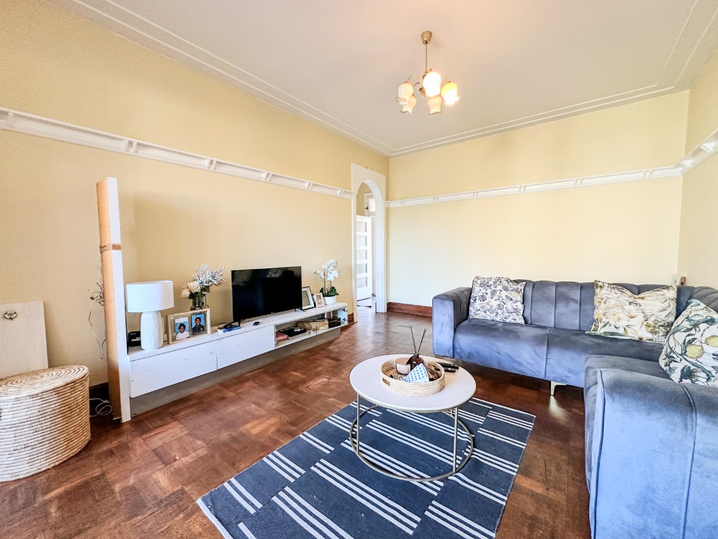 Spanning 84 square meters, this apartment features a practical layout designed for comfortable living. The spacious lounge, complete with parquet wood flooring and ample natural light from a large window, provides an inviting space for relaxation. Adjacent is a dedicated dining room, perfect for meals and entertaining. The functional kitchen is equipped with white cabinetry, tiled flooring, a double stainless steel sink, and includes space for a washing machine, ensuring everyday convenience.