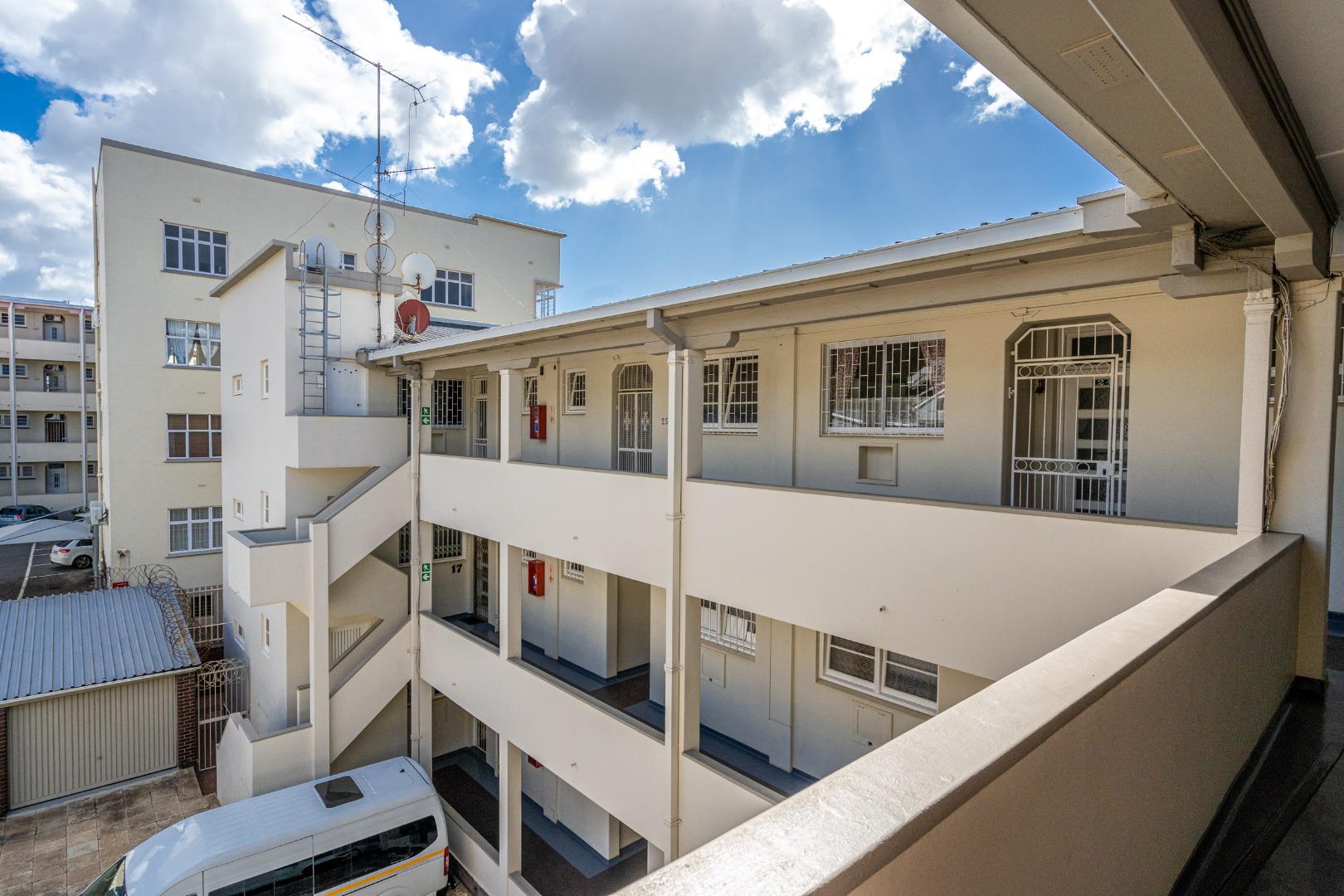 Nestled in the well-established suburb of Essenwood, Durban, this apartment offers a prime residential opportunity. The building presents an attractive, well-maintained exterior with distinctive bay windows, set within a lush, green environment. Its location provides a quiet residential street ambiance, yet remains connected to the vibrant city, offering a blend of tranquility and urban convenience.
