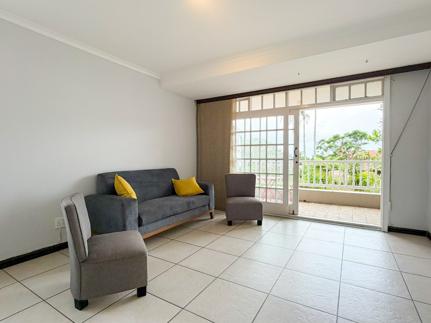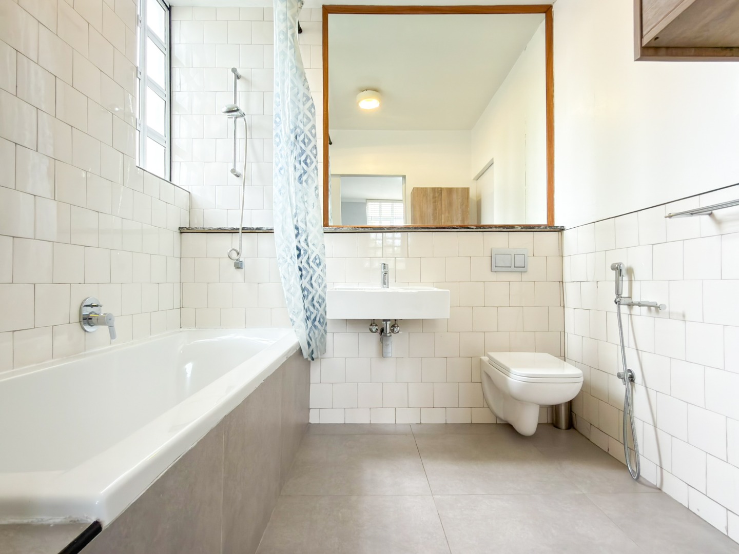 The second bathroom is fitted with a shower, basin, and toilet. The apartment is fully tiled throughout, offering a clean and modern finish.