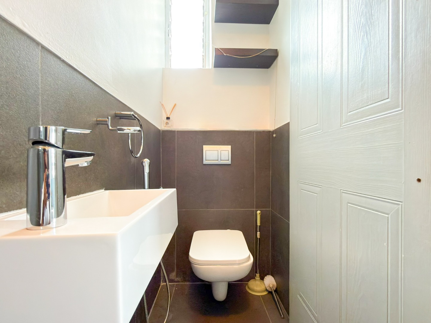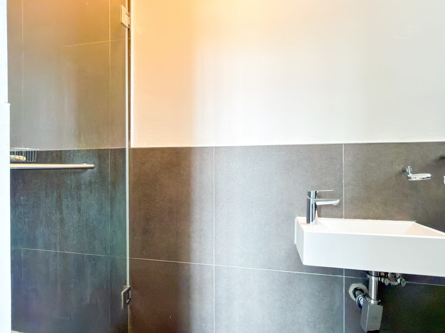 The second bathroom is fitted with a shower, basin, and toilet. The apartment is fully tiled throughout, offering a clean and modern finish.