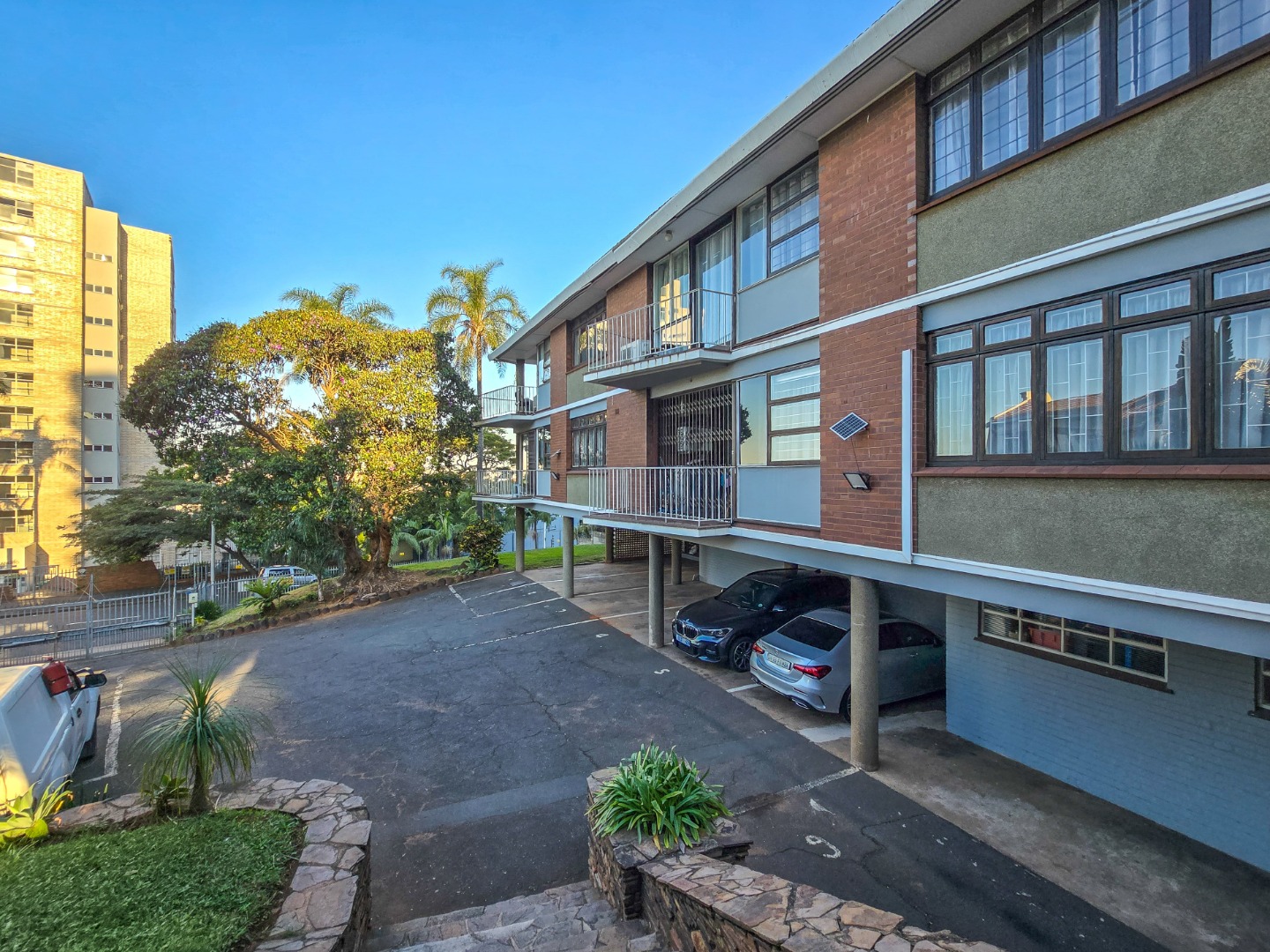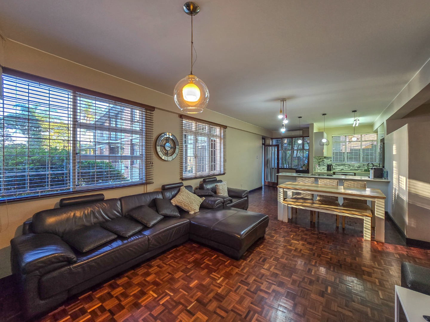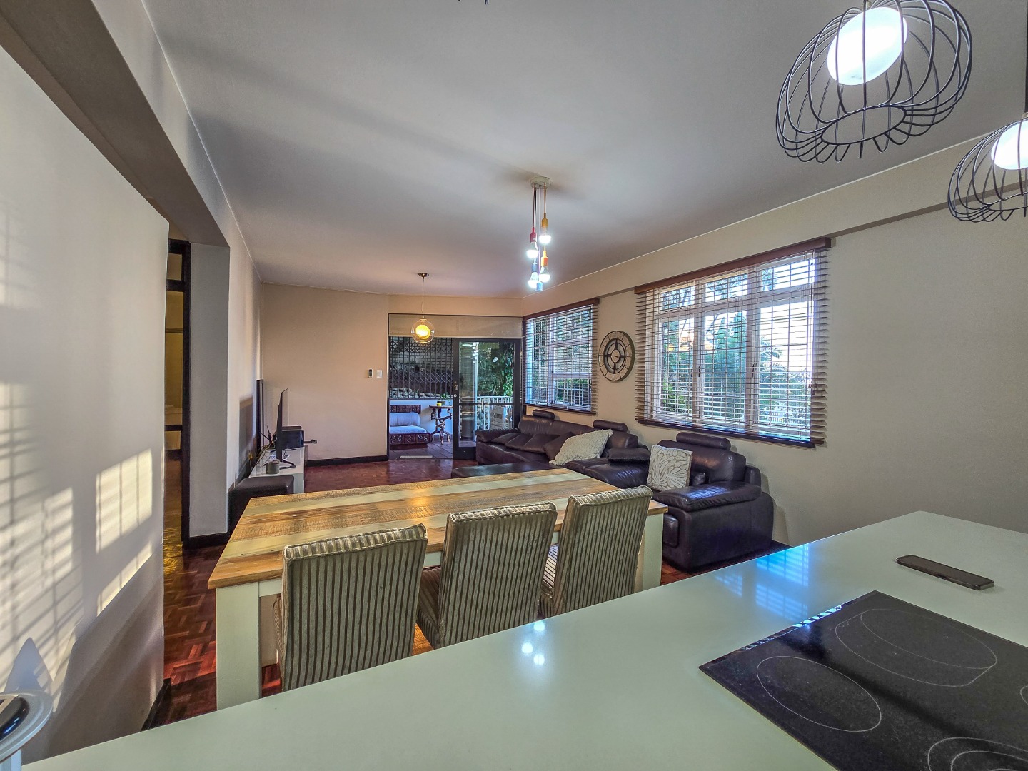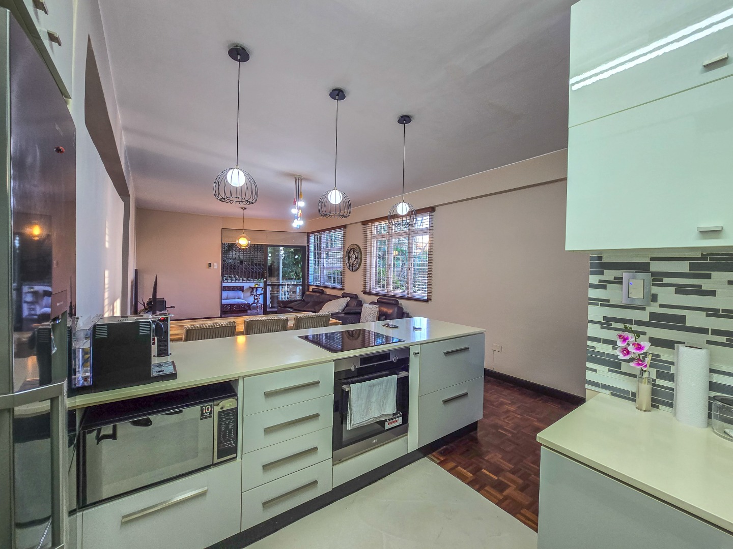 Step into this inviting 102 sqm apartment, offering a seamless open-plan design ideal for contemporary living in Essenwood, Durban. The heart of this home is its modern kitchen, boasting sleek gloss white and grey cabinetry, stainless steel appliances, and a stylish mosaic tile backsplash. A spacious island with an integrated oven and microwave, complemented by contemporary pendant lighting, creates a functional and aesthetic focal point. This culinary space flows effortlessly into the dining area and a comfortable lounge, all unified by attractive parquet wood flooring and abundant natural light from large windows and sliding doors. The residence features two well-appointed bedrooms, providing comfortable private retreats. The main bedroom benefits from an en-suite bathroom, offering convenience and privacy. A second bathroom serves the additional bedroom and guests, ensuring ample facilities. Air conditioning throughout the apartment guarantees comfort during Durban's warmer months. Enjoy the South African climate with direct access to an outdoor patio and multiple balconies, perfect for relaxation or entertaining. The property also includes a dedicated braai room, enhancing your outdoor living experience. Practical amenities are well-catered for with a single garage and two additional parking spaces, providing secure accommodation for vehicles within the complex. Security is paramount, with features such as an access gate, electric fencing, intercom system, and burglar bars providing peace of mind. The multi-story building presents a distinctive red brick facade with large windows, offering a welcoming kerb appeal. Fibre connectivity is available, ensuring high-speed internet access. Located in the desirable Essenwood suburb of Durban, this property offers convenient access to local amenities and urban conveniences. Key Features: * 2 Bedrooms, 2 Bathrooms (1 En-suite) * Modern Open-Plan Kitchen * Spacious Lounge & Dining Area * Private Patio & Balconies * Dedicated Braai Room * 1 Garage & 2 Additional Parkings * Air Conditioning * Fibre Ready * Enhanced Security Features