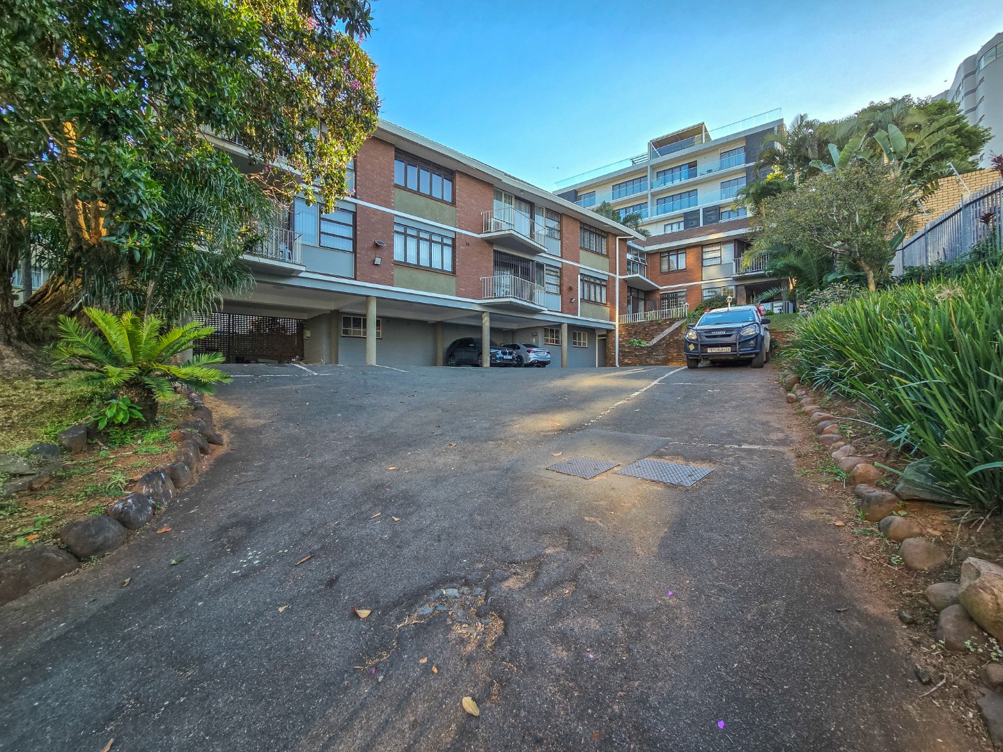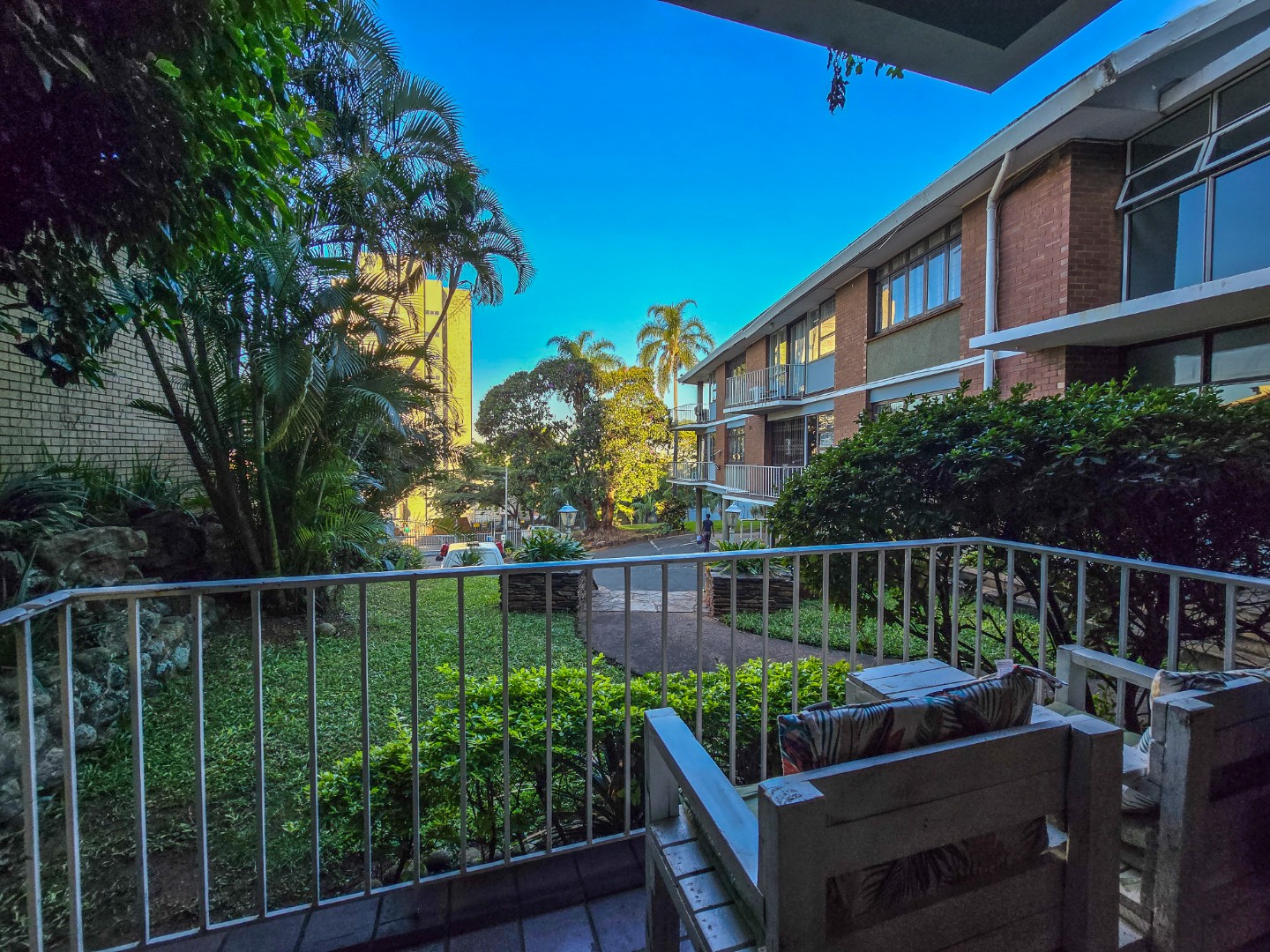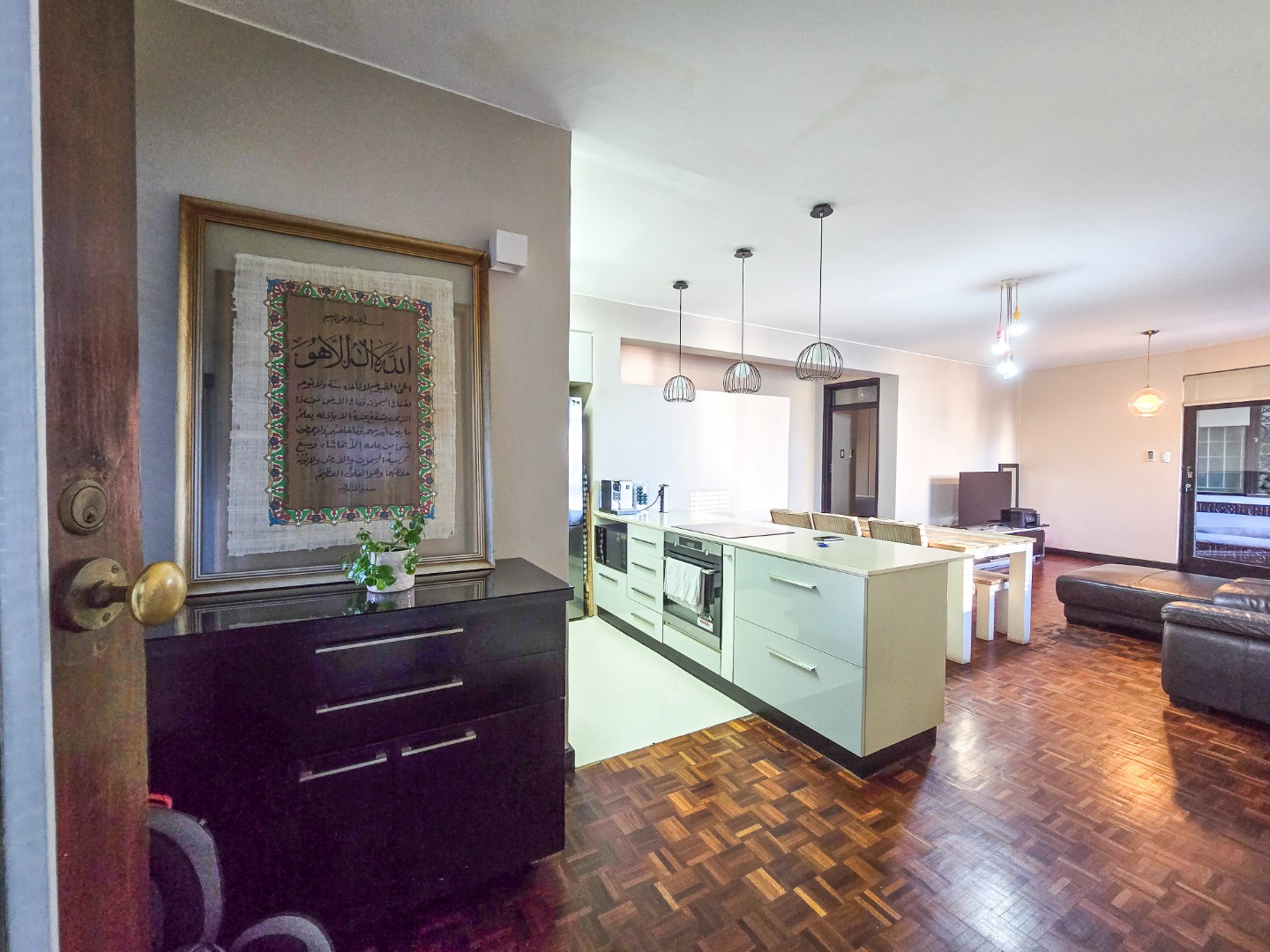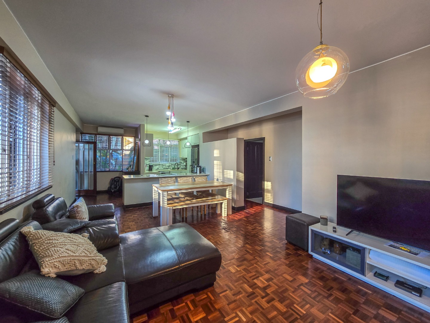 Step into this inviting 102 sqm apartment, offering a seamless open-plan design ideal for contemporary living in Essenwood, Durban. The heart of this home is its modern kitchen, boasting sleek gloss white and grey cabinetry, stainless steel appliances, and a stylish mosaic tile backsplash. A spacious island with an integrated oven and microwave, complemented by contemporary pendant lighting, creates a functional and aesthetic focal point. This culinary space flows effortlessly into the dining area and a comfortable lounge, all unified by attractive parquet wood flooring and abundant natural light from large windows and sliding doors. The residence features two well-appointed bedrooms, providing comfortable private retreats. The main bedroom benefits from an en-suite bathroom, offering convenience and privacy. A second bathroom serves the additional bedroom and guests, ensuring ample facilities. Air conditioning throughout the apartment guarantees comfort during Durban's warmer months. Enjoy the South African climate with direct access to an outdoor patio and multiple balconies, perfect for relaxation or entertaining. The property also includes a dedicated braai room, enhancing your outdoor living experience. Practical amenities are well-catered for with a single garage and two additional parking spaces, providing secure accommodation for vehicles within the complex. Security is paramount, with features such as an access gate, electric fencing, intercom system, and burglar bars providing peace of mind. The multi-story building presents a distinctive red brick facade with large windows, offering a welcoming kerb appeal. Fibre connectivity is available, ensuring high-speed internet access. Located in the desirable Essenwood suburb of Durban, this property offers convenient access to local amenities and urban conveniences. Key Features: * 2 Bedrooms, 2 Bathrooms (1 En-suite) * Modern Open-Plan Kitchen * Spacious Lounge & Dining Area * Private Patio & Balconies * Dedicated Braai Room * 1 Garage & 2 Additional Parkings * Air Conditioning * Fibre Ready * Enhanced Security Features
