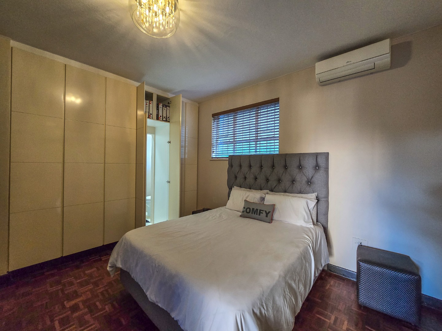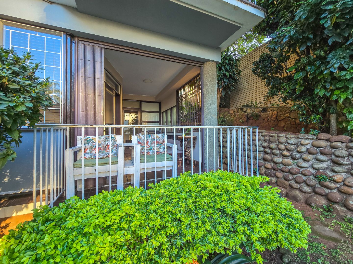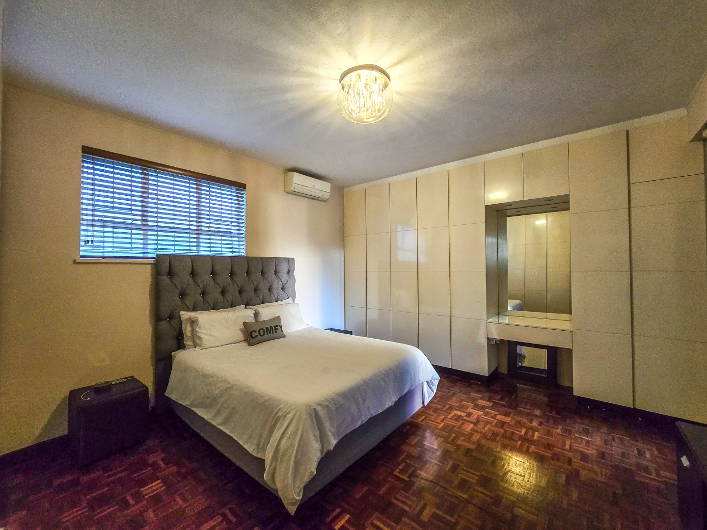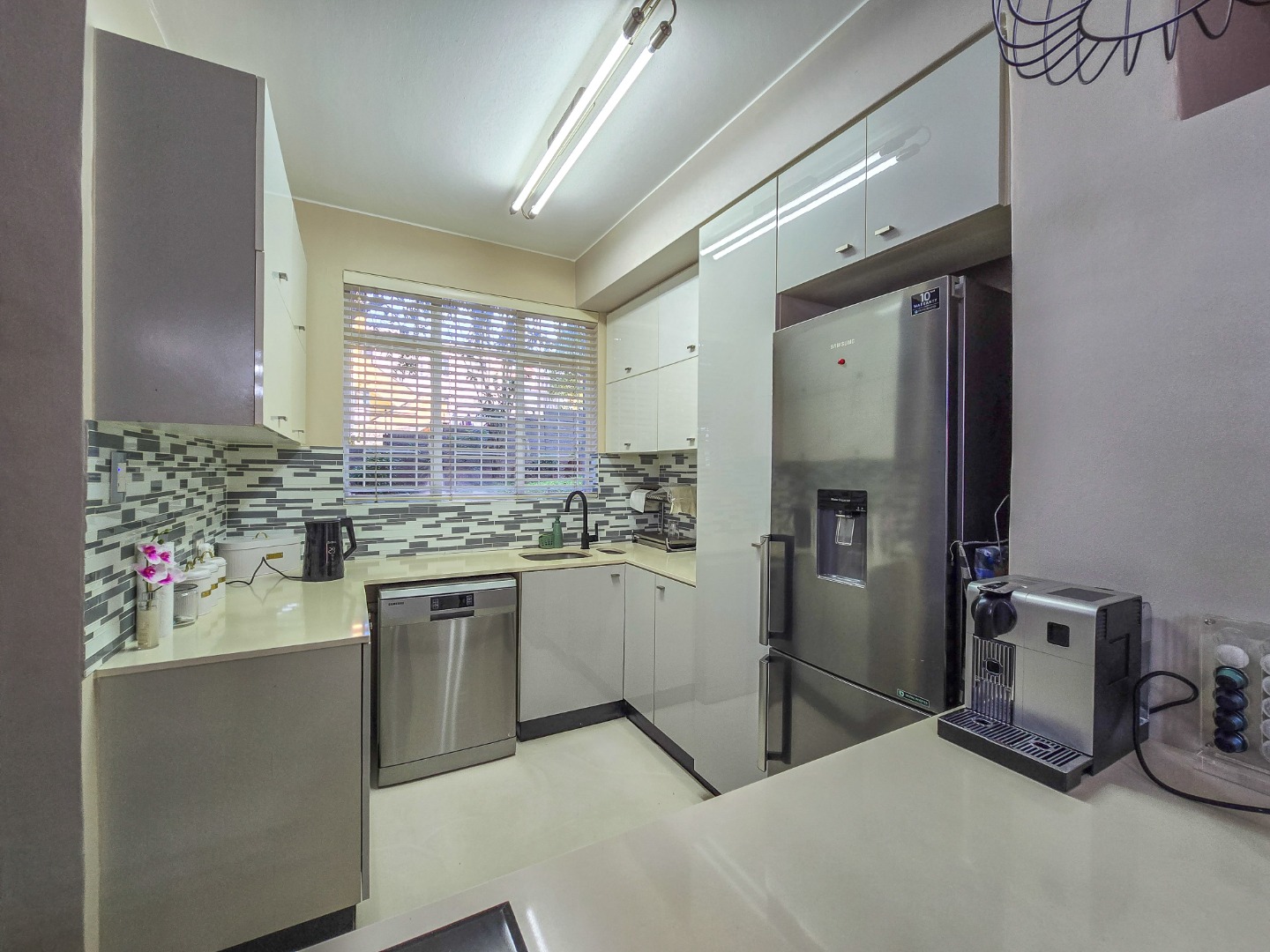 Step into this inviting 102 sqm apartment, offering a seamless open-plan design ideal for contemporary living in Essenwood, Durban. The heart of this home is its modern kitchen, boasting sleek gloss white and grey cabinetry, stainless steel appliances, and a stylish mosaic tile backsplash. A spacious island with an integrated oven and microwave, complemented by contemporary pendant lighting, creates a functional and aesthetic focal point. This culinary space flows effortlessly into the dining area and a comfortable lounge, all unified by attractive parquet wood flooring and abundant natural light from large windows and sliding doors. The residence features two well-appointed bedrooms, providing comfortable private retreats. The main bedroom benefits from an en-suite bathroom, offering convenience and privacy. A second bathroom serves the additional bedroom and guests, ensuring ample facilities. Air conditioning throughout the apartment guarantees comfort during Durban's warmer months. Enjoy the South African climate with direct access to an outdoor patio and multiple balconies, perfect for relaxation or entertaining. The property also includes a dedicated braai room, enhancing your outdoor living experience. Practical amenities are well-catered for with a single garage and two additional parking spaces, providing secure accommodation for vehicles within the complex. Security is paramount, with features such as an access gate, electric fencing, intercom system, and burglar bars providing peace of mind. The multi-story building presents a distinctive red brick facade with large windows, offering a welcoming kerb appeal. Fibre connectivity is available, ensuring high-speed internet access. Located in the desirable Essenwood suburb of Durban, this property offers convenient access to local amenities and urban conveniences. Key Features: * 2 Bedrooms, 2 Bathrooms (1 En-suite) * Modern Open-Plan Kitchen * Spacious Lounge & Dining Area * Private Patio & Balconies * Dedicated Braai Room * 1 Garage & 2 Additional Parkings * Air Conditioning * Fibre Ready * Enhanced Security Features