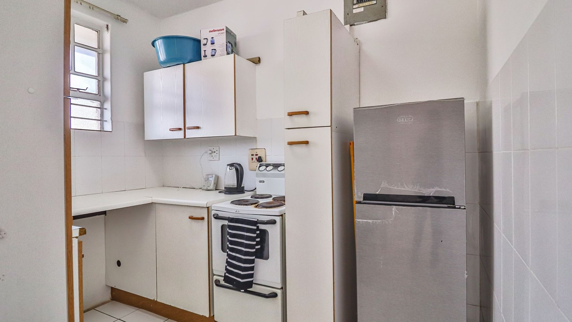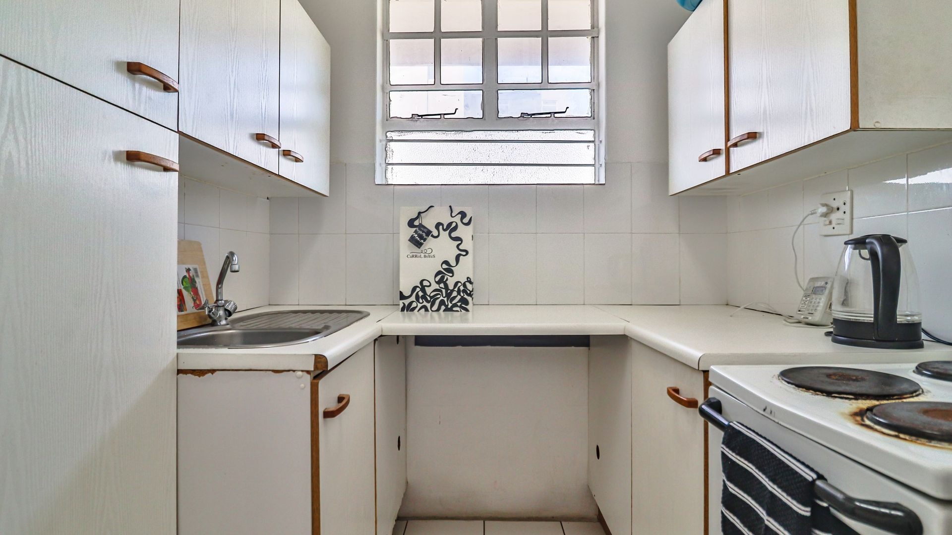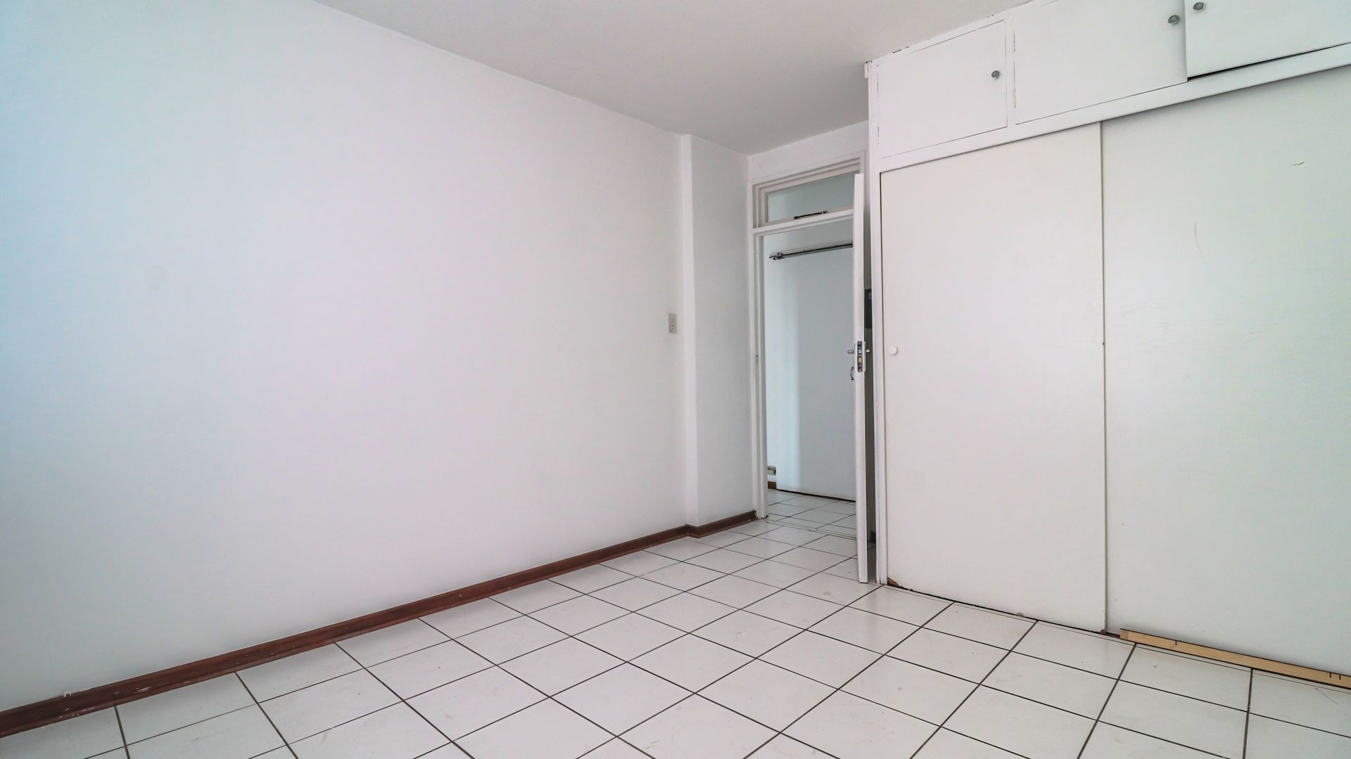 The apartment features two well-sized bedrooms, with the main bedroom fitted with built in cupboards, and a neat family bathroom. The fully fitted kitchen flows seamlessly into an open plan dining and lounge area, creating a spacious and inviting living environment. The unit is tiled throughout, ensuring easy maintenance and a clean, modern feel.