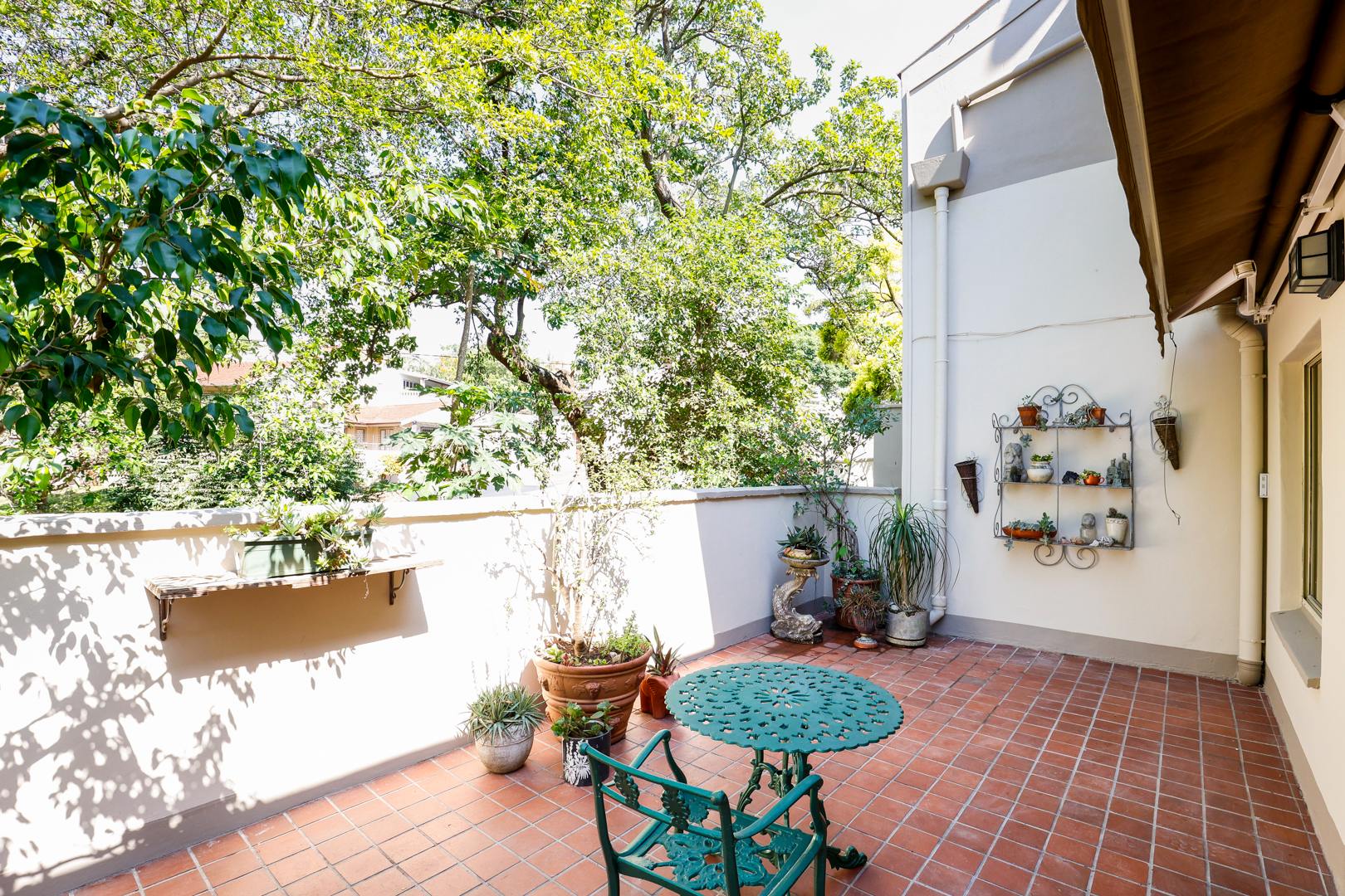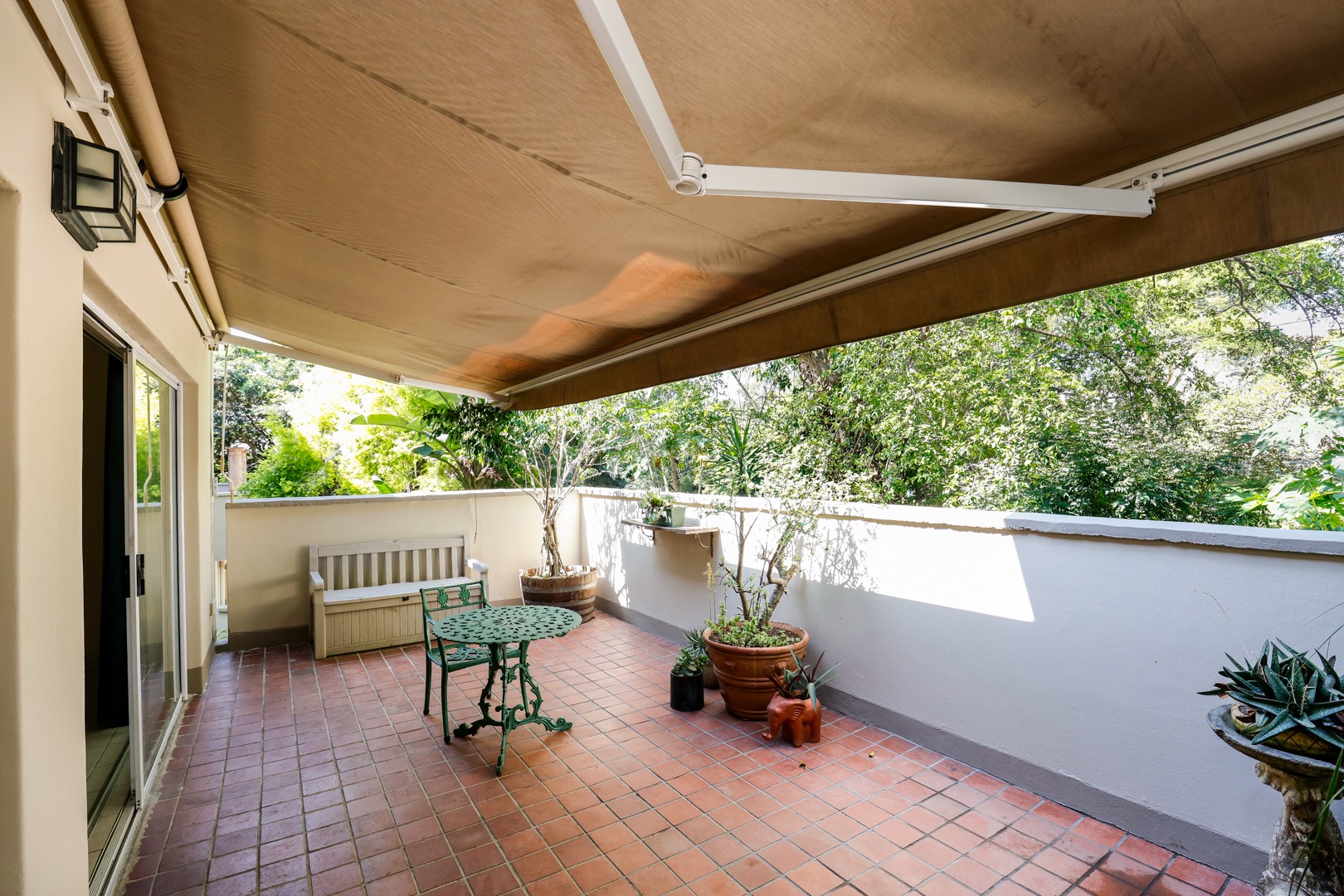 The open-plan lounge and dining room leads to a spacious balcony with a retractable awning overlooking the park.