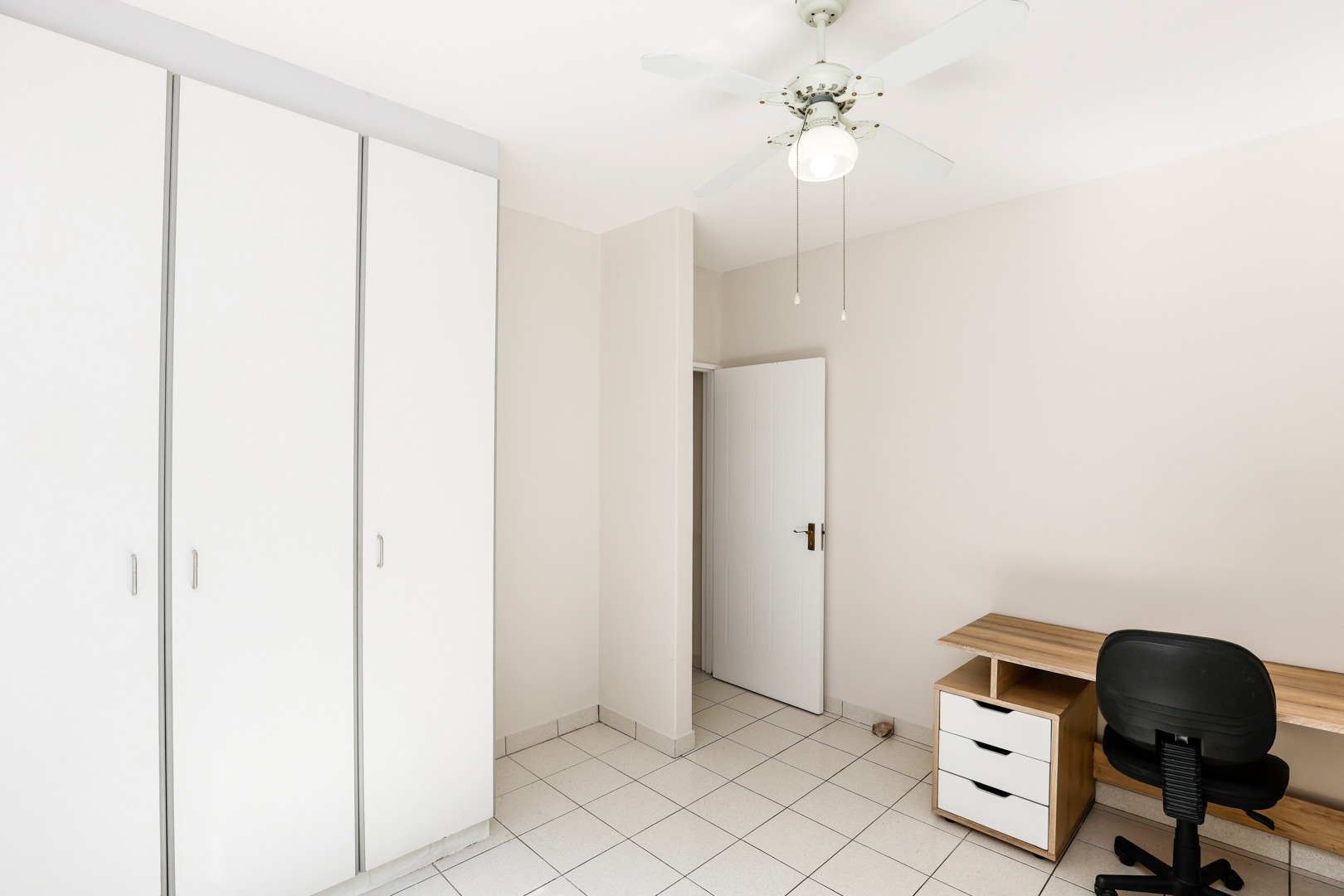 Bedrooms 2 and 3 both have fans and built-in cupboards, and they share a family bathroom featuring a shower, basin, and toilet.