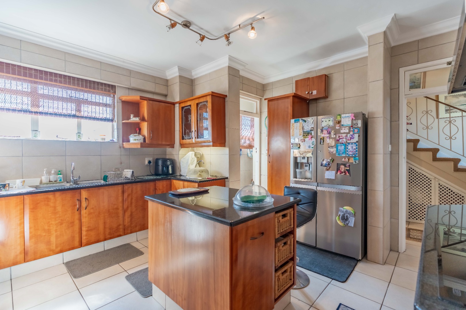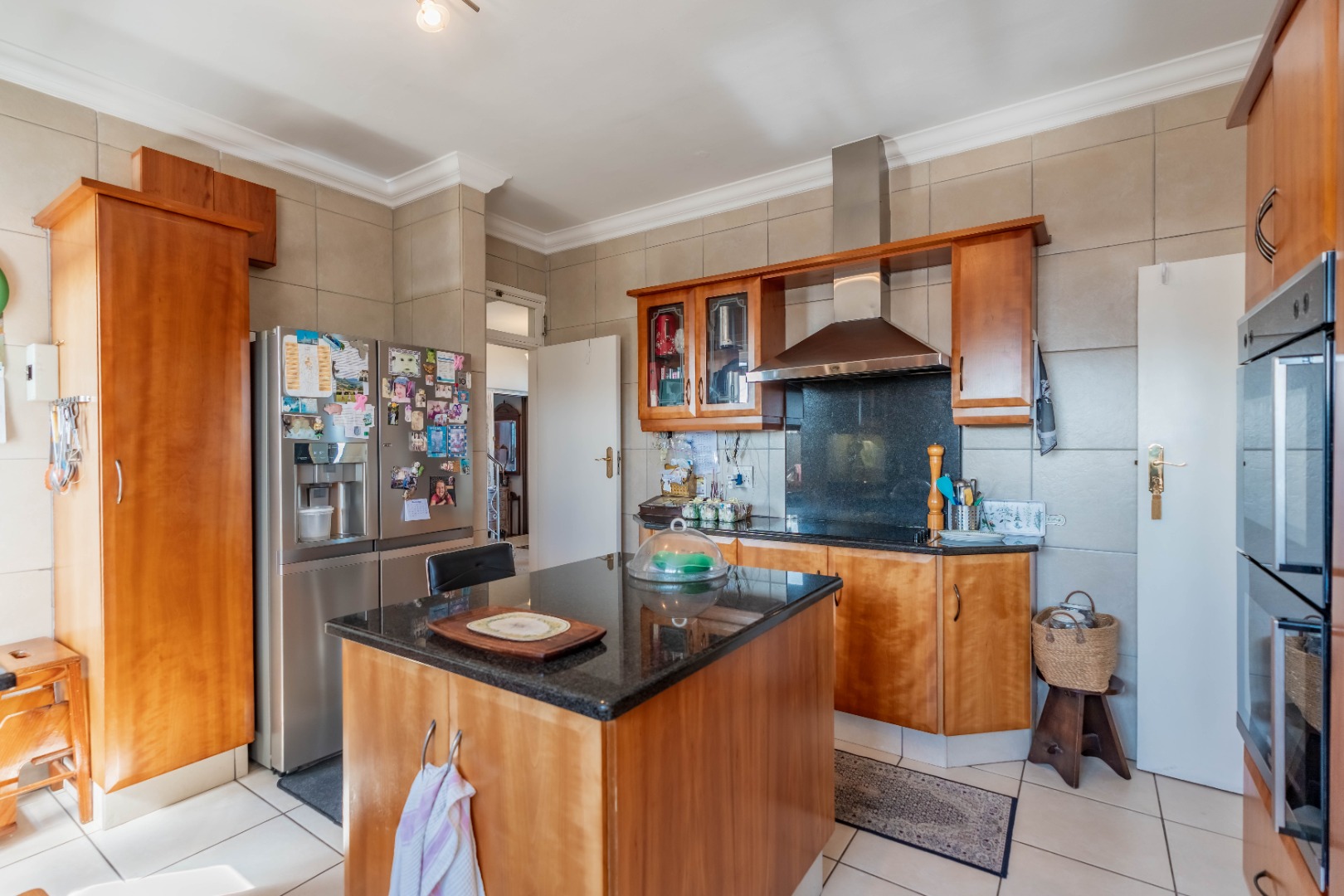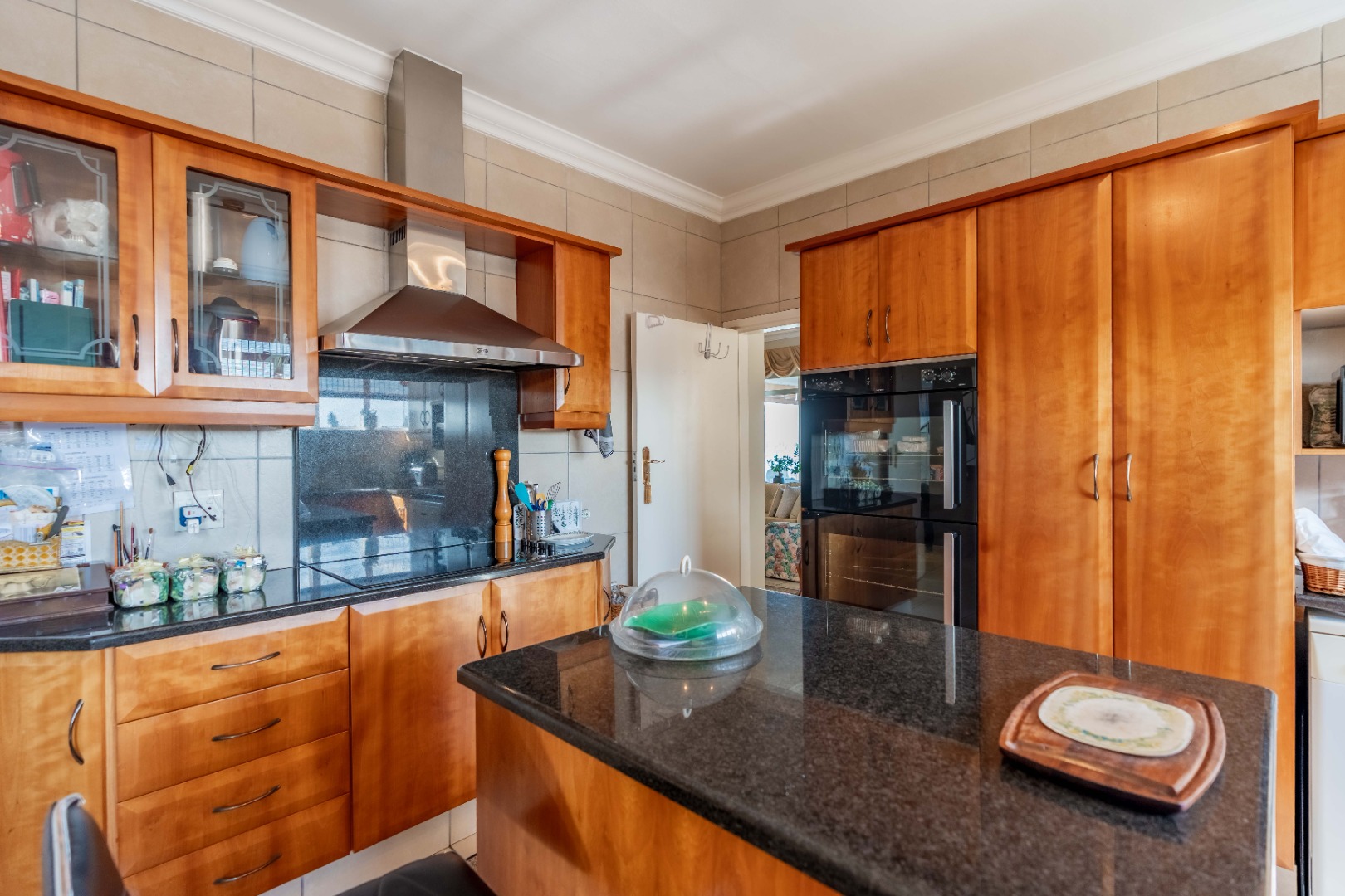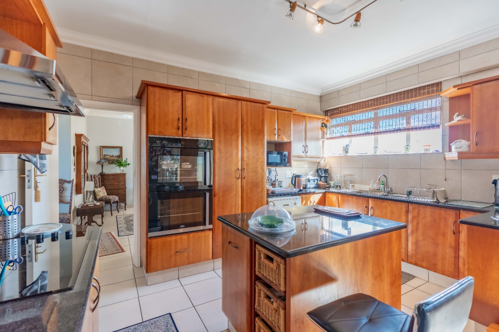 The well-appointed kitchen features granite countertops, ample built-in cupboards, an eye-level oven and hob. A separate laundry area is off the kitchen, which has access to the storeroom allocated to the unit.
