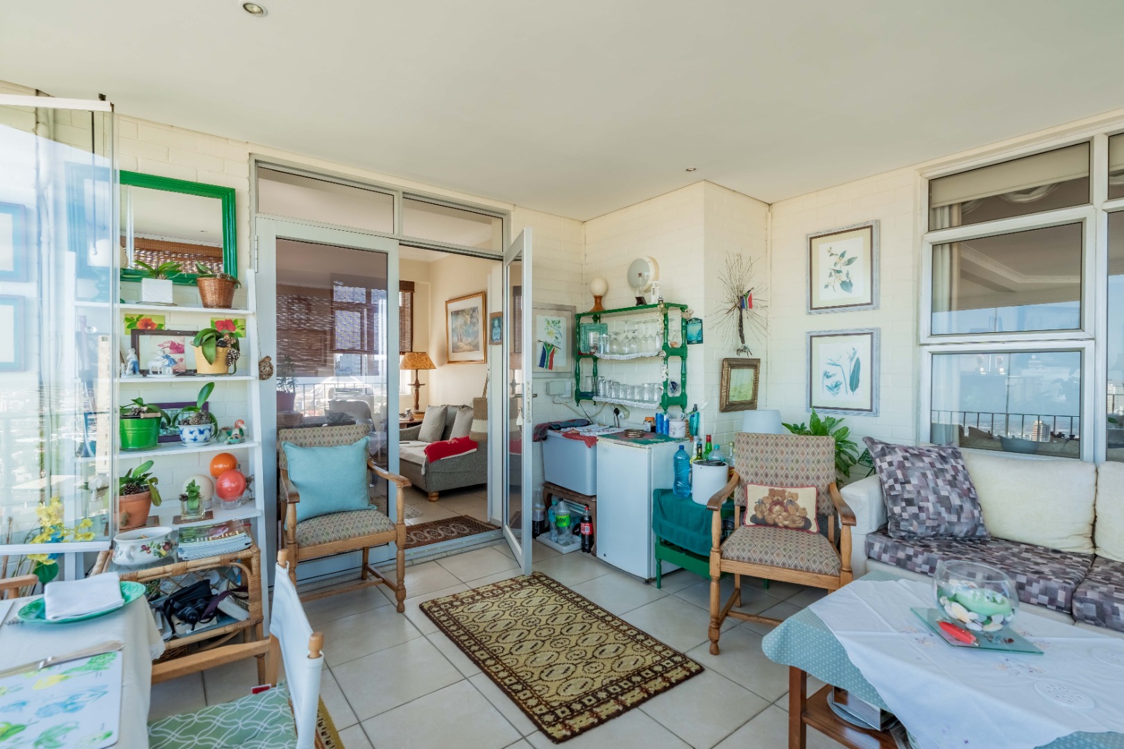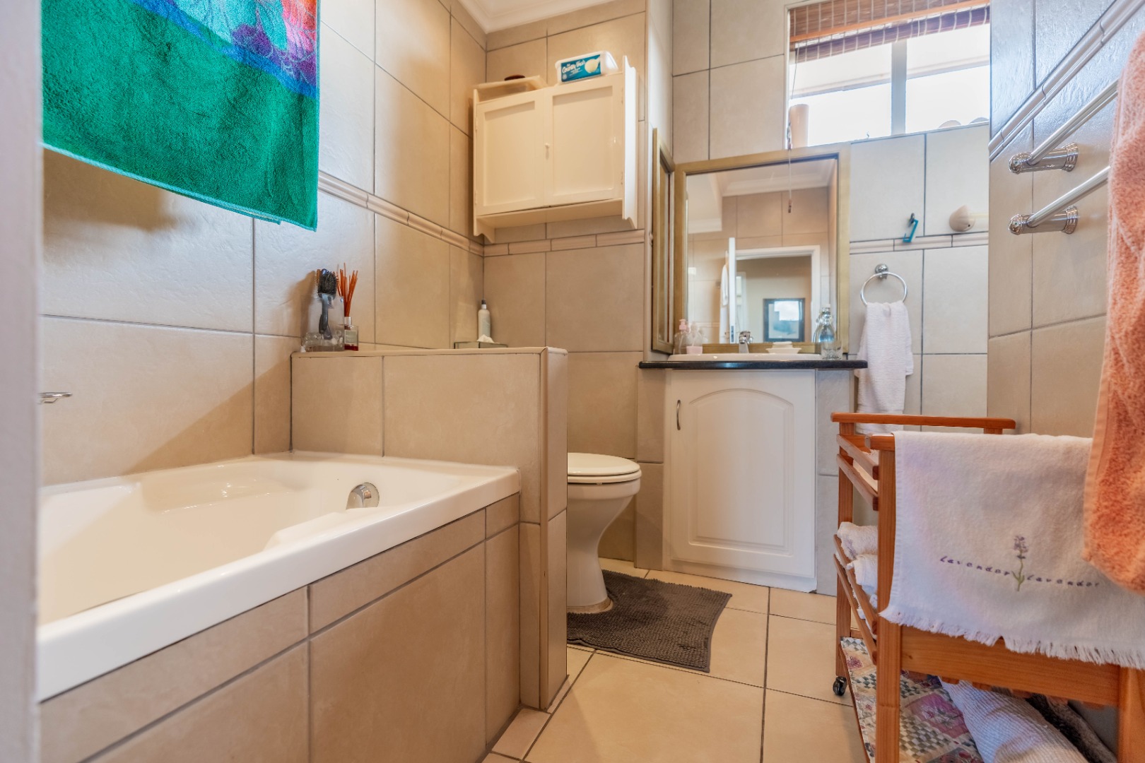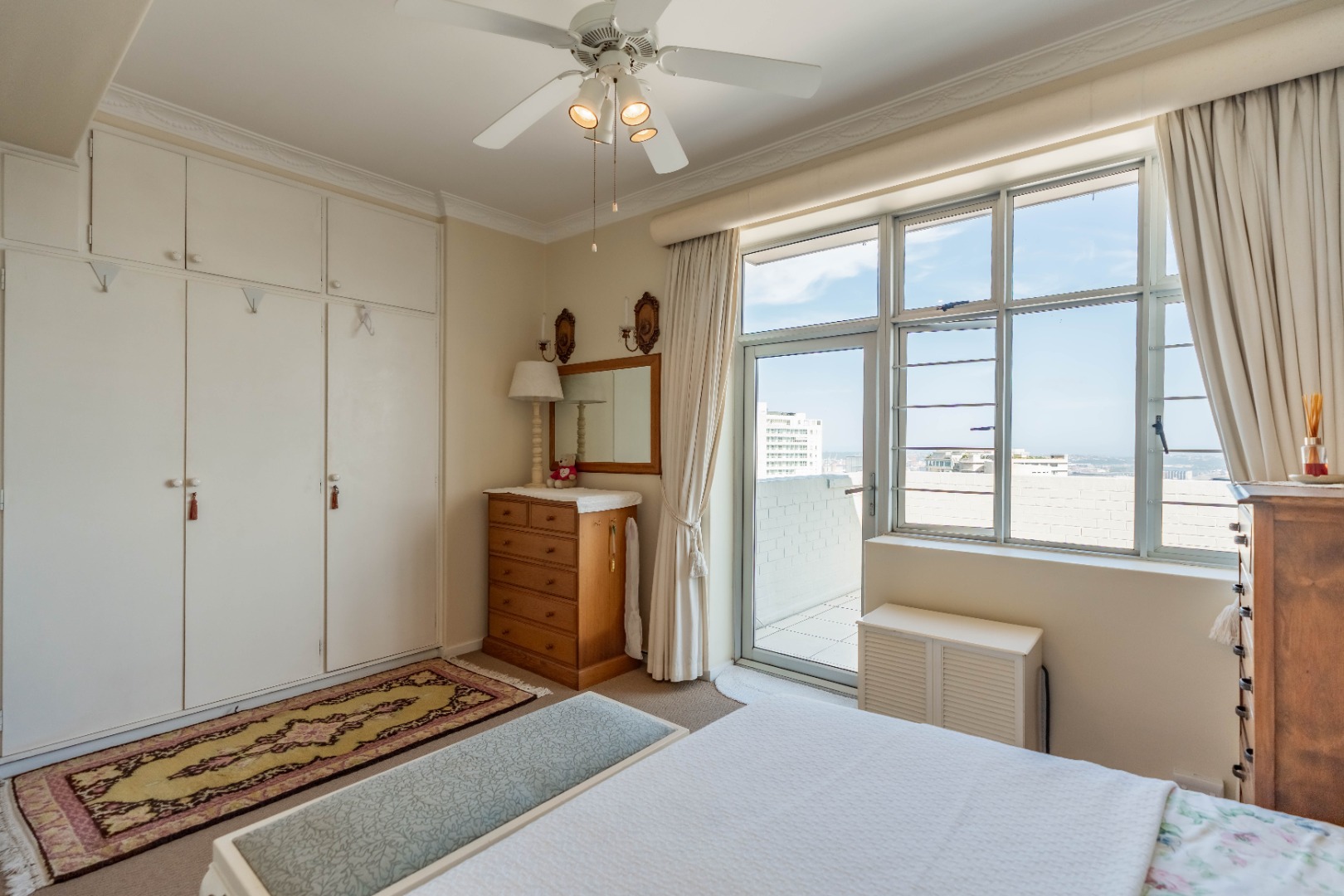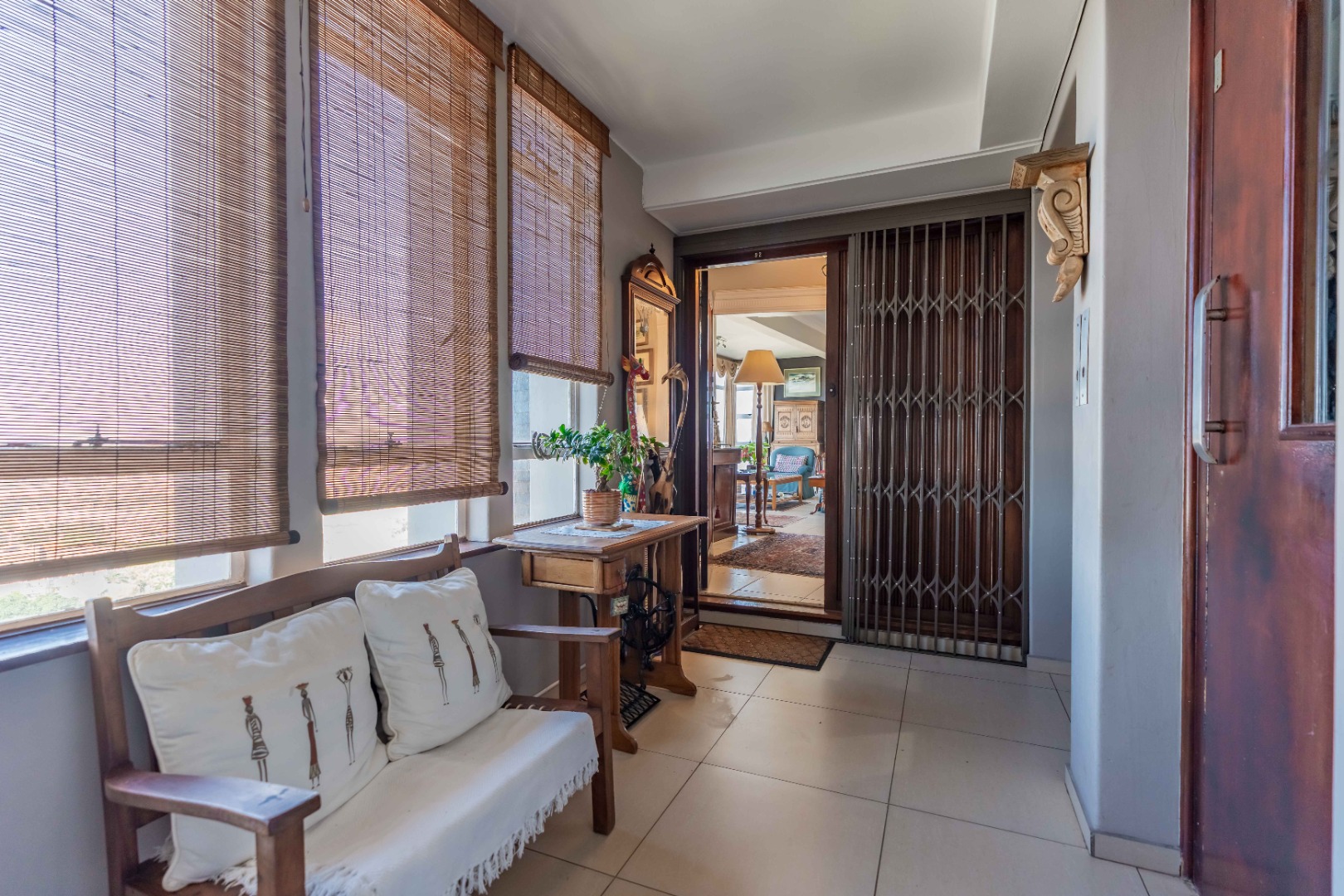 The well-appointed kitchen features granite countertops, ample built-in cupboards, an eye-level oven and hob. A separate laundry area is off the kitchen, which has access to the storeroom allocated to the unit.