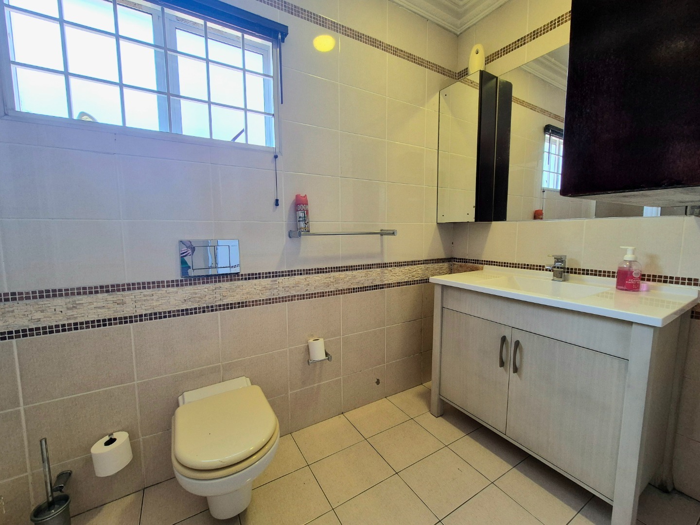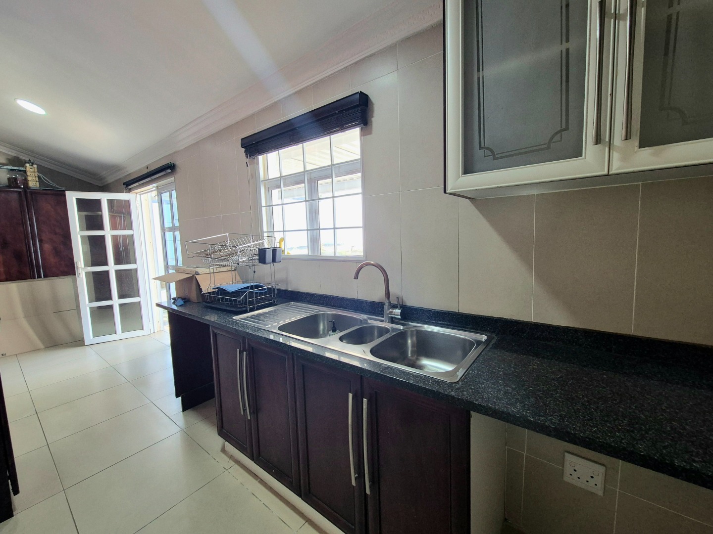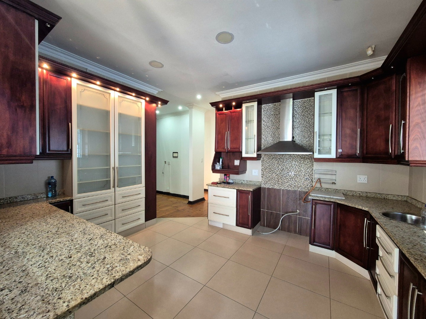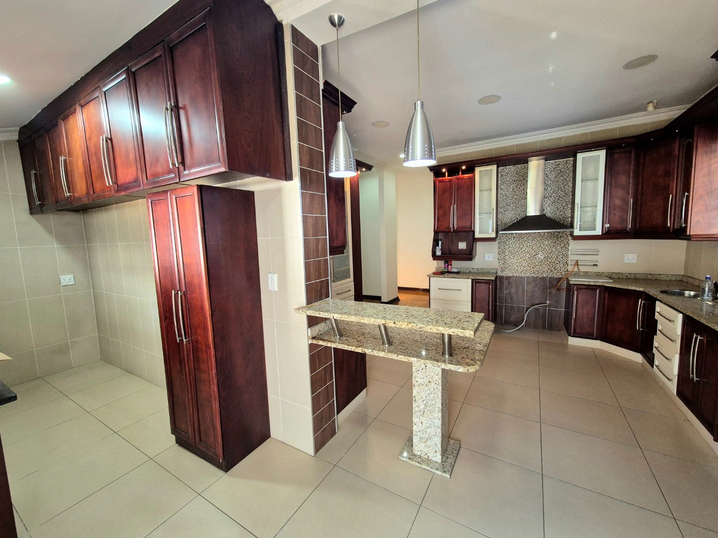 Exquisite kitchen and scullery area opens out onto a large paved undercover entertainment area. Lounge and dining room with wooden floors in excellent condition. Main bedroom en suite with beautiful laminate flooring and a walk-in closet. Large kitchen with granite tops, plenty of cupboard space, scullery and extractor. Upstairs loft with a fan can be utilised as a study or for storage. Air-conditioning and aluminium windows throughout the home. All three bedrooms en suites have plenty of cupboard space. Common bathroom for guests.