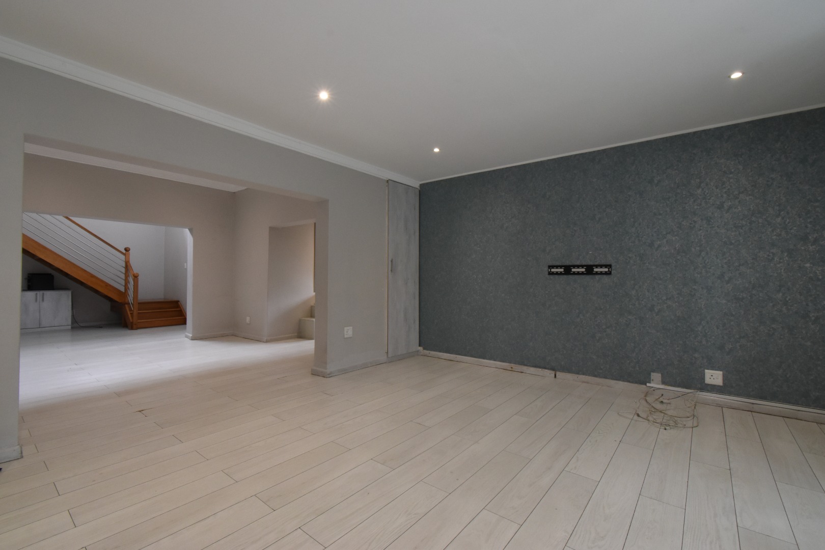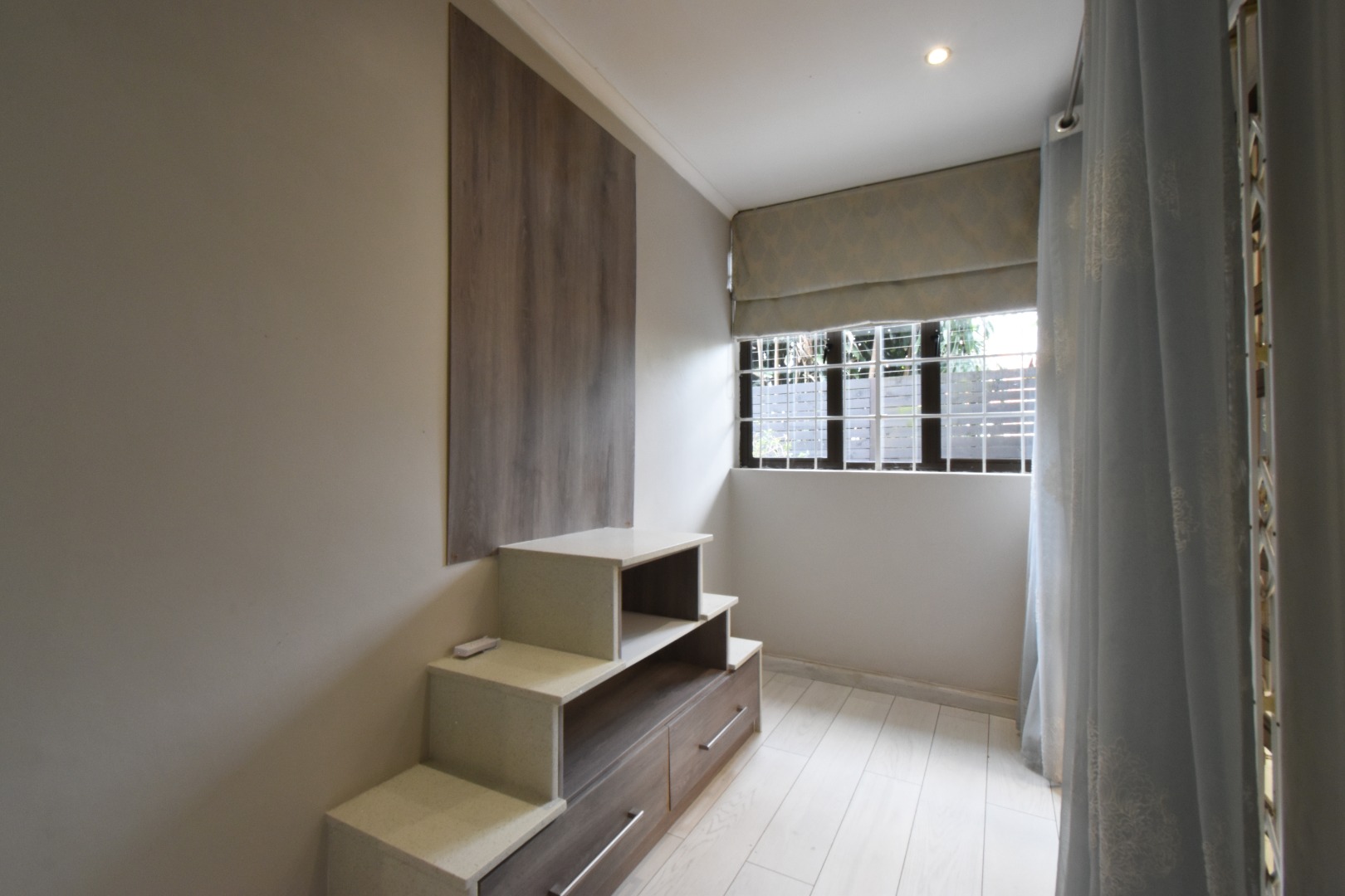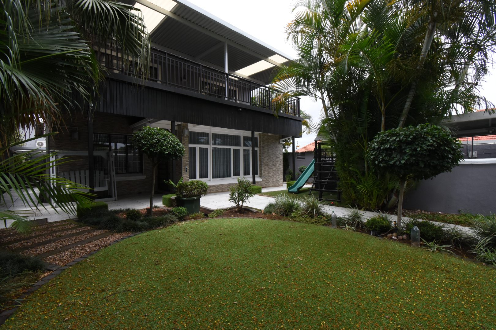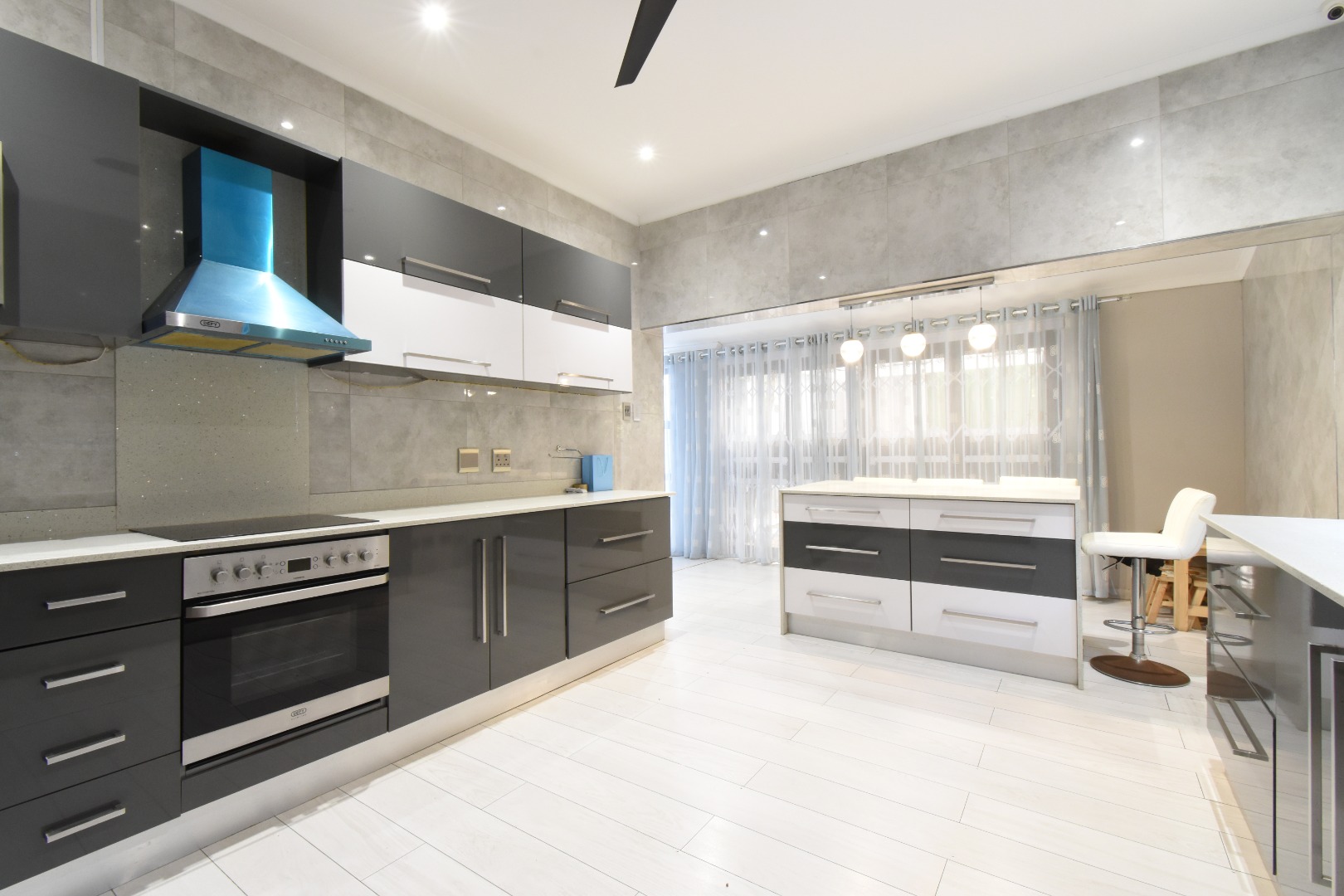 Discover a sophisticated modern home set in a quiet cul-de-sac in the sought-after Essenwood suburb of Durban. This striking double-storey residence features contemporary architecture with stone cladding, dark accents, and a statement balcony, surrounded by a beautifully maintained tropical garden with paved walkways and a children’s play area. Inside, spacious open-plan living areas are enhanced by light-toned flooring, recessed lighting, crown molding, and textured feature walls. A sleek wooden staircase leads to four luxurious bedrooms, two en suite, plus a full family bathroom and guest toilet. The home also offers three lounges, a dining area, a covered patio for outdoor entertaining, air conditioning, and two garages. Comprehensive security includes electric fencing, CCTV, an alarm system, 24-hour security, and controlled access, ensuring stylish, secure, and comfortable living in a prime location.