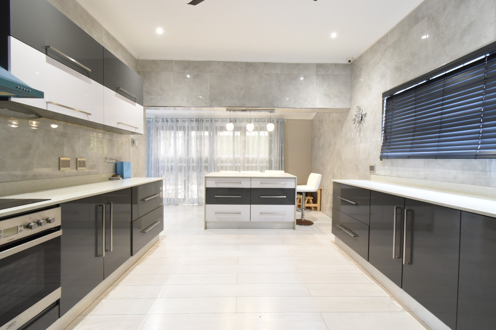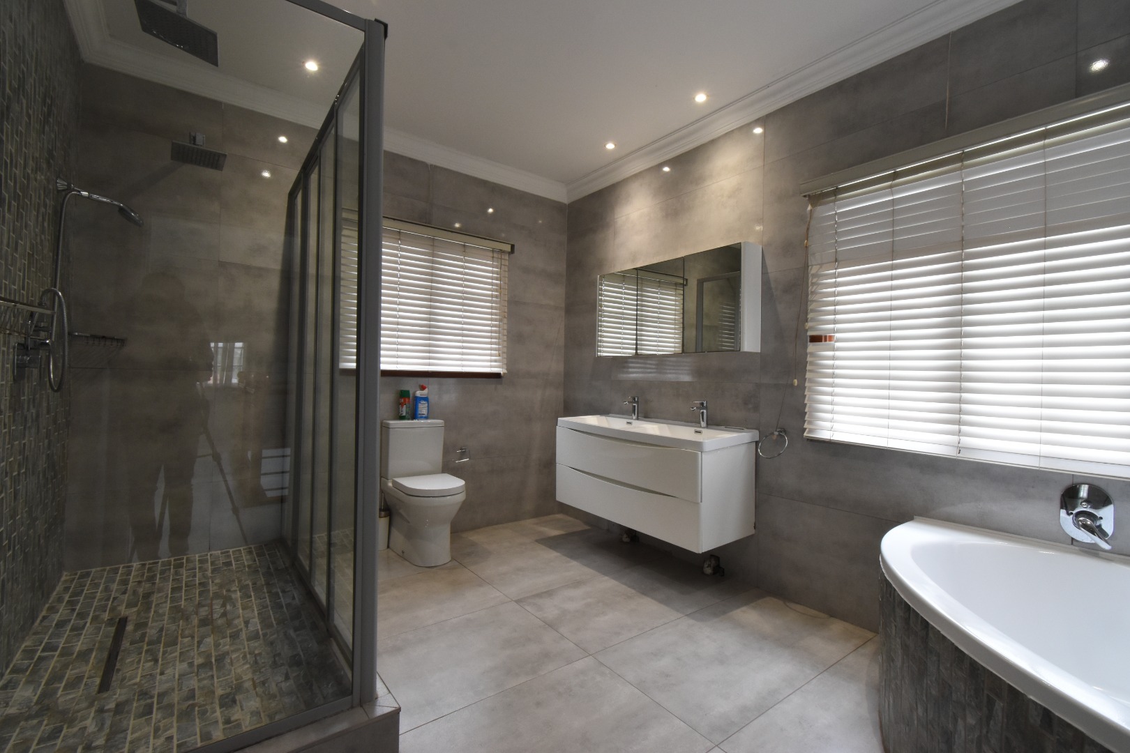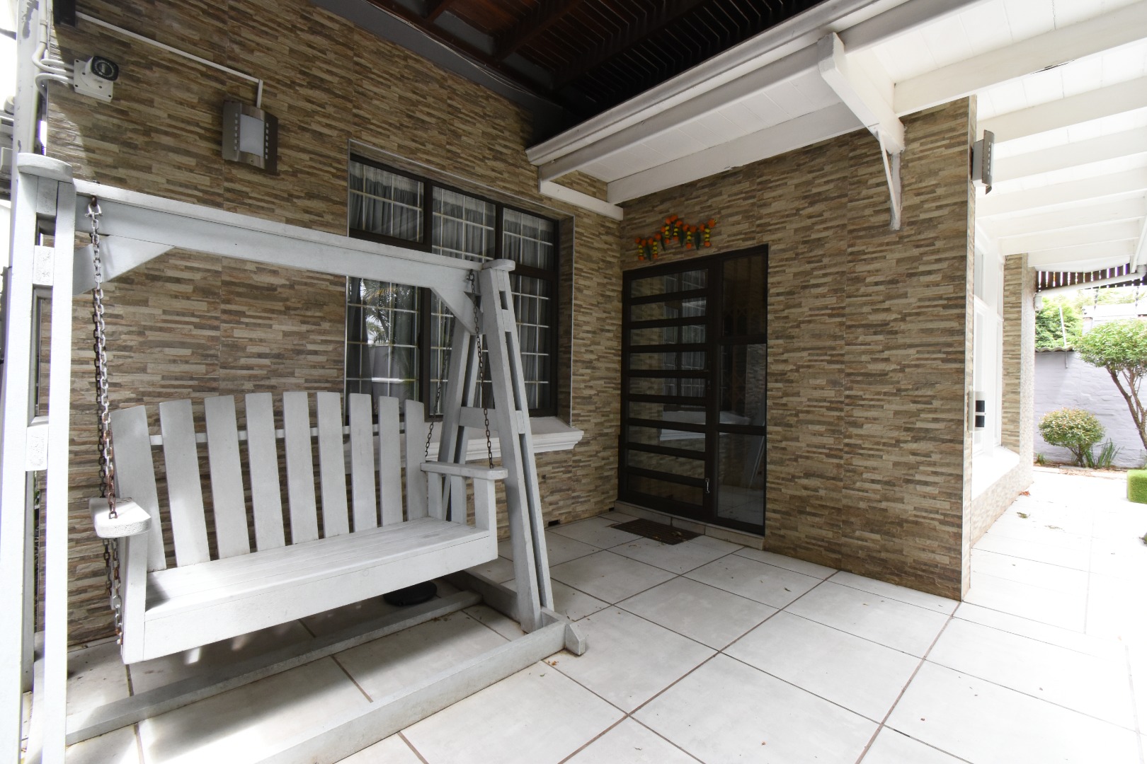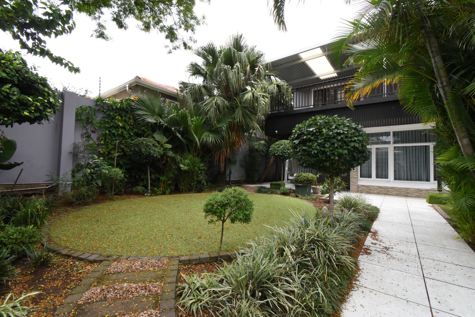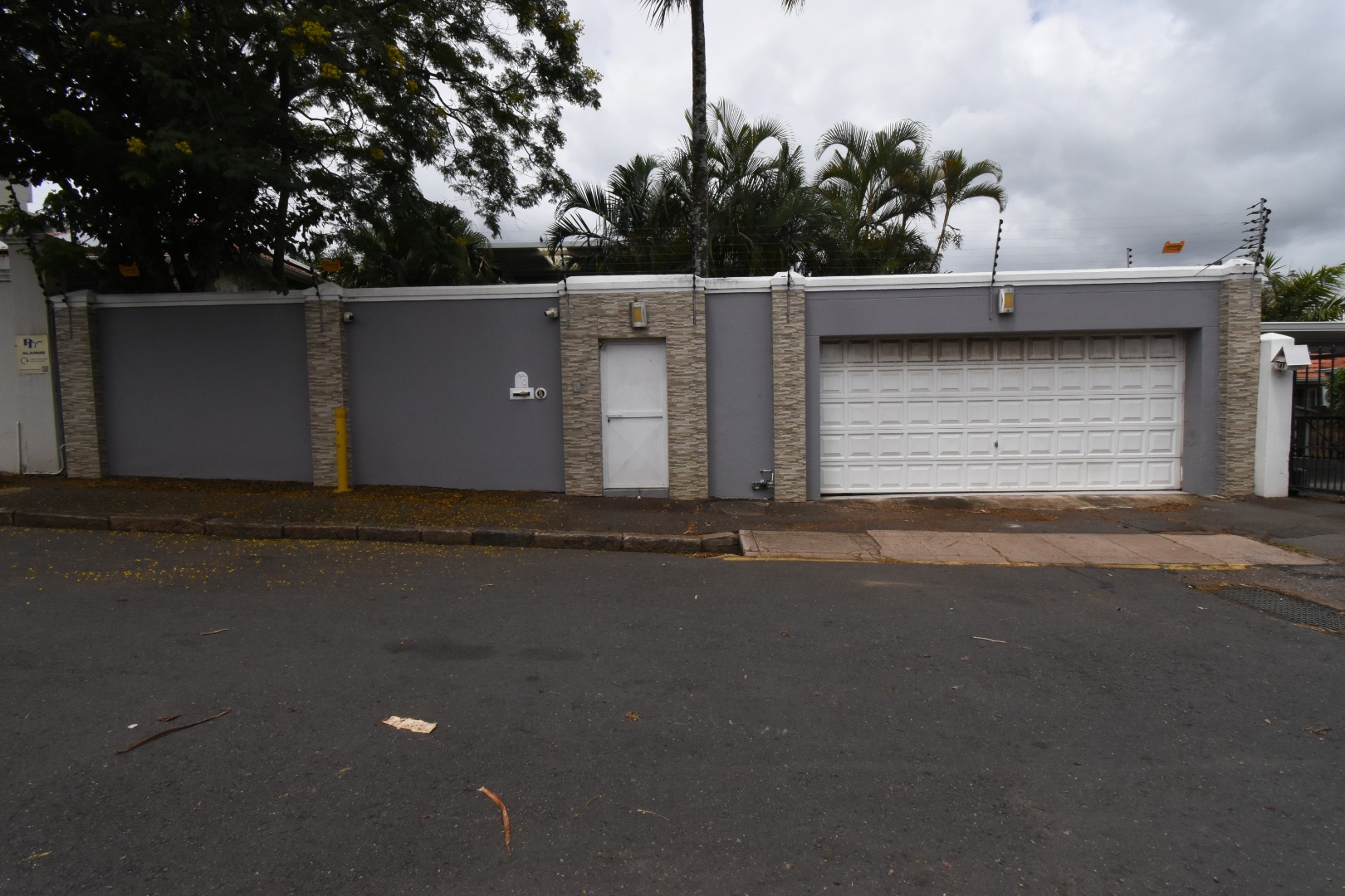 Discover a sophisticated modern home set in a quiet cul-de-sac in the sought-after Essenwood suburb of Durban. This striking double-storey residence features contemporary architecture with stone cladding, dark accents, and a statement balcony, surrounded by a beautifully maintained tropical garden with paved walkways and a children’s play area. Inside, spacious open-plan living areas are enhanced by light-toned flooring, recessed lighting, crown molding, and textured feature walls. A sleek wooden staircase leads to four luxurious bedrooms, two en suite, plus a full family bathroom and guest toilet. The home also offers three lounges, a dining area, a covered patio for outdoor entertaining, air conditioning, and two garages. Comprehensive security includes electric fencing, CCTV, an alarm system, 24-hour security, and controlled access, ensuring stylish, secure, and comfortable living in a prime location.