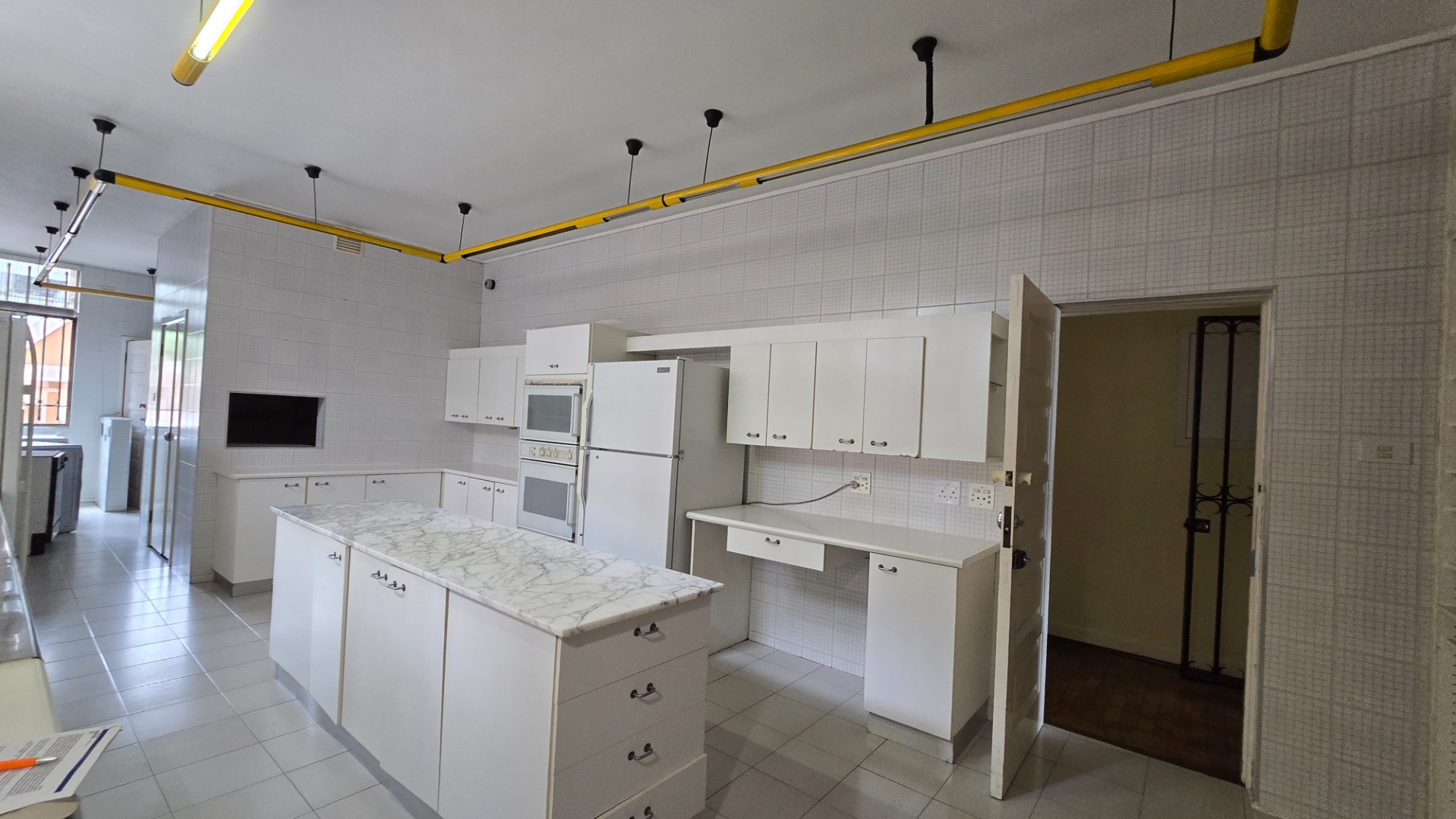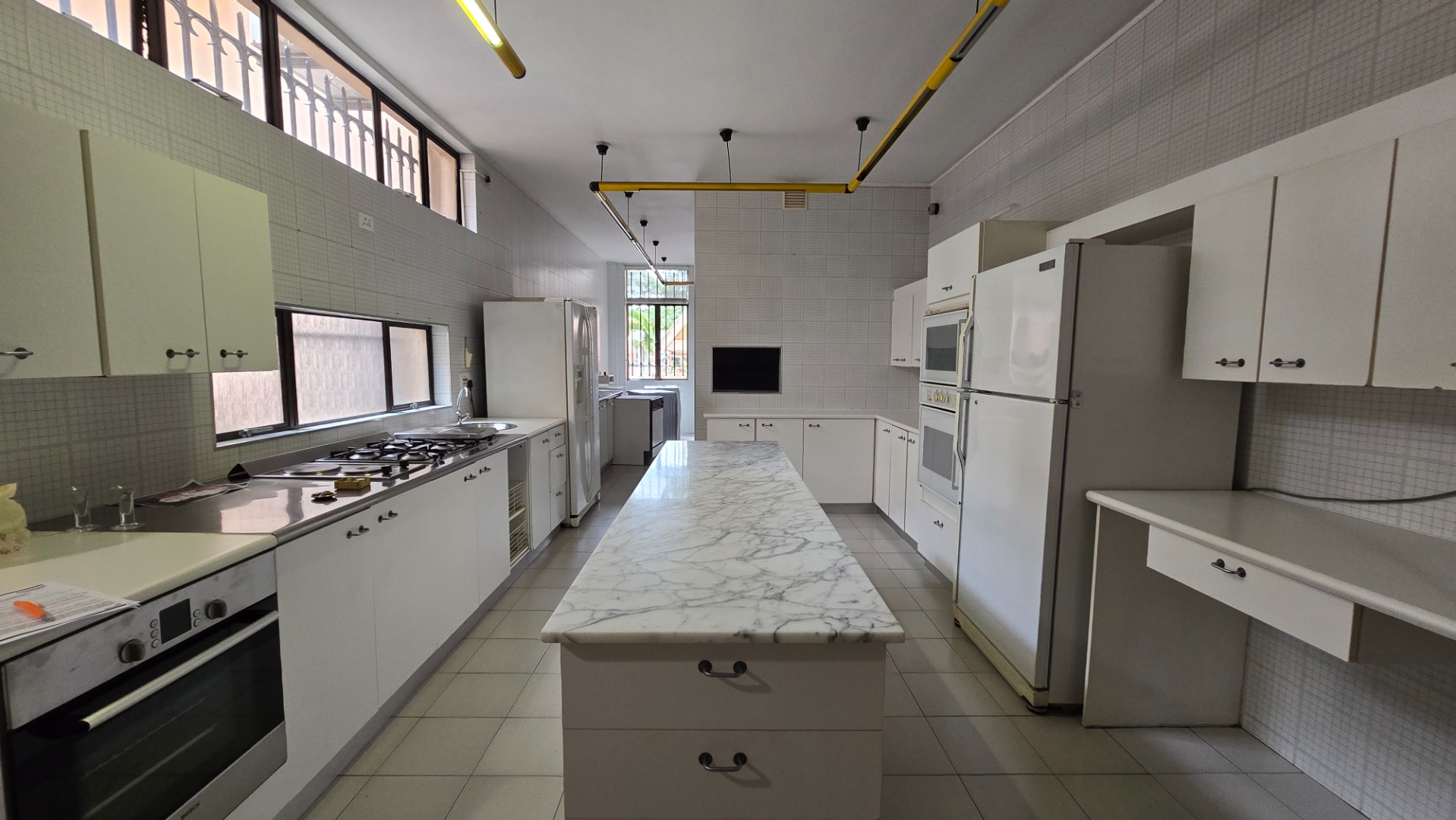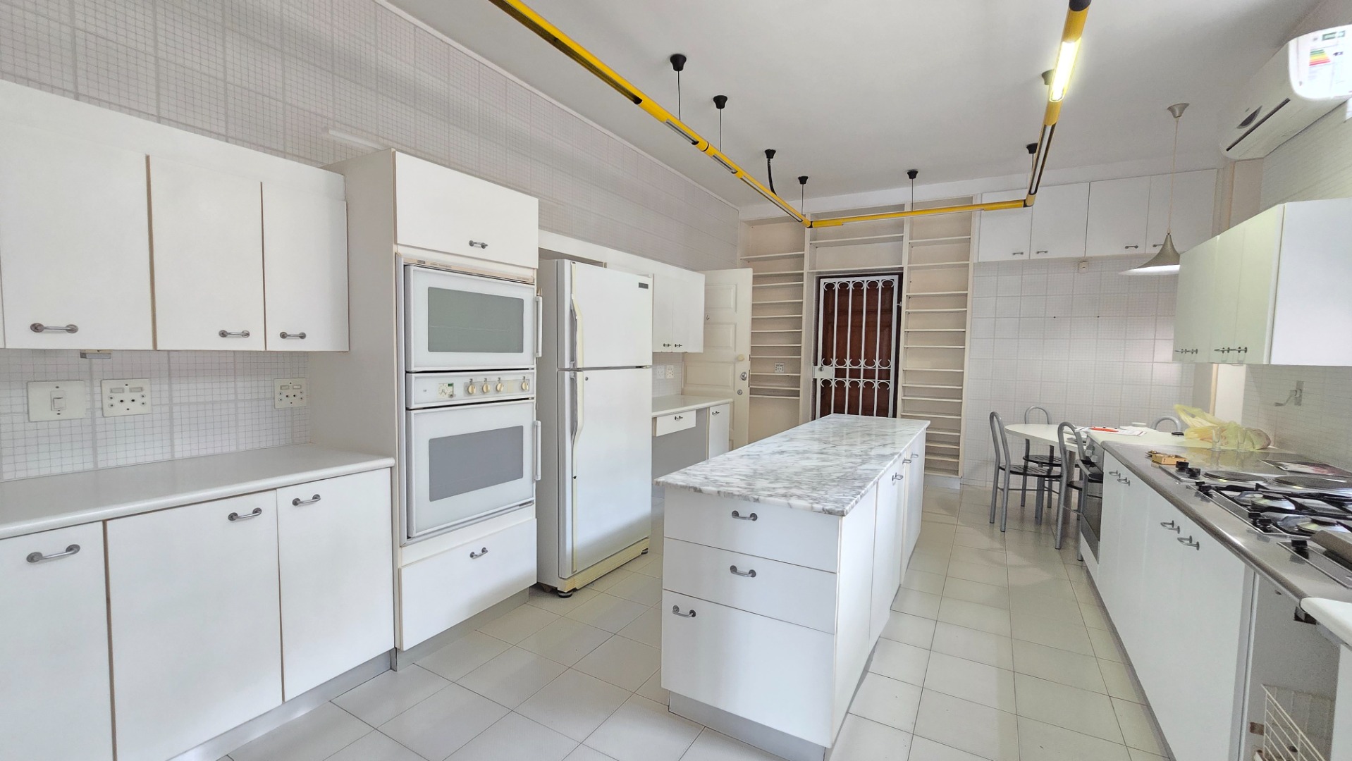 The kitchen is dated and in desperate need of renovation but on the plus side it very spacious and can accommodate any kitchen appliance money can buy , with long counters on either side and a center island with breakfast nook , pantry and scullery with laundry make the kitchen ideal for any large family.
